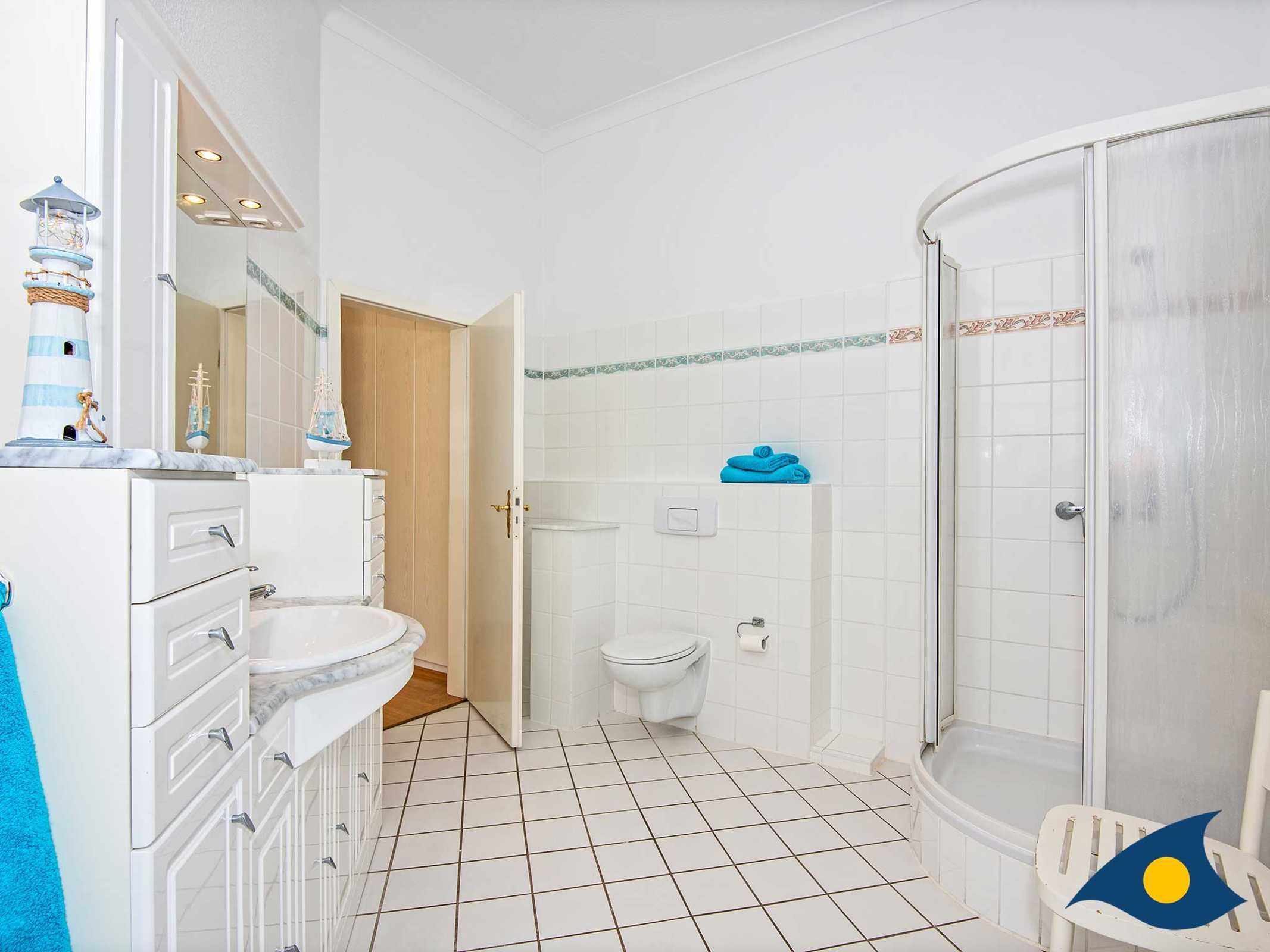 Das Tageslichtbad mit WC und Dusche ist sehr großzügig geschnitten.