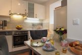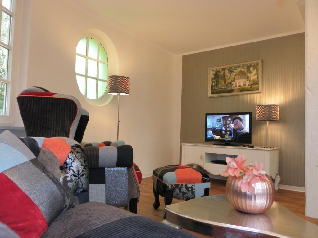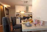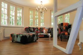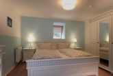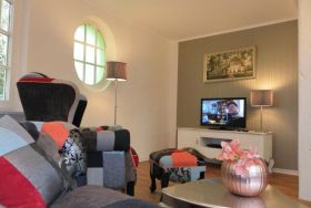 Die 2-Zimmer Ferienwohnung Seepferdchen befindet sich im 1. Obergeschoss der Villa Muschel. Mit einer Wohnfläche von 45qm ist diese Wohneinheit perfekt für den Urlaub zu zweit. Im Wohn-Essbereich, mit einem Erkerfenster, lässt es sich auf dem stylishen Sofa und dem Lehnsessel wunderbar entspannen.