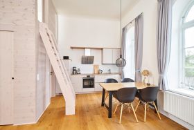 Die Ferienwohnung Herrenhaus IV im Obergeschoss mit Blick auf den Garten und den See bietet moderne Ausstattung kombiniert mit historischem Ambiente. Auf dem Schlafboden Hems fühlen sich nicht nur kleine Gäste außerordentlich wohl.