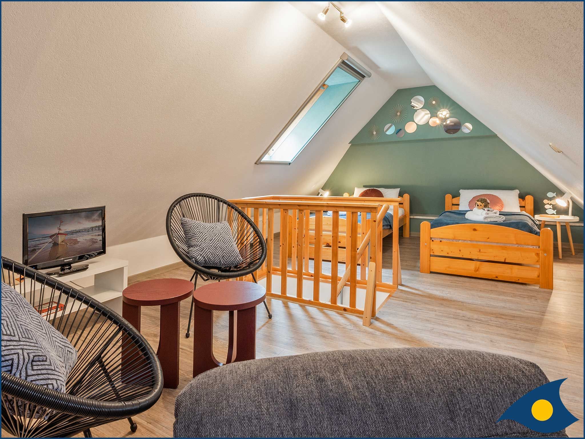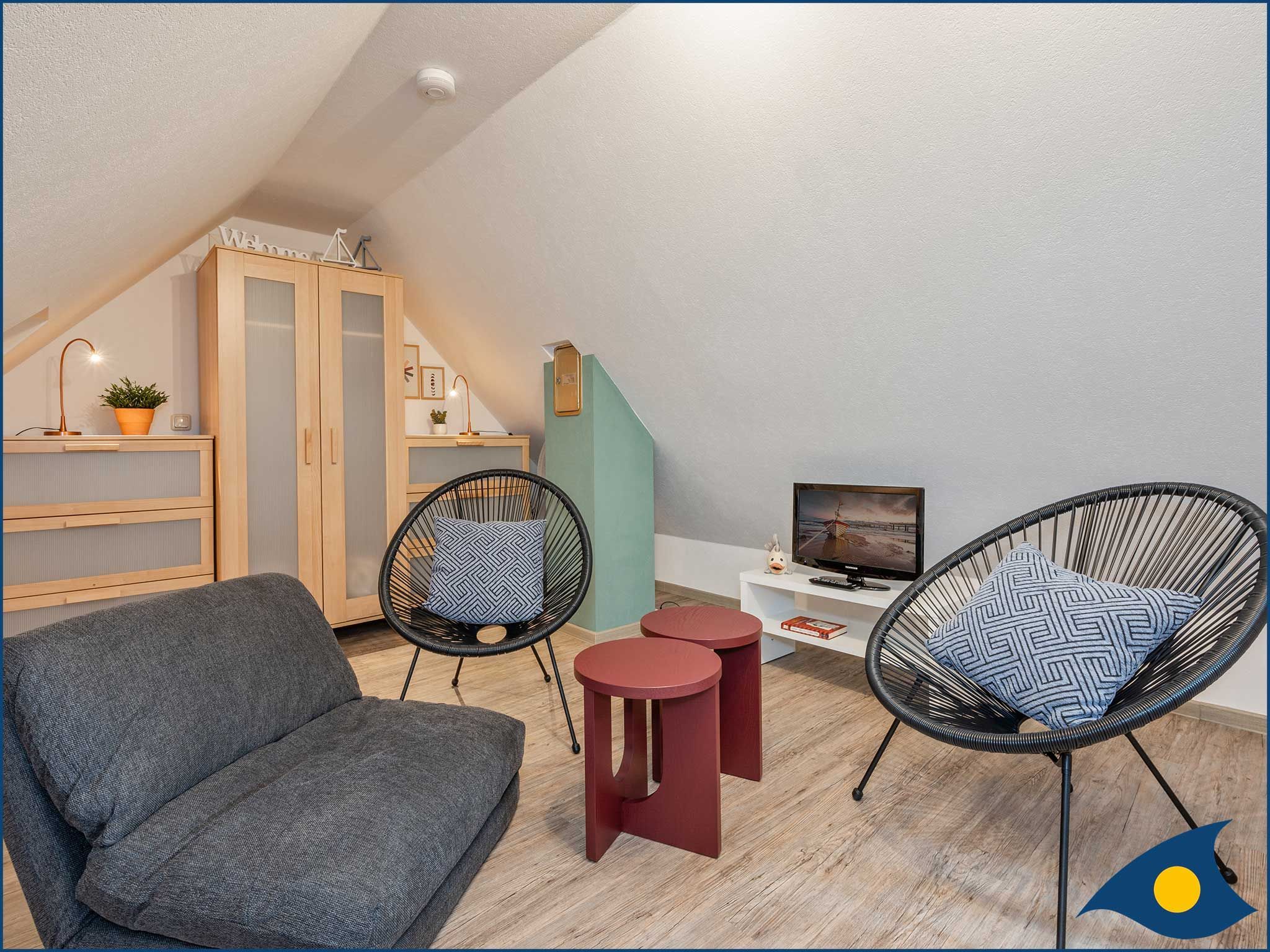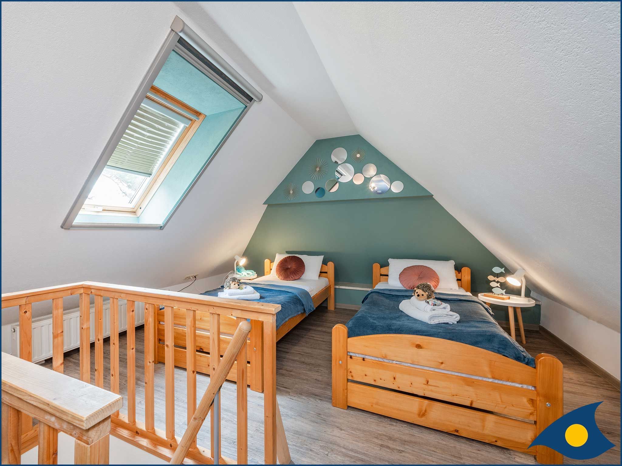Die Ferienwohnung HUGO bietet mit ihren ca. 65 qm Platz für 2 4 Personen im Obergeschoss rechts des FRÄULEIN LODDIN. Zwei Personen finden ihren Schlafplatz im gemütlichen, ausgebauten Spitzboden mit separater Sitzecke und Spielzimmer. Die Erstausstattung Bettwäsche und Handtücher sind inklusive.