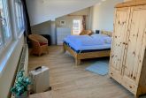 Über eine Holztreppe gelangt man in das im Dachgeschoss liegende Schlafzimmer. Hier steht ein bequemes Doppelbett (1,80 m breit) mit Nachttischen und Leselampen.