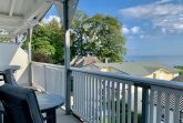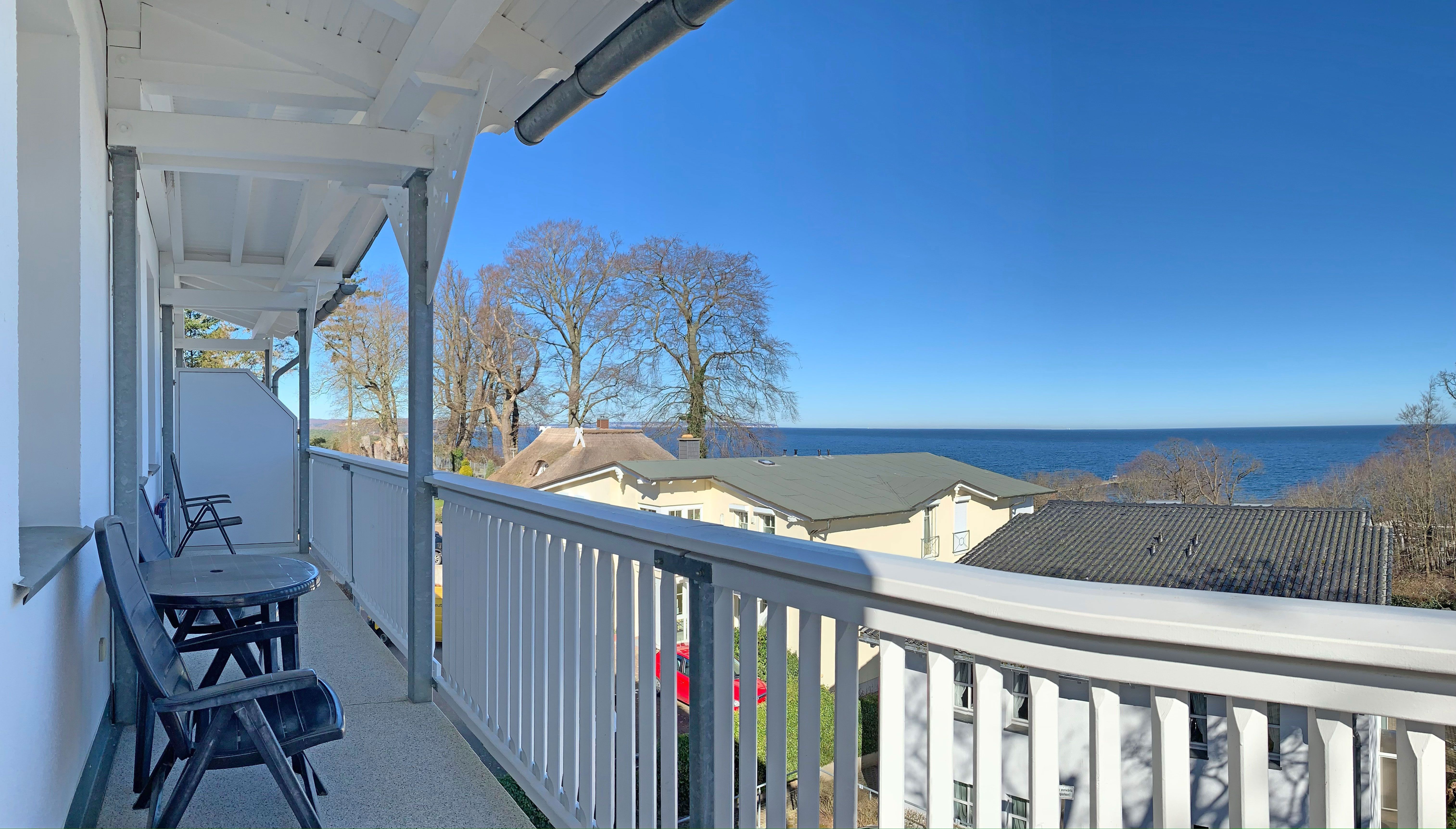 Der Balkon mit herrlichem Seeblick ist vom Wohnzimmer zu erreichen. Hier stehen auch Balkonmöbel für Sie zur Verfügung.