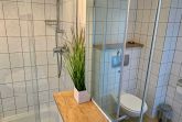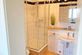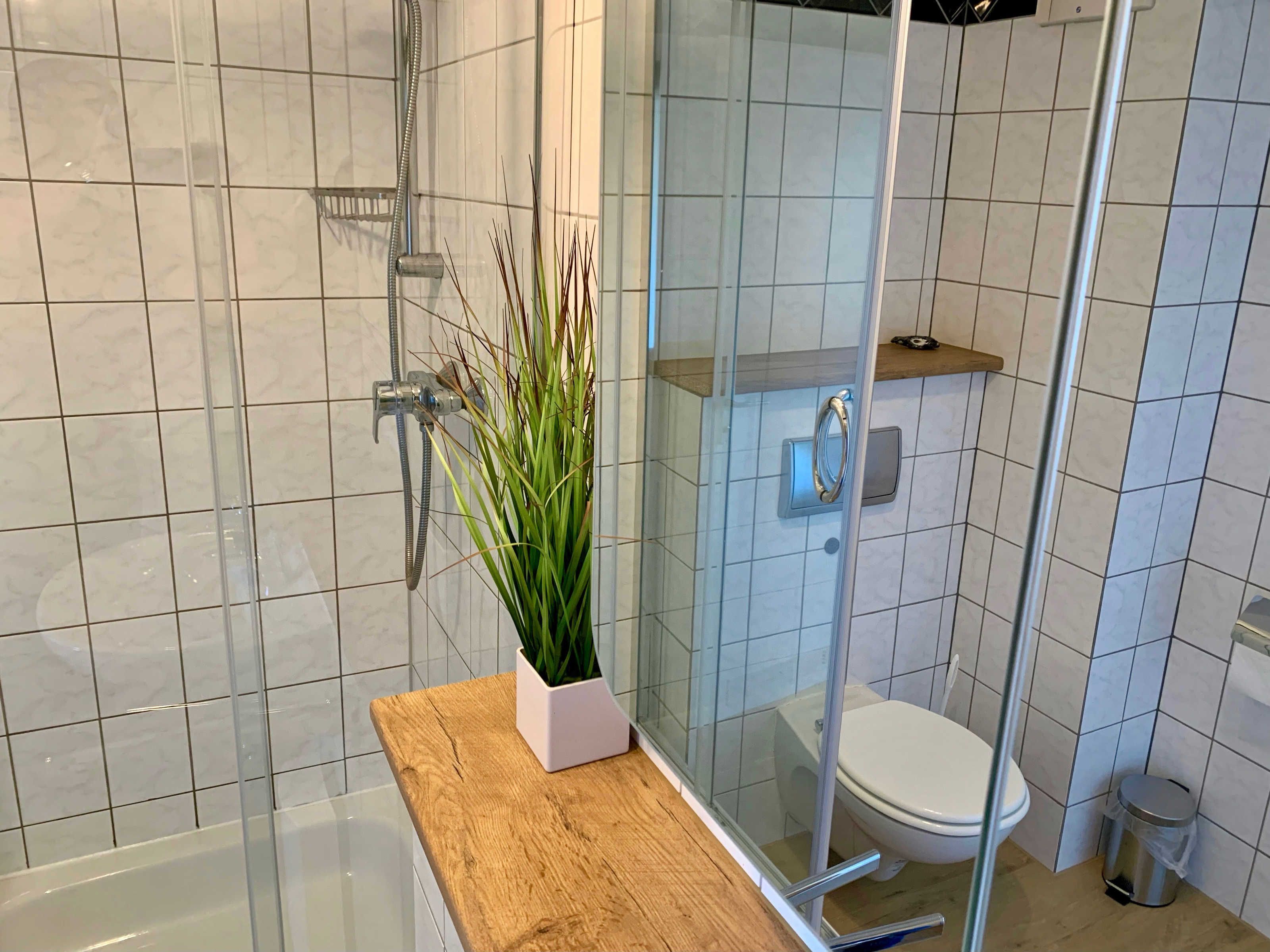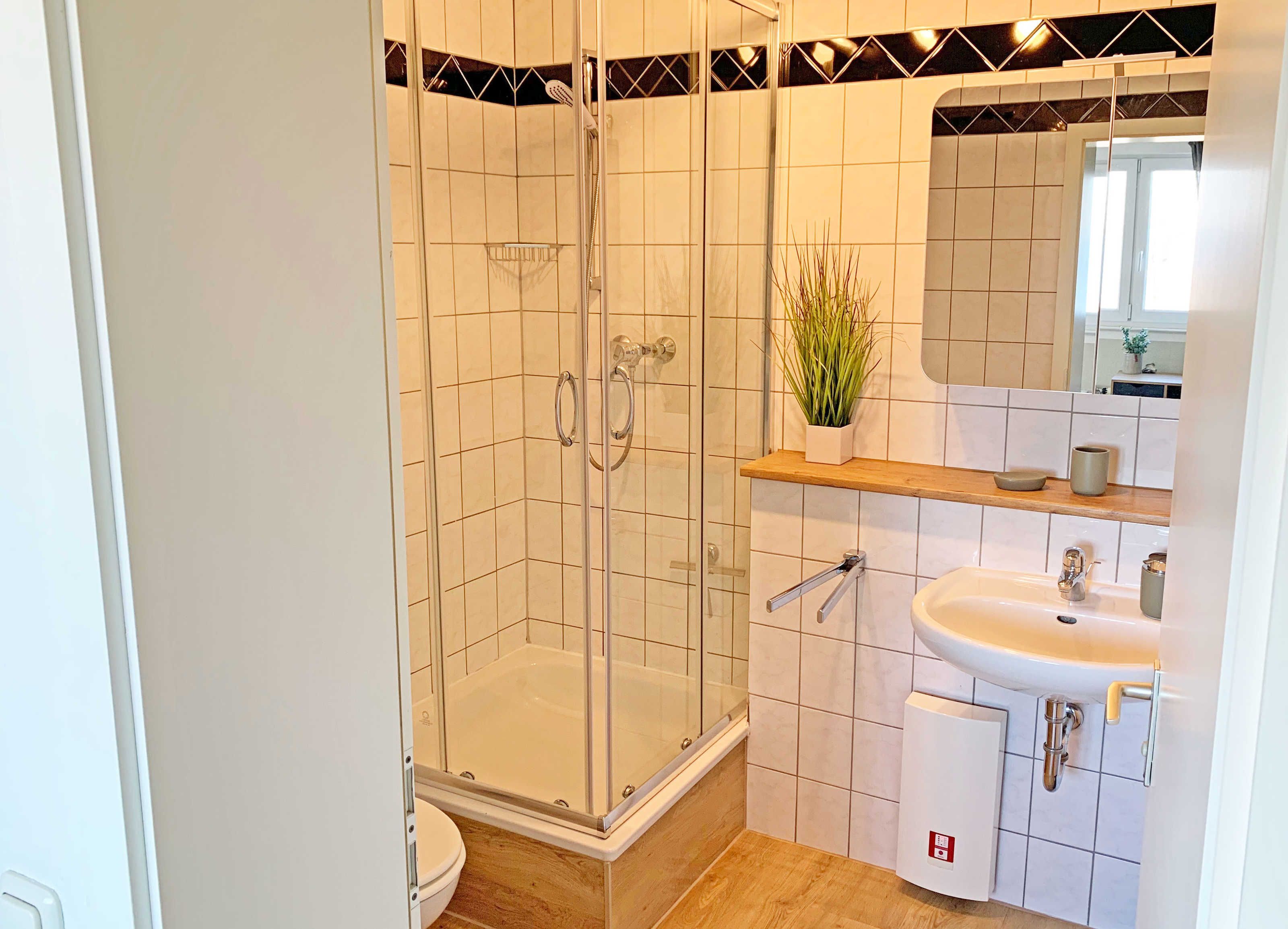 Das Bad ist mit Dusche, WC und Waschtisch ausgestattet.