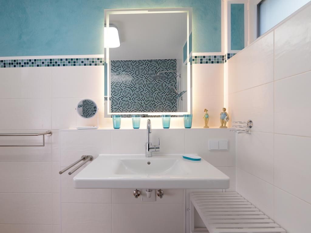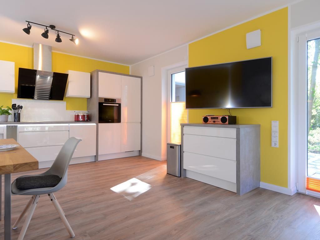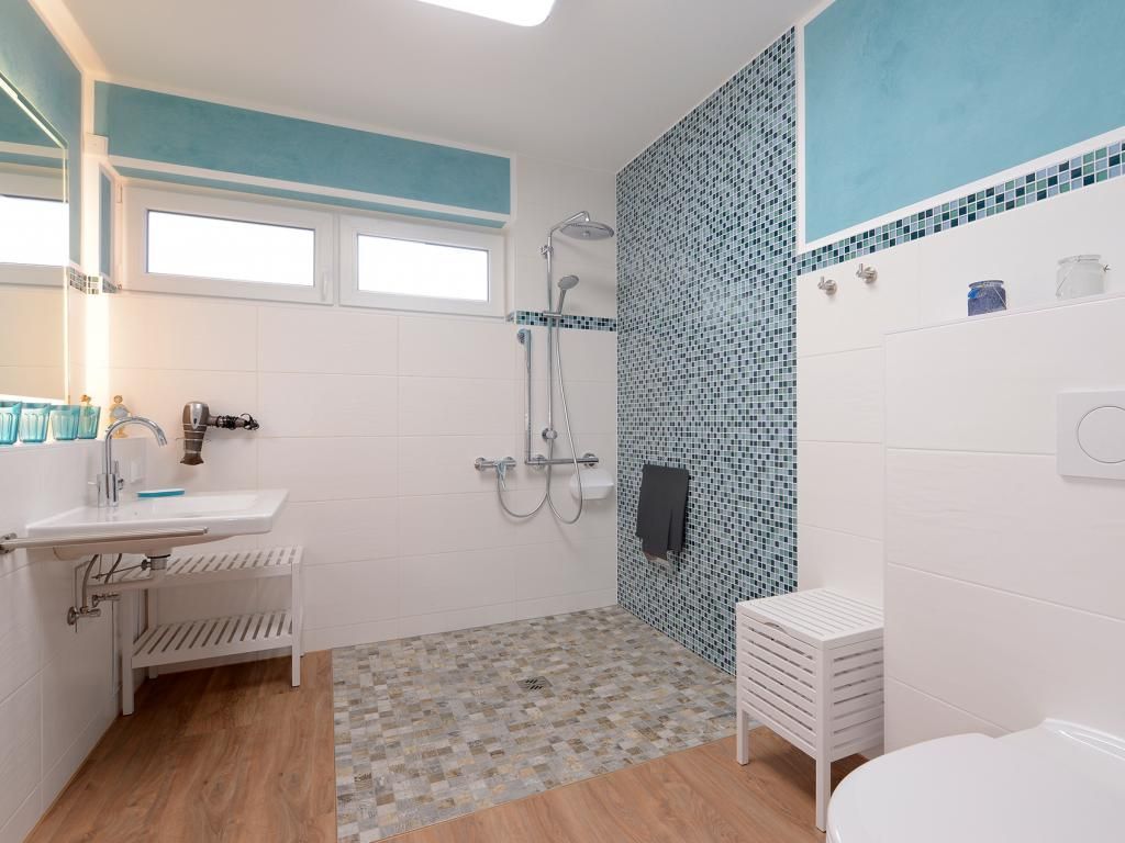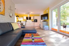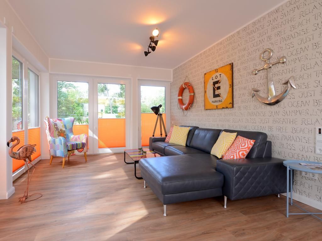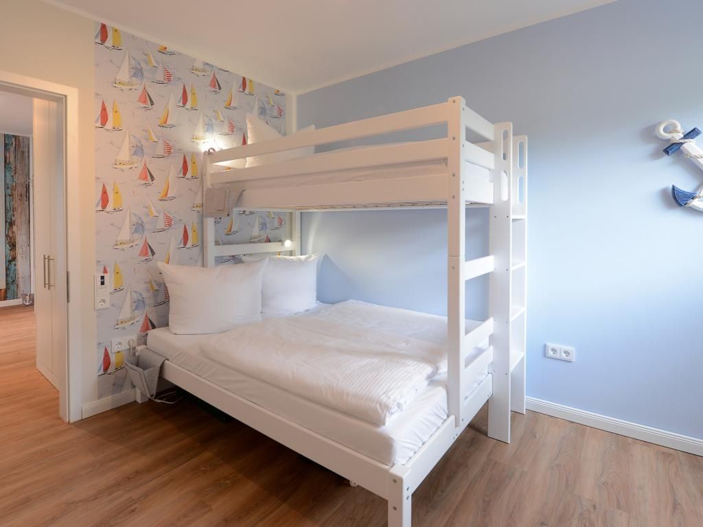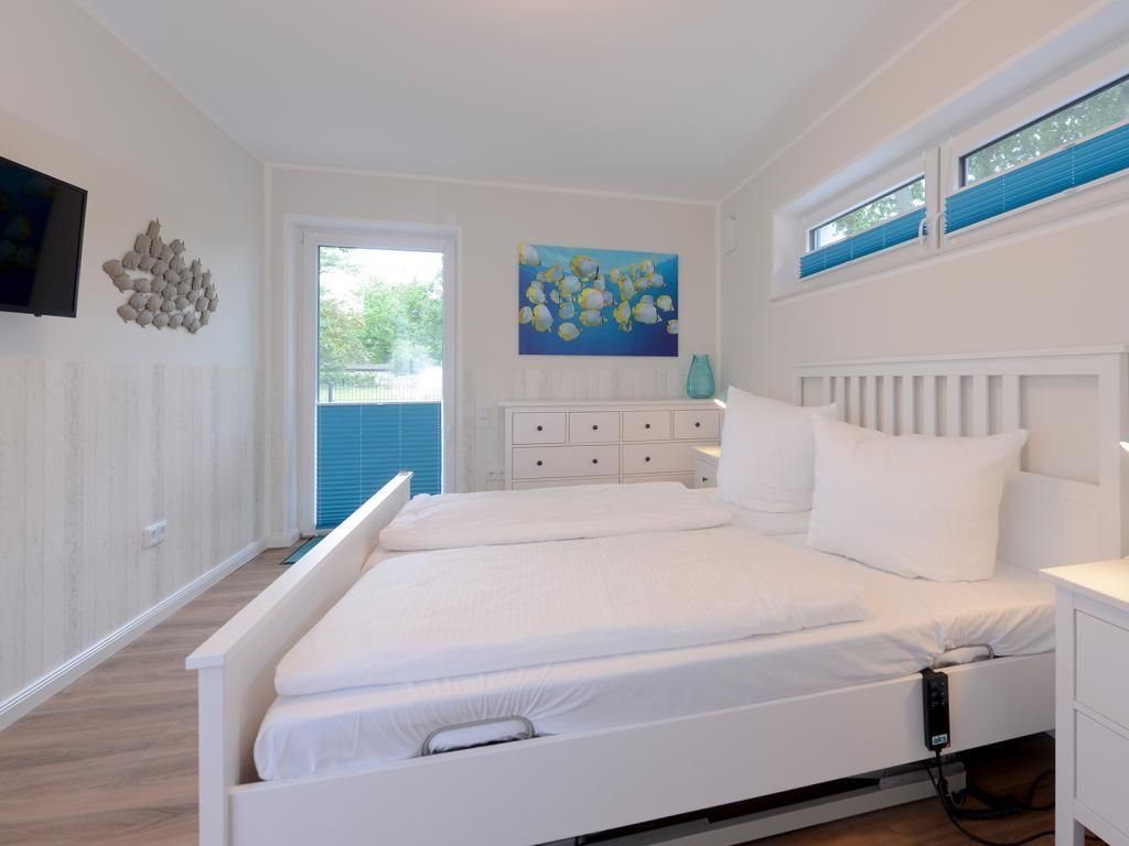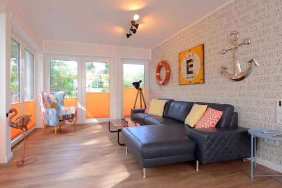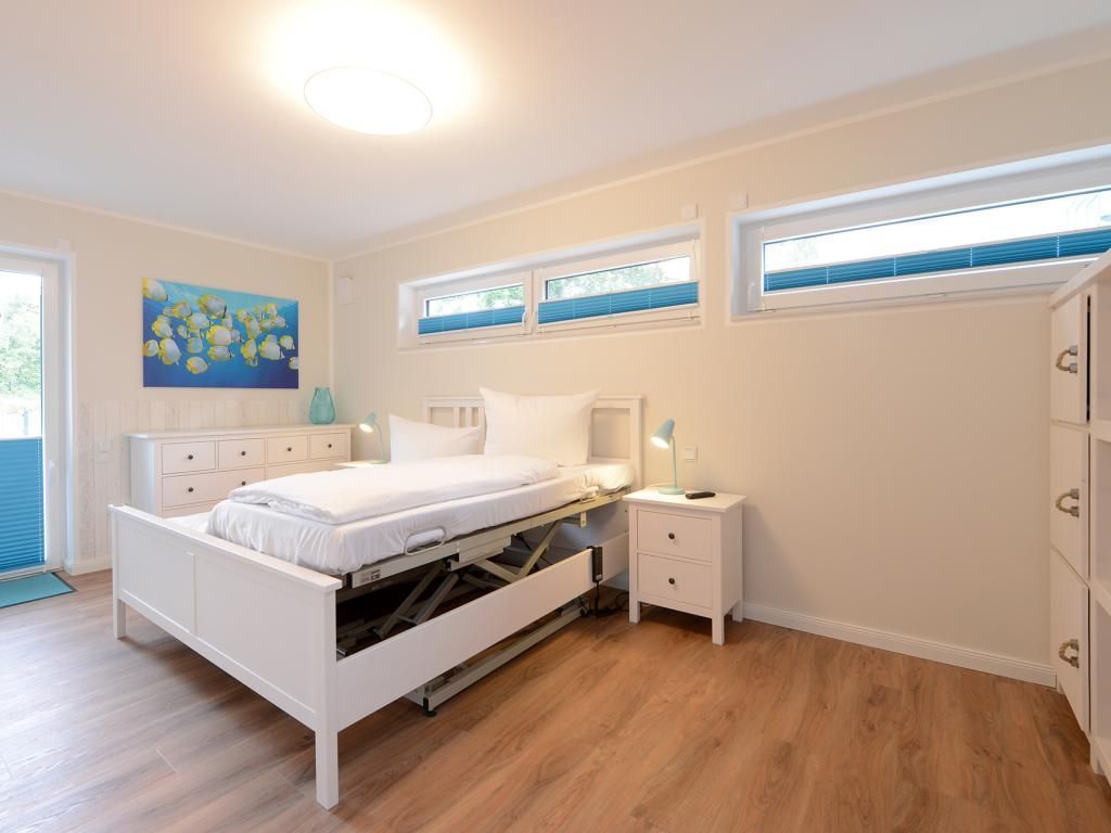 Traumurlaub der Extraklasse in exklusiver Möblierung. Genießen Sie mit bis zu 4 Personen einen maritimen ? barrierefreien- Urlaub in dem 81qm Wohnfläche bietenden Feriendomizil ?Ostwind?. Schon beim Betreten der Ferienwohnung wird Sie die außergewöhnlich geschmackvolle und sorgfältig -auch auf Barrierefreiheit- durchdachte Wohnungsplanung begeistern. Fühlen Sie sich Willkommen im lichterfüllten, geräumigen Wohn-/Essbereich mit Terrassenzugang und machen Sie es sich bequem auf der edlen Ledergarnitur oder dem charmanten Ohren-/Ruhesessel. Zudem erwartet Sie im Wohnraum ein internetfähiger Flachbildfernseher, wie auch eine Musikanlage, WLAN nutze Sie kostenfrei. Der im Holzdesign gehaltene Essbereich mit schmucker Eckbank sowie zwei Stühlen lässt Sie in geselliger Runde gemeinsame Mahlzeiten einnehmen. Das hochwertige Ambiente setzt sich -durch eine Schiebetür abgetrennt- im Küchenbereich fort. Die Küchenzeile wurde, im Zuge der Barrierefreiheit, unterfahrbar geplant und lädt hochwertig ausgestattet- mit Induktionsherd und Backofen, Geschirrspüler, Kühl-/Gefrierkombination, Mikrowelle, Toaster, Kaffeemaschine, Wasserkocher zur Zubereitung von Urlaubsmahlzeiten ein, wenn Sie einmal nicht in einem der nahegelegenen Restaurants Speisen möchten. Das charmant einladende Schlafzimmer ist in beruhigenden Farben gehalten und mit einem Doppelbett ? mit einseitiger Hubfunktion-, einem Schrank für Ihre Urlaubsgarderobe einer Kommode sowie einem Flachbild TV ausgestattet. Vom Schlafzimmer aus können Sie die Nord-/West Terrasse begehen und dem Meeresrauchen zuhören. Das zweite Schlafzimmer bietet ein Etagenbett, wobei die untere Matratzengröße 140cm x 200cm und die obere Matratze eine Größe von 0,90cm x 200cm bieten. Somit ist die Wohnung ?Ostwind? auch für 2 Erwachsene mit bis zu 3 Kindern gut geeignet. Ein kleiner Sitzbereich, Kommode und auch ein Flachbild -TV sind ebenso im zweiten Schlafzimmer vorhanden. Starten Sie im schicken Tageslichtbad vergnügt in den Tag. Selbstverständlich ist auch das moderne Duschbad Rollstuhl gerecht ausgestattet mit ebenerdiger Dusche sowie Haltegriffen im WC Bereich. Alle Wohnräume bieten Ihnen eine elektrische Beschattung sowie farbenprächtige Plisses. Durch den in allen Fenstern vorhanden Insektenabwehrschutz können Sie auch bei geöffneten Fenstern ruhig schlafen. Behagliche Wohlfühlmomente verspricht die, in der gesamten Ferienwohnung vorhandene, Fußbodenheizung. Auf jeder Etage befindet sich auch eine Waschmaschine. Der Clou der Villa Gezeiten ist die über einen Autolift erreichbare Tiefgarage, von der aus Sie mit dem Fahrstuhl bequem die jeweilige Etage erreichen. Bitte beachten Sie hier die max. Maße Ihres PKWs- max. Höhe 1,95m/max. Länge 5,30m-