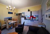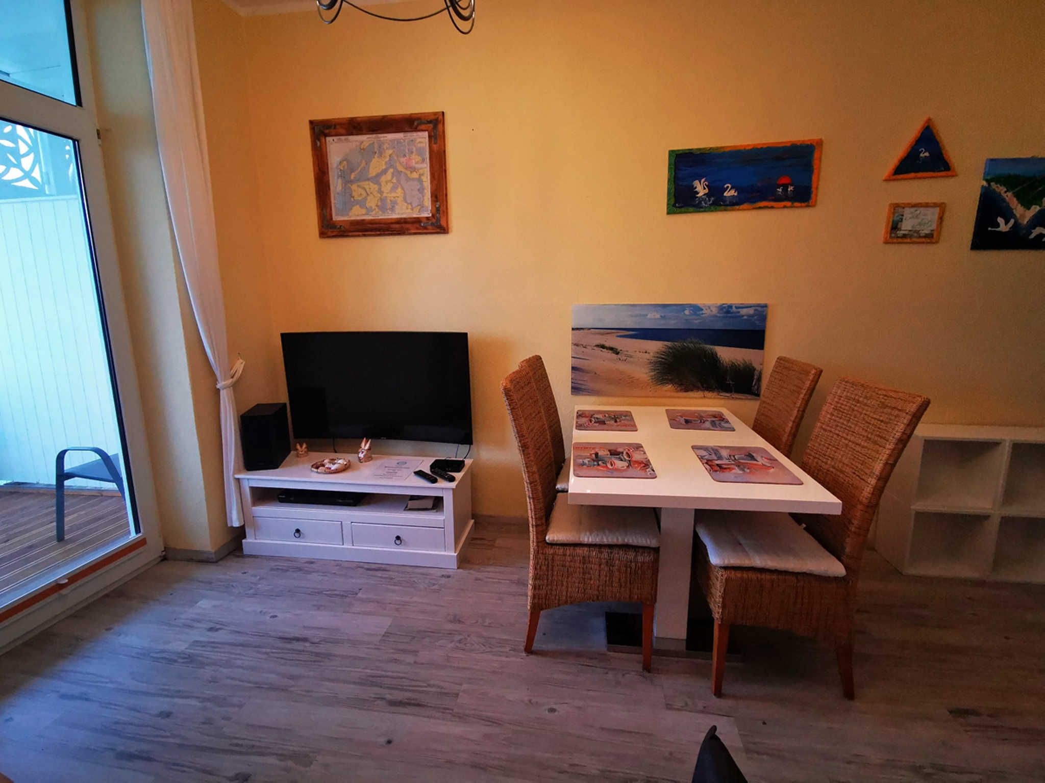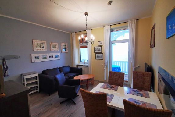 Das Wohnzimmer verfügt über eine Sitzgruppe, einen Tisch mit 4 Stühlen, Unterhaltungselektronik wie Flachbild-TV, WLAN und DVD Player.