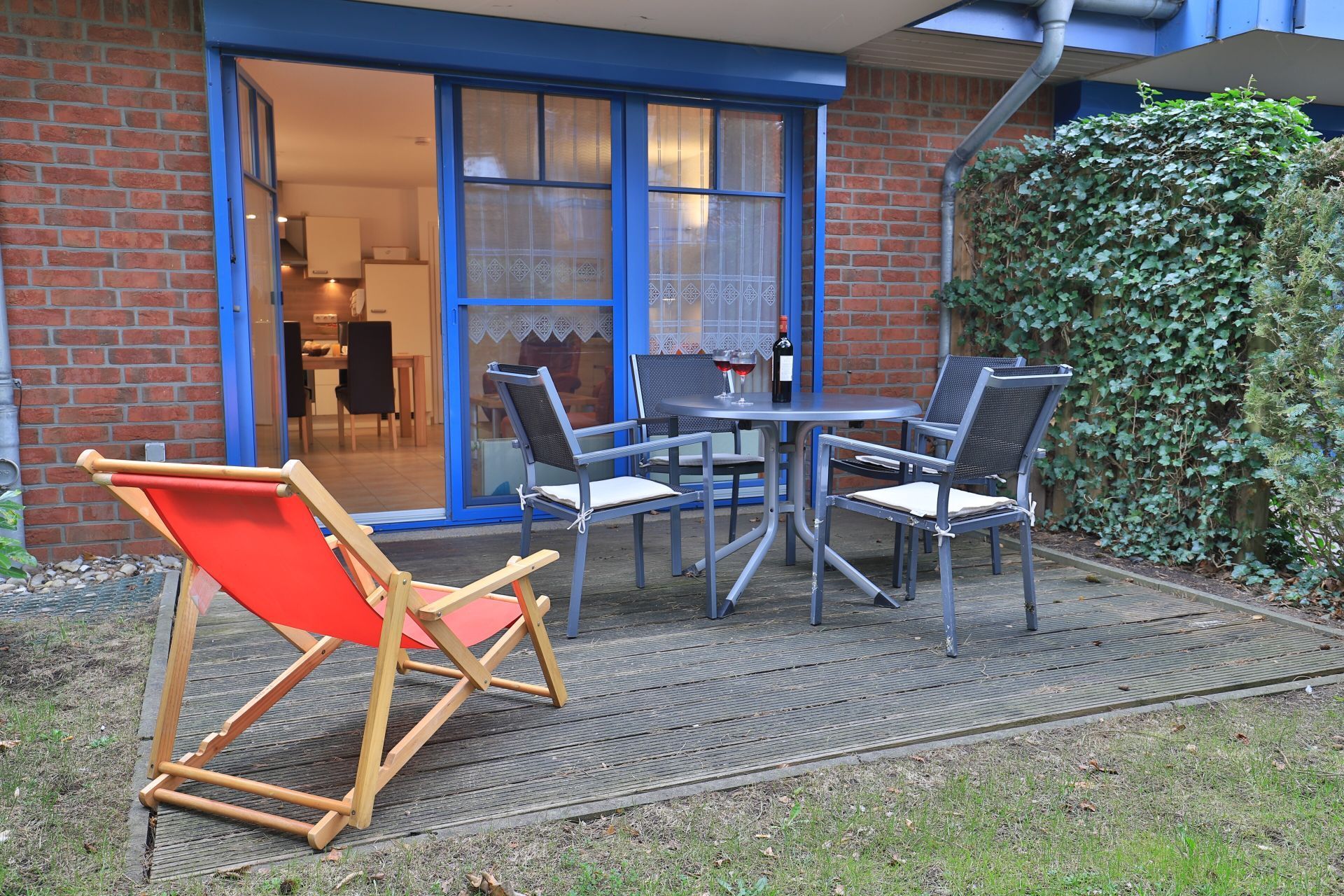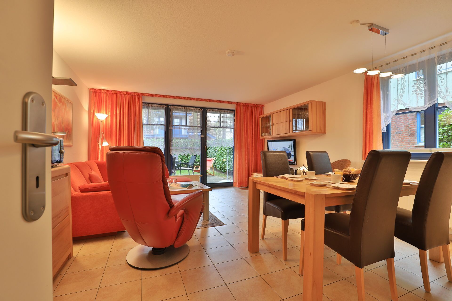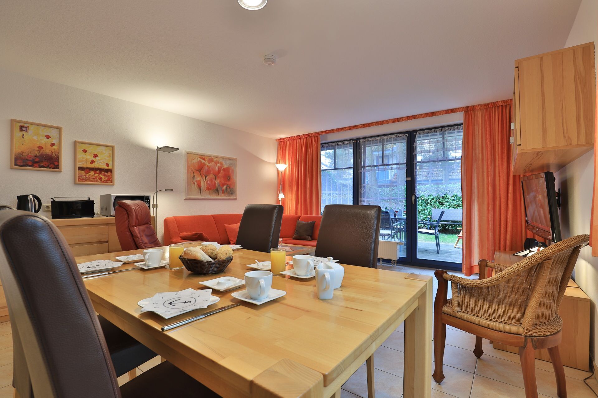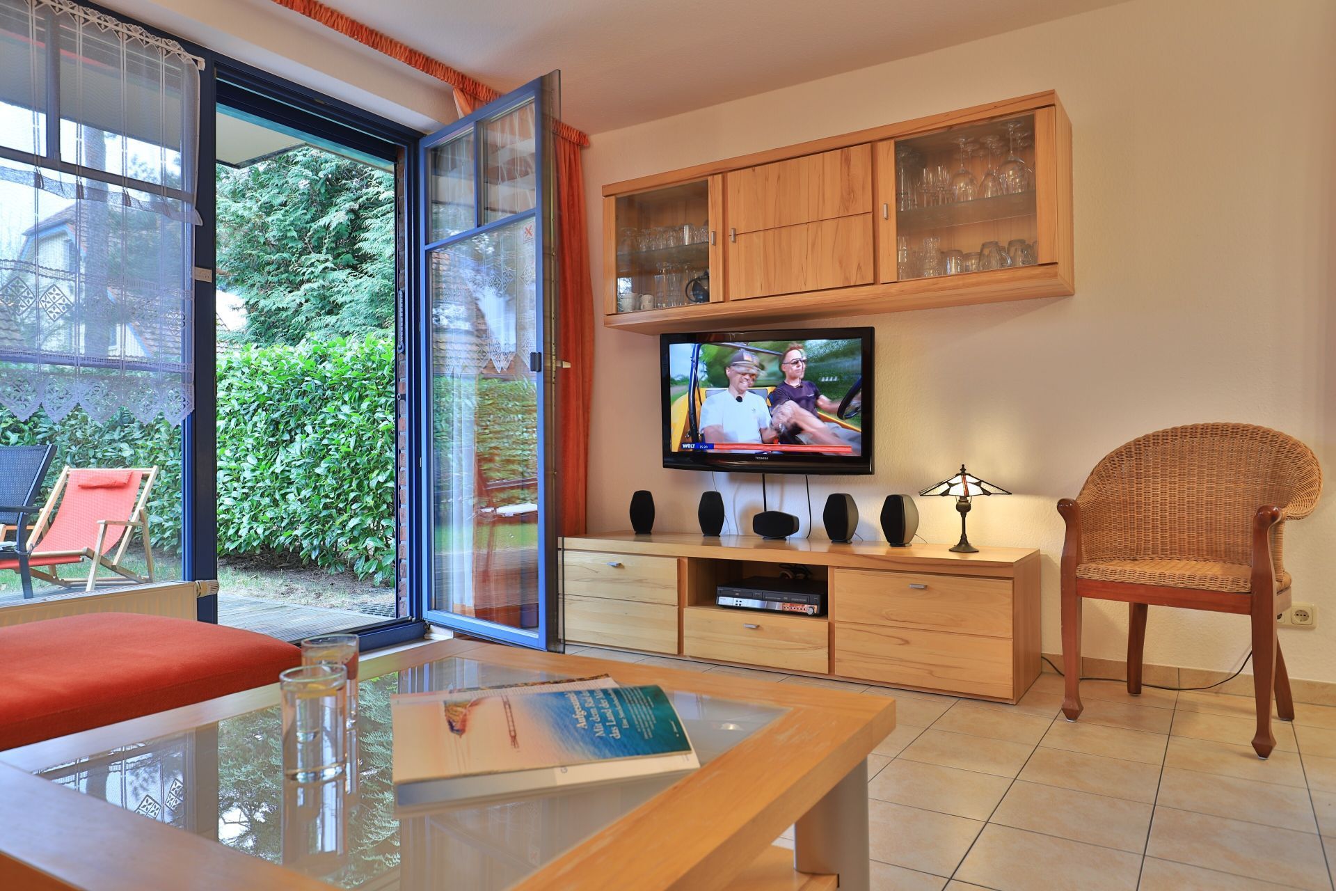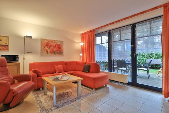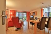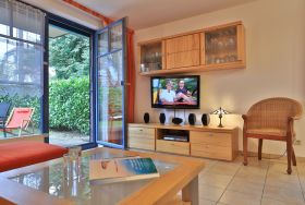Die 2- Zimmer Ferienwohnung Papillon 12- ist behaglich möbliert und insgesamt gut ausgestattet. Die Wohnfläche beträgt von 55qm und kann mit bis zu 4 Personen bewohnt werden. Der Wohn-/Essbereich ist mit einem Sofa, das auch als Schlafsofa für zwei Personen nutzbar ist, eingerichtet und weitere Sitzmöglichkeiten sowie ein Relax Sessel, Fernseher, DVD-Player, Musikanlage, kostenfreie WLAN-Nutzung sind vorhanden. Die saisonal möblierte Süd- Terrasse lädt zum Entspannen ein. Ein Elektrogrill ermöglicht Grillen auf der Terrasse. In der modernen Wohnküche stehen Ceranherd, Backofen, Mikrowelle, Dunstabzug, Geschirrspüler sowie Kühlschrank mit integr. Gefrierfach, Kaffeemaschine, Toaster und Wasserkocher bereit. Ihre Mahlzeiten nehmen Sie am Esstisch zu sich. Das separate Schlafzimmer empfängt Sie mit zwei Einzelbetten, Kleiderschrank und 2.Fernseher. Das teilweise modernisierte Tageslicht Duschbad ist mit Waschtisch, Föhn, WC ausgestattet. Gegen Gebühr können Sie im Untergeschoß des Hauses Waschmaschine und Wäschetrockner nutzen. Bügeleisen und Bügelbrett sowie ein Kinderhochstuhl, Kinderbett, Bollerwagen sind ebenso vorhanden. Ihren PKW parken Sie kostenfrei auf dem wohnungseigenen Außenstellplatz. Bitte beachten Sie, dass es sich um eine Nichtraucherwohnung handelt. Kleine Hunde sind gegen eine Gebühr in Höhe von 10 Euro/Tag herzlich willkommen. Zur Ostsee gelangen Sie in nur ca. 250 Meter.