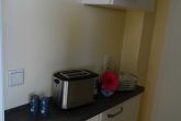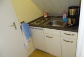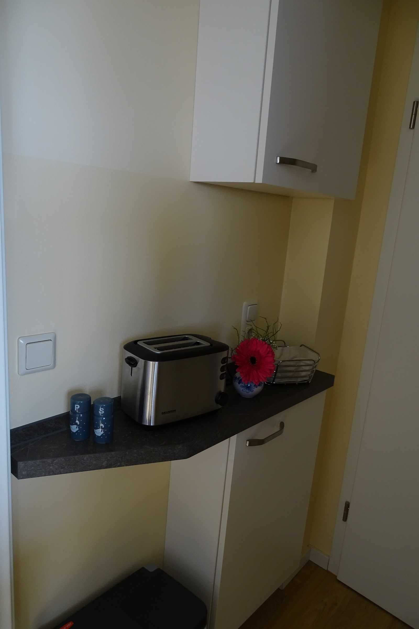 Die Ferienwohnung im Obergeschoß verfügt über ein Wohnzimmer, ein separates Schlafzimmer mit Doppelbett, Dusche/WC, Miniküche (Toaster, Eierkocher, Wasserkocher, Kaffeemaschine, Besteck, Geschirr), und Sat-TV, Radio.