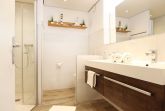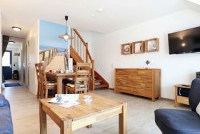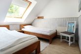Das modernisierte Duschbad ist mit zwei Waschtischen und WC ausgestattet. Zusätzlich ist ein Gäste-WC in der Wohnung vorhanden. Über eine Treppe im Wohnbereich gelangen Sie in die obere Ebene mit zwei weiteren Schlafzimmern, welche jeweils mit einem Doppelbett, Kleiderschrank möbliert sind. Gegen Gebühr können Sie im Untergeschoß des Hauses Waschmaschine und Wäschetrockner nutzen. Ein Kinderhochstuhl befindet sich in der Wohnung. Ihren PKW parken Sie kostenfrei auf dem wohnungseigenen Außenstellplatz.