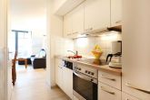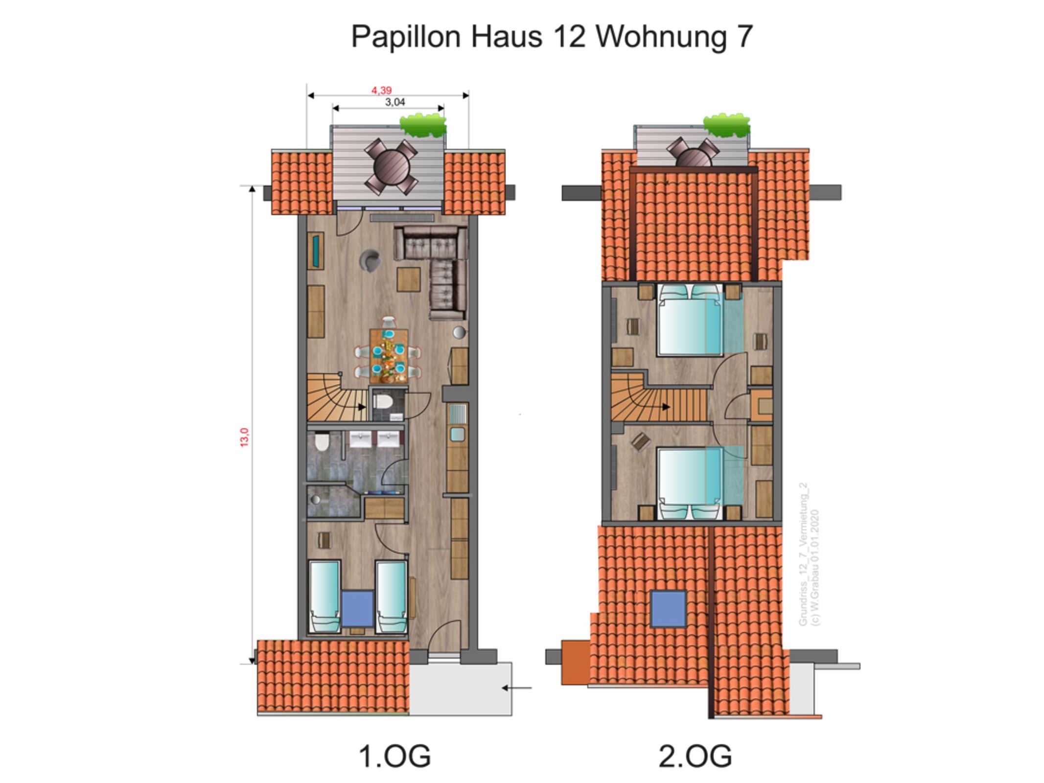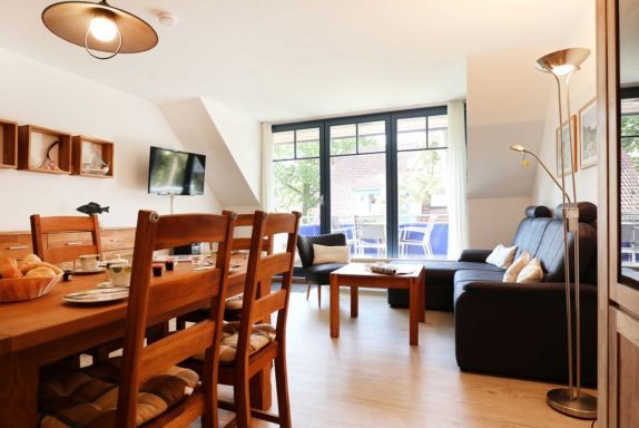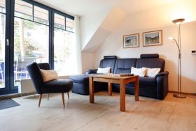 Die 4- Zimmer Maisonetten Ferienwohnung Papillon 12-7 ist insgesamt sehr komfortabel ausgestattet. Auf einer Wohnfläche von 67qm können Sie mit bis zu 6 Personen bequem wohnen. Der großzügige Wohn-/Essbereich ist mit einem Sofa sowie weiteren Sitzmöglichkeiten und einem großen Esstisch möbliert. Ein Fernsehgerät, Musikanlage und kostenfreie WLAN- Nutzung bieten Abwechslung. Vom Wohnbereich gelangt man auf den saisonal möblierten Süd- Ost Balkon. In der Wohnküche stehen Ceranherd, Backofen, Geschirrspüler sowie Kühlschrank mit integr. Gefrierfach, Kaffeemaschine, Toaster und Wasserkocher bereit. Ihre Mahlzeiten können Sie am Esstisch zu sich nehmen. Zudem befindet sich auf dieser Wohnebene ein separates Schlafzimmer mit zwei Einzelbetten, und Kleiderschrank.