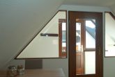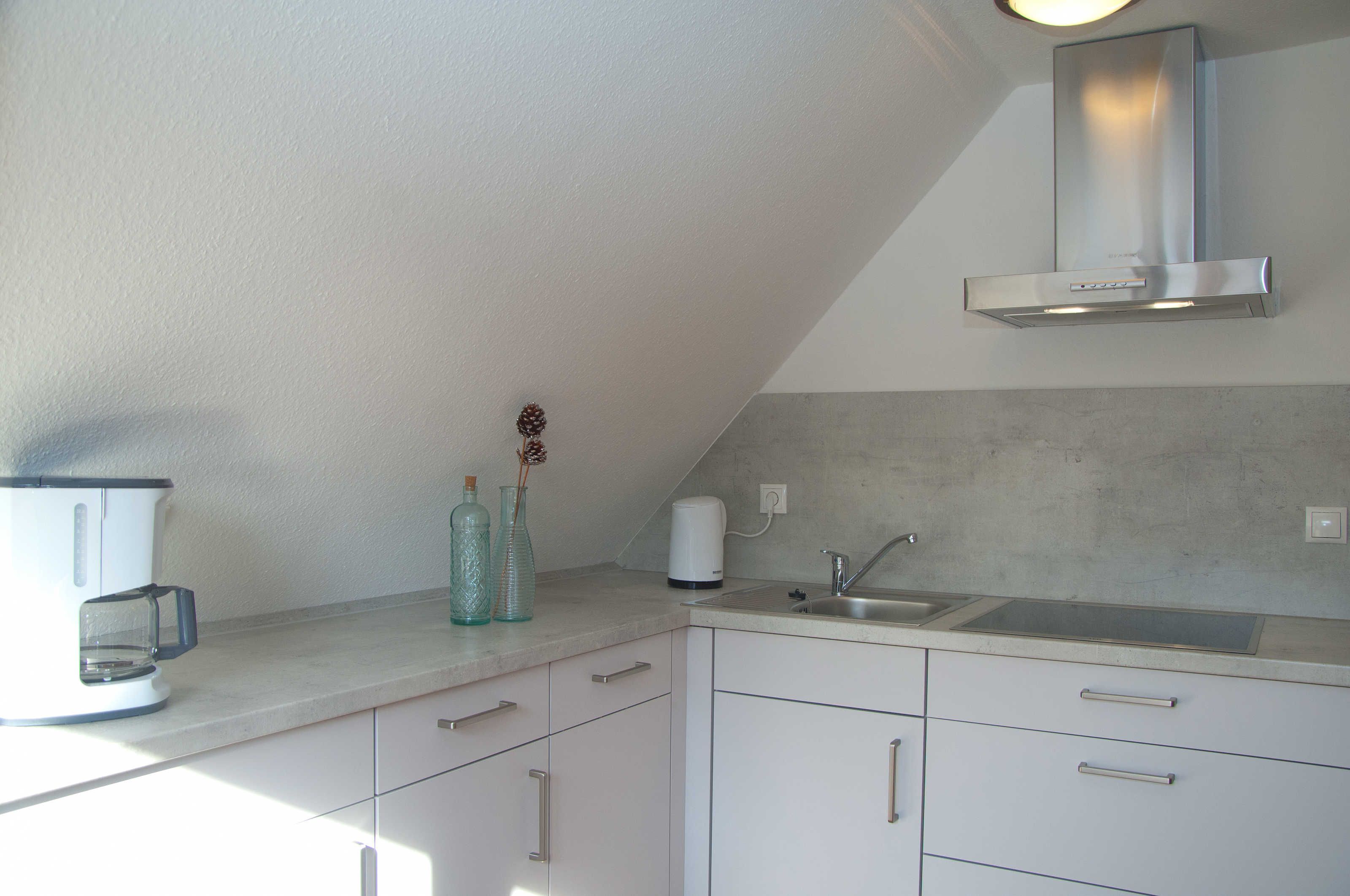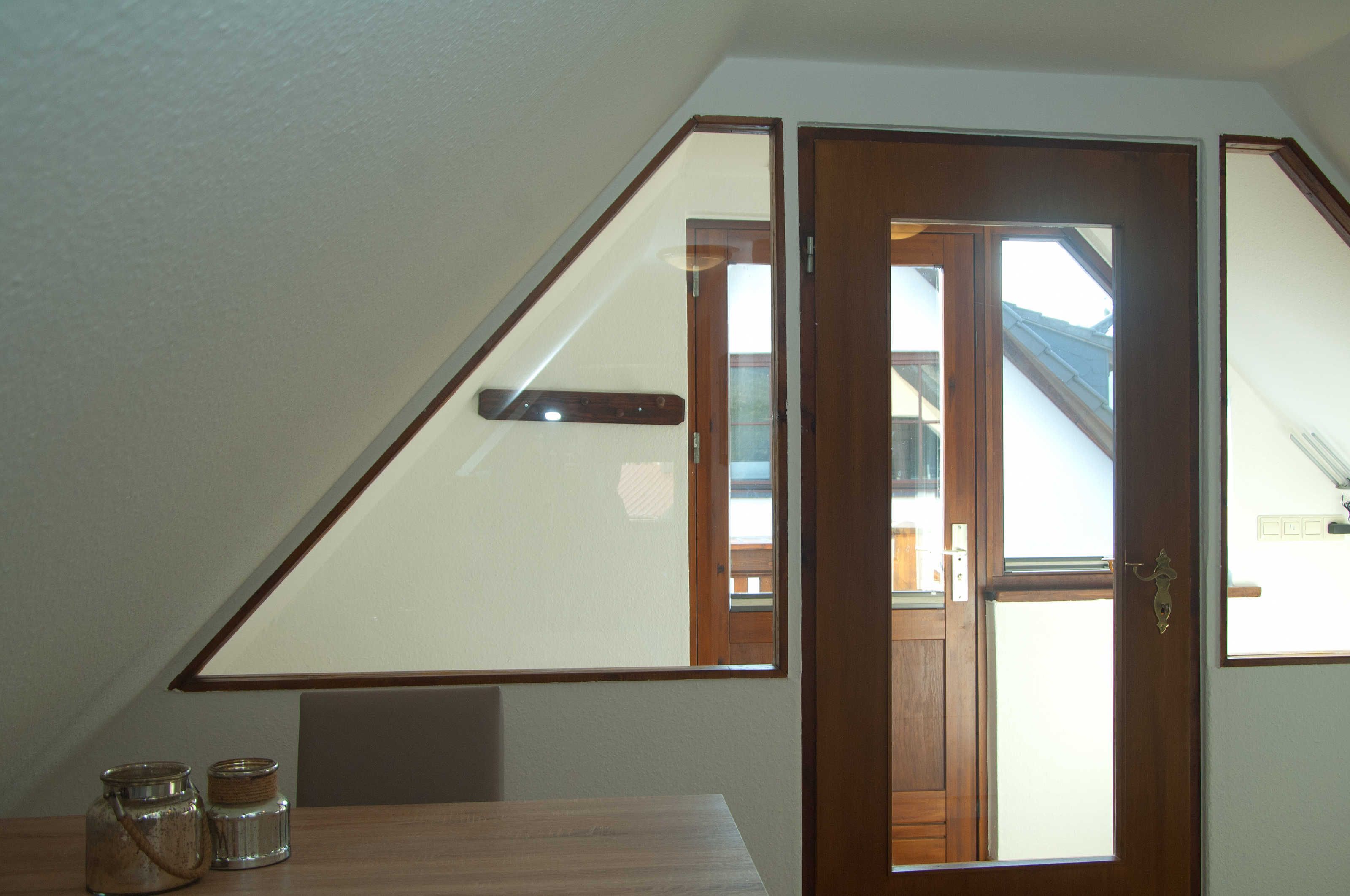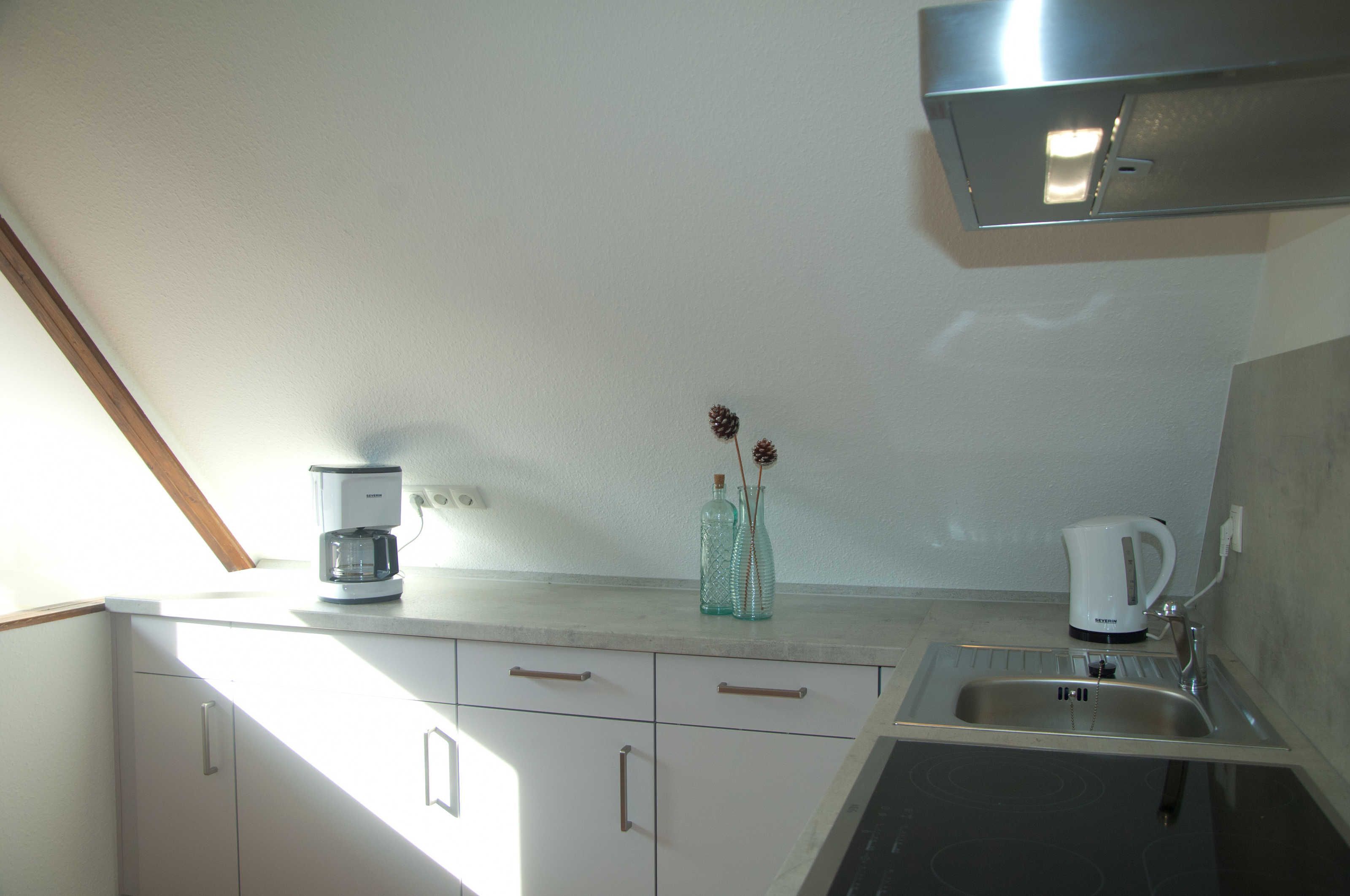 Wohnung Bernstein befindet sich im Obergeschoss und über eine Aussentreppe erreichbar. Hier befindet sich eine Küche, Bad und ein Wohn - Schalfzimmer.