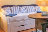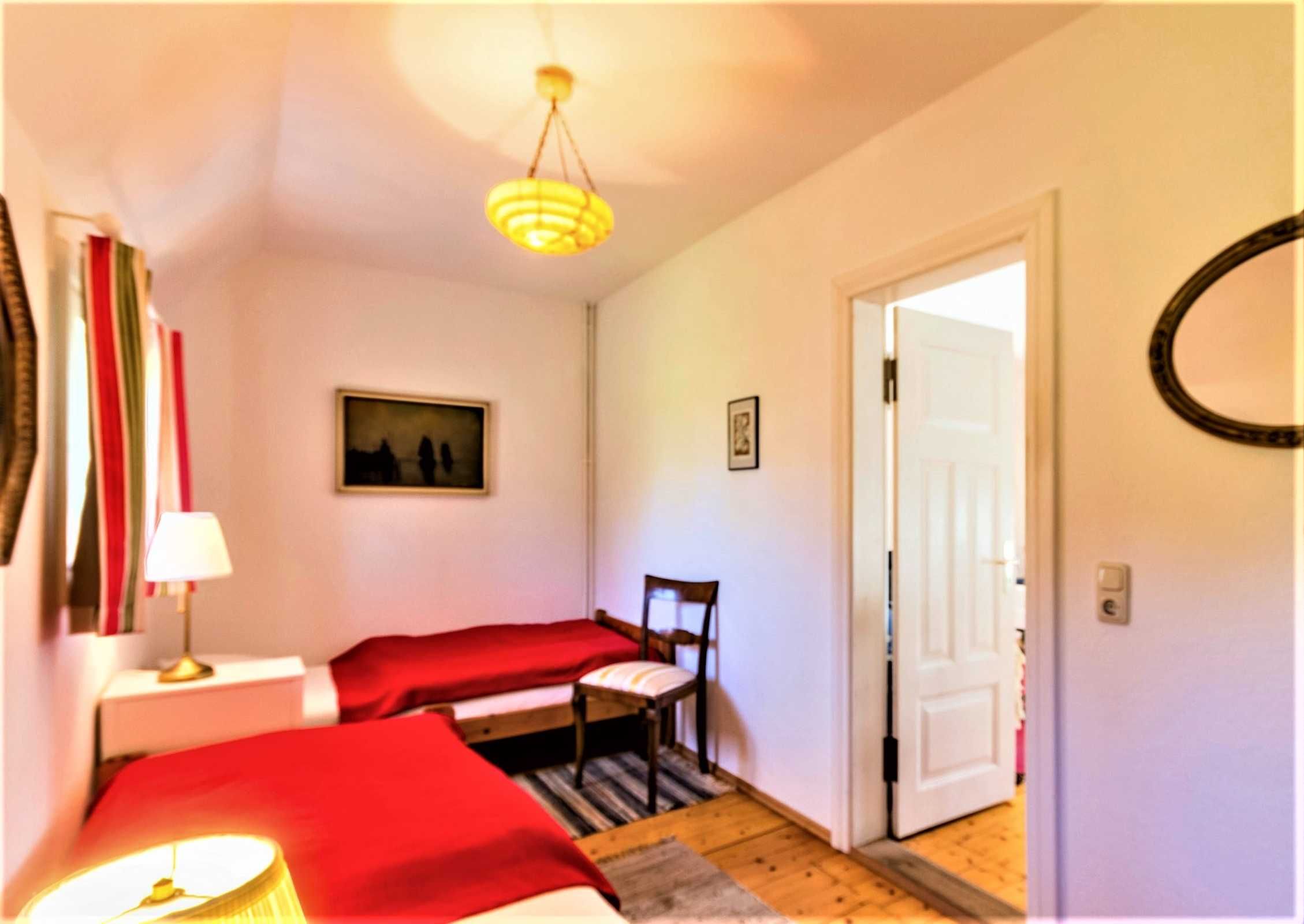107 qm große Ferienwohnung über zwei Etagen für 7 Personen. Wohnzimmer mit Couch und Doppelbett, 1 Schlafzimmer mit 2 Einzelbetten im EG, 1 SZ mit 3 Einzelbetten im OG. Bad mit Dusche und Badewanne.