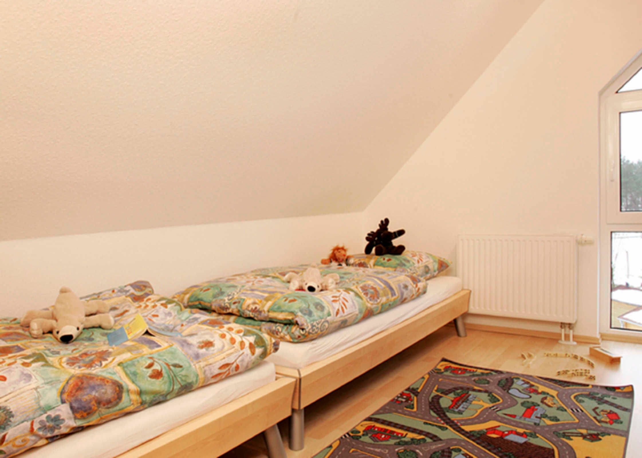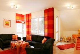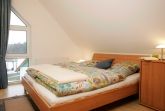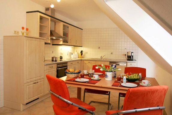 Unsere Maisonette-Wohnung wurde im Januar 2006 fertiggestellt. Sie befindet sich in einem Haus mit 6 Ferienwohnungen, die separate Eingänge haben. Unseren Gästen stehen 2 PKW-Stellplätze und ein Gartenhaus mit 2 Fahrrädern ( 2 x 28 Zoll - Nutzung auf eigene Gefahr) zur Verfügung. Die Wohnung erstreckt sich über 2 Etagen und ist für 4 Erwachsene/ Kinder eingerichtet. Im Obergeschoß des Hauses befinden sind Flur, Bad mit Dusche und WC, die Küche mit Essplatz sowie das Wohnzimmer mit Balkon und ein Abstellraum. Vom Wohnzimmer aus gelangen Sie in das Dachgeschoß mit 2 Schlafzimmern. Ein Zimmer ist mit einem Doppelbett 180 cm x 200 cm möbliert; im zweiten Schlafzimmer finden Sie zwei Einzelbetten 90 cm x 200 cm. Wir möchten, dass Sie sich wohlfühlen und haben daher viel Wert auf eine gehobene Ausstattung gelegt: Die Winkeleinbauküche verfügt über eine Kühlschrank mit Gefrierfach, eine Mirkowelle, ein Ceran-Kochfeld, Backofen und Dunstabzughaube, eine Geschirrspülmaschine, Kaffeemaschine, Wasserkocher und Toaster. Des Weiteren ist sie mit allen Haushaltsgegenständen wie Geschirr, Gläsern, Töpfen, Besteck, usw. bestückt. Ein großer Esstisch mit 4 Stühlen lädt zum Verweilen ein. Ein Kinderhochstuhl, Kindergeschirr- und -besteck sind ebenfalls verfügbar. Im Wohnzimmer steht Ihnen neben einer Sitzgruppe ein Hochlehnsessel für gemütliche Schmökerstunden zur Verfügung. Ein Fernsehgerät, ein DVD-Player und eine kleine Stereo-Anlage (Radio, CD,Kassettenteil ) sind ebenfalls vorhanden. Das Bad bietet ausreichend Stauraum und ist mit einem Handtuch-Heizkörper ausgestattet. Auf dem Balkon befinden sich ein Tisch und vier Stühle. Bitte beachten Sie, das es sich um eine Nichtraucherwohnung handelt - Rauchen können Sie auf dem Balkon! Da wir die Wohnung auch an Allergiker vermieten möchten, bitte keine Haustiere mitbringen!
