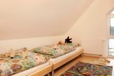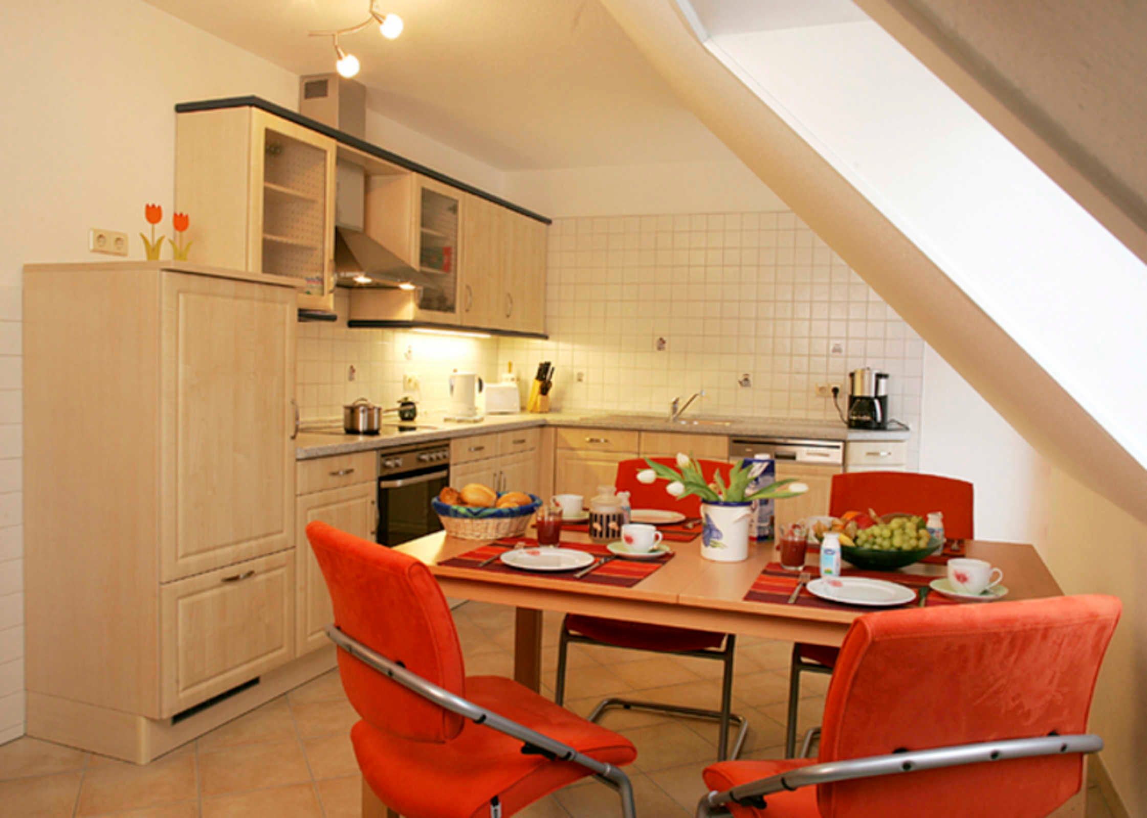 Unsere Maisonette-Wohnung befindet sich in einem Haus mit 6 Ferienwohnungen. Jede Wohnung hat einen separaten Einang. Unseren Gästen stehen 2 PKW-Stellplätze und ein Gartenhaus mit 2 Fahrrädern ( 2 x 28 Zoll ) zur Verfügung (Nutzung auf eigene Gefahr). Die Wohnung erstreckt sich über 2 Etagen und ist für 4 Erwachsene/ Kinder eingerichtet. Im Obergeschoß des Hauses befinden sind Flur, Bad mit Dusche und WC, die Küche mit Essplatz sowie das Wohnzimmer mit Balkon und ein Abstellraum. Vom Wohnzimmer aus gelangen Sie in das Dachgeschoß mit 2 Schlafzimmern. Ein Zimmer ist mit einem Doppelbett 180 cm x 200 cm möbliert; im zweiten Schlafzimmer finden Sie zwei Einzelbetten 90 cm x 200 cm. Wir möchten, dass Sie sich wohlfühlen und haben daher viel Wert auf eine gehobene Ausstattung gelegt: Die Winkeleinbauküche verfügt über eine Kühlschrank mit Gefrierfach, eine Mikrowelle, ein Ceran-Kochfeld, Backofen und Dunstabzughaube, eine Geschirrspülmaschine, Kaffeemaschine, Wasserkocher und Toaster. Des Weiteren ist sie mit allen Haushaltsgegenständen wie Geschirr, Gläsern, Töpfen, Besteck, usw. bestückt. Ein großer Esstisch mit 4 Stühlen lädt zum Verweilen ein. Ein Kinderhochstuhl, Kindergeschirr- und -besteck sind ebenfalls verfügbar. Im Wohnzimmer steht Ihnen neben einer Sitzgruppe ein Hochlehnsessel für gemütliche Schmökerstunden zur Verfügung. Ein Fernsehgerät, ein DVD-Player und eine kleine Stereo-Anlage (Radio, CD,Kassettenteil ) sind ebenfalls vorhanden. Das Bad bietet ausreichend Stauraum und ist mit einem Handtuch-Heizkörper ausgestattet. Auf dem Balkon befinden sich ein Tisch und vier Stühle. Bitte beachten Sie, das es sich um eine Nichtraucherwohnung handelt - Rauchen können Sie auf dem Balkon! Da wir die Wohnung auch an Allergiker vermieten möchten, bitte keine Haustiere mitbringen!