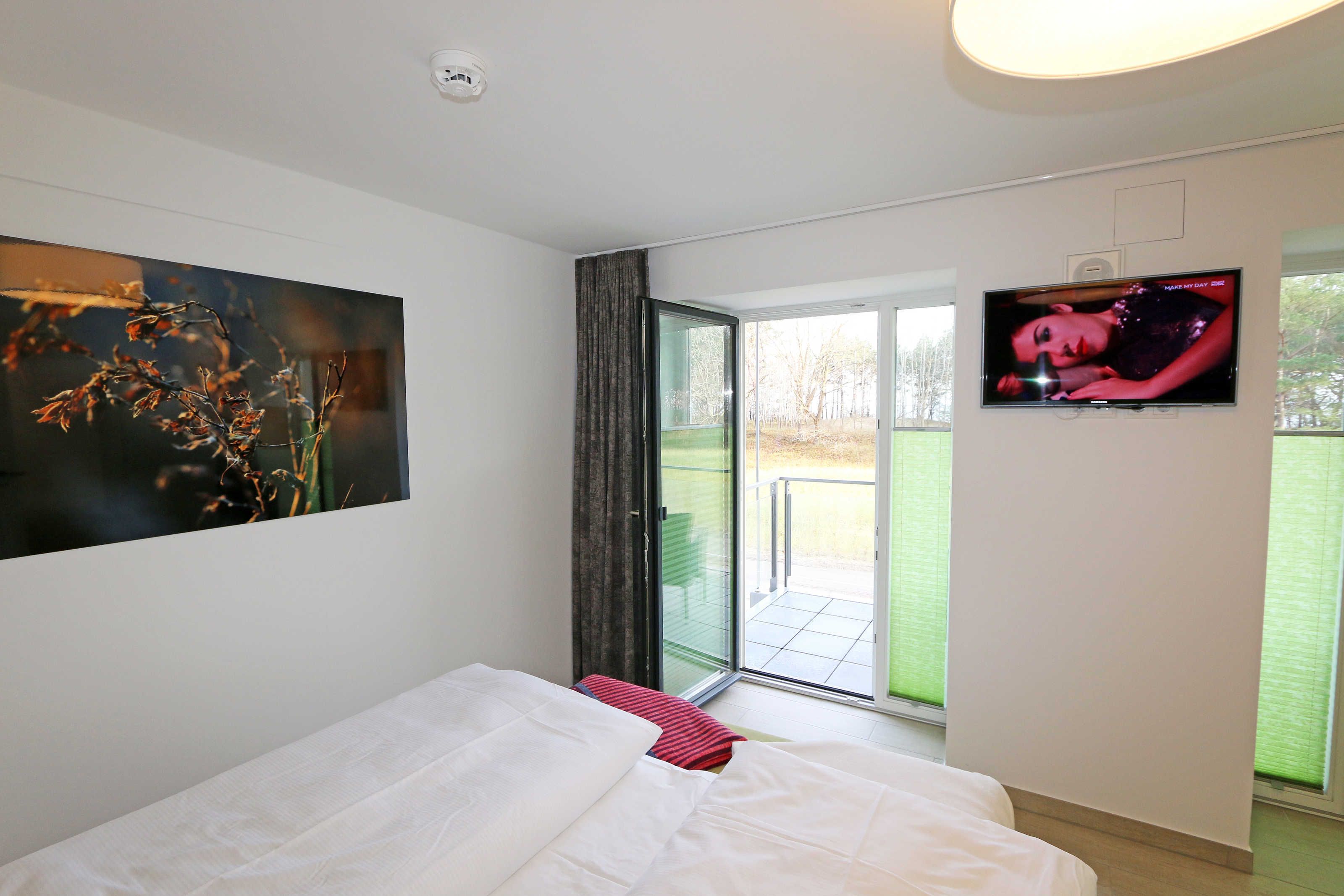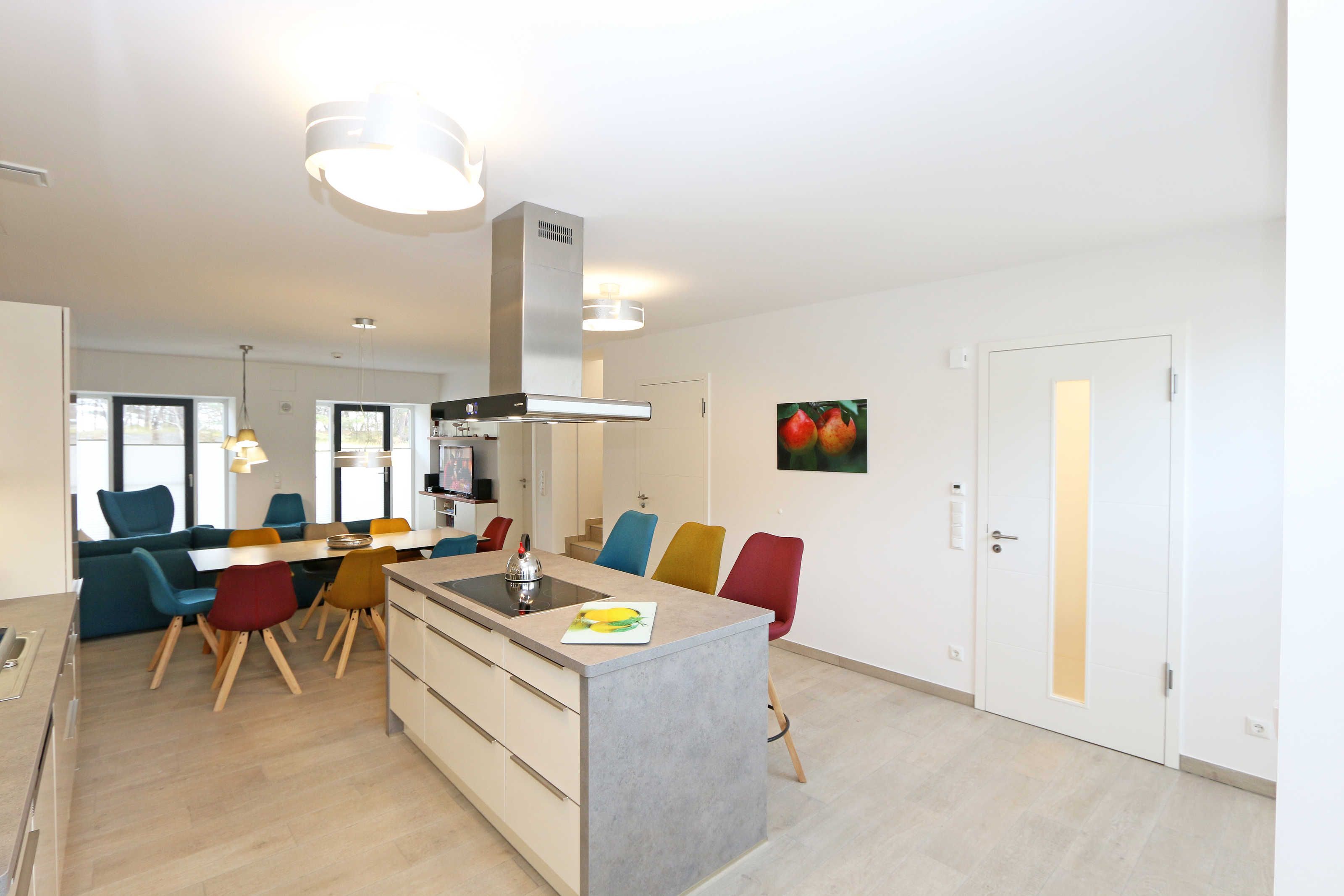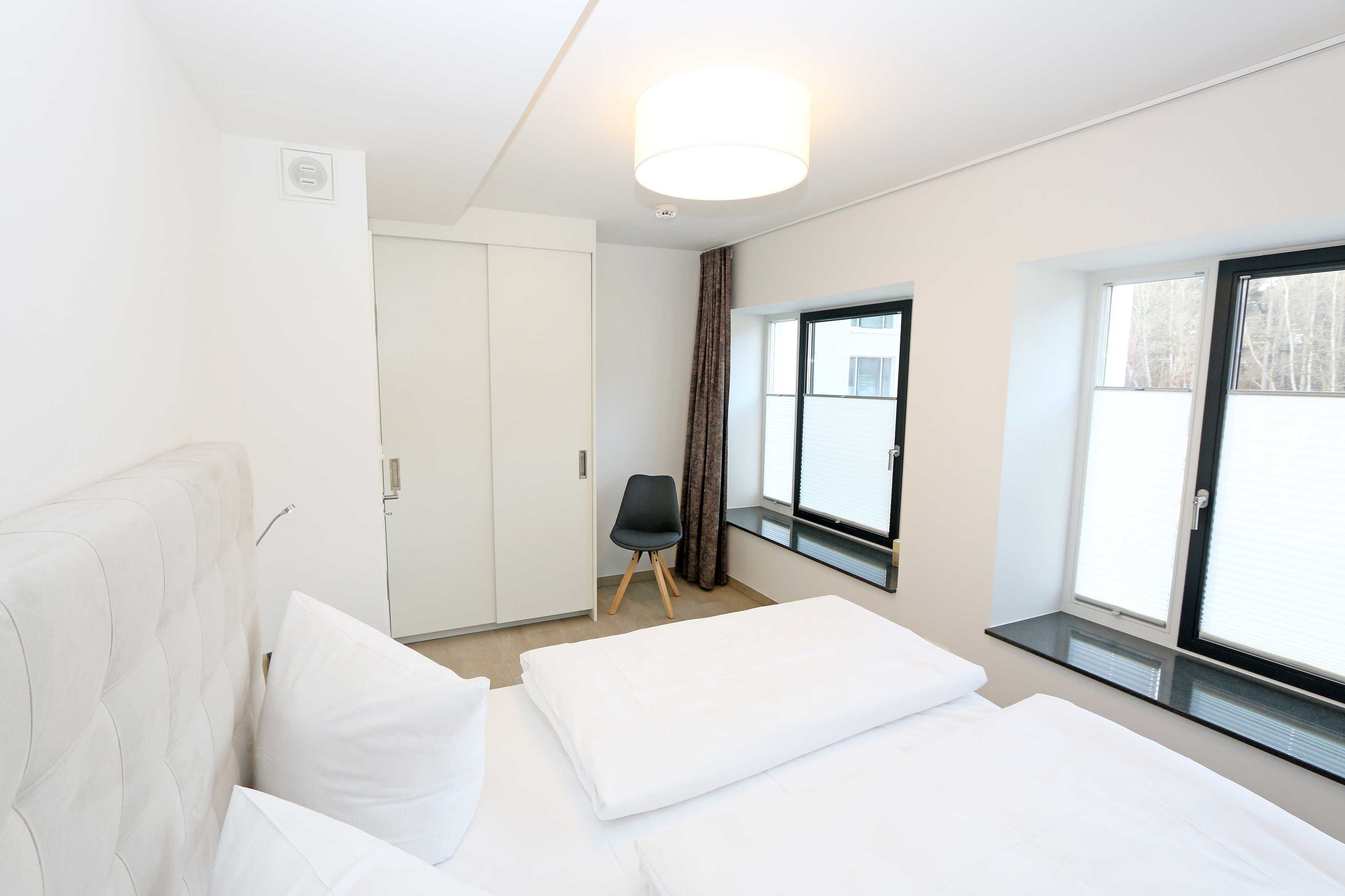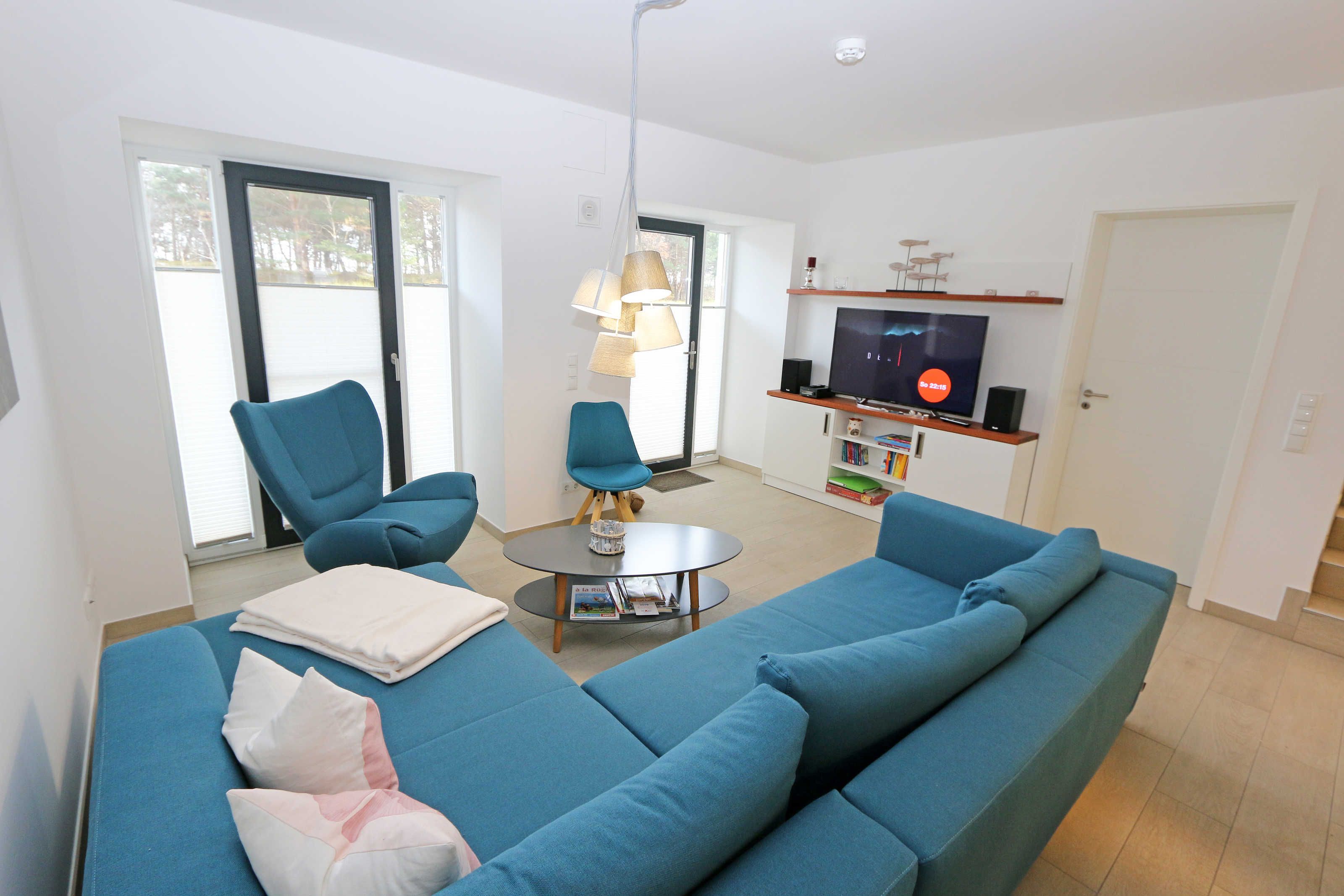 Die ca. 140 m² große 5-Raumferienwohnung (Nichtraucher), welche sich über 2 Etagen erstreckt, bietet Ihnen durch ihre erstklassige, stilsichere Ausstattung mit Balkon (Seeseite) und Terrassen im Erdgeschoss beste Voraussetzungen für einen unvergesslichen Urlaub. Dank einer gelungenen Raumaufteilung bietet die Wohnung Platz für max. 7 Erwachsene und 2 Kleinkinder bis 3 Jahre im Kinderreisebett. Im großzügigen Wohn-/Essbereich können Sie durch die komfortable Eck-Couch mit Couchtisch, Sideboard und großem Essplatz gemütliche Tage verbringen. Vier Smart-TVs und eine Mini-Stereo-Anlage mit Bluetooth und USB-Anschluss sowie das in der Wohnung kostenlos zur Verfügung gestellte W-LAN sorgen für Ihre Unterhaltung. Vom Wohnbereich gelangen Sie direkt auf Ihre 2 Terrassen, welche einmal zur Seeseite und zur Landseite ausgerichtet sind. Die moderne Küchenzeile, welche sich dem Wohnbereich anpasst, bietet Ihnen ein 4-Zonen-Cerankochfeld, Backofen, Spülmaschine, Kühlschrank mit separaten Gefrierfach, Kaffeemaschine, Nespresso Kaffeemaschine, Toaster, Wasserkocher, Mixer sowie diverse Küchenutensilien und lädt so zu gemütlichen Kochabenden ein. Drei Schlafzimmer sind mit einem Doppelbett (1x 1,60m x 2,00m, 1x 0,90m x 2,00m ausziehbar auf 1,80m und 1x 1,80m x 2,00m), Nachttischablagen mit Beleuchtung und USB-Anschlüssen sowie Kleiderschränken für Ihre Urlaubsgarderobe ausgestattet. Das vierte Schlafzimmer verfügt über ein Einzelbett (0,90m x 2,00m), Nachttischablage mit Beleuchtung und USB Anschlüssen sowie einen Kleiderschrank. Bei einem der 4 Schlafzimmer erwartet Sie zusätzlich ein Zugang zum Balkon, wo Sie einen einmaligen Blick auf die Ostsee erleben werden. Verdunklungsmöglichkeiten durch Vorhänge sowie Plissees und Insektenschutz erlauben einen geruhsamen Schlaf in allen 4 Schlafzimmern. Drei Schlafzimmer verfügen über je ein Smart-TV. Alle 3 Bäder sind jeweils mit einem WC, einer ebenerdigen Dusche, einen Kosmetikspiegel, einen Fön, einen Handtuchtrockner sowie einem Waschplatz mit großzügigen Spiegeln und Ablageflächen eingerichtet. Ein Badezimmer lockt zusätzlich mit einer Sauna zur Entspannung ein. Ein weiteres Bad wird durch ein Bidet und einer Badewanne abgerundet. Im wohnungsinternen Abstellraum finden Sie auch einen Staubsauger, einen Wäscheständer sowie ein Bügelbrett mit Bügeleisen. In einem separaten Abstellraum im Haus Granitz befindet sich zusätzlich eine Waschmaschine, welche sich für Whg 53 und 03 inklusive ist. Diese befindet sich in der 3 Etage des Hauses und kann bequem mit dem Fahrstuhl erreicht werden. Haustiere, ein kleinerer Hund ist gegen eine Gebühr, gestattet. Ein Stellplatz für Ihren PKW ist auf den gegenüberliegenden Parkplätzen für Sie reserviert. Ihre mitgebrachten Fahrräder können Sie in einem Gemeinschaftsabstellraum unterstellen. Die Erstausstattung eines Wäschepaketes (komplette Bettwäsche, 1 Duschhandtuch, 1 kleines Handtuch) können Sie bis 14 Tage vor Anreise gegen einen Aufpreis dazu buchen oder durch eigene ergänzen. Ab 2 gebuchten Paketen erhalten Sie einmalig 1 Geschirrhandtuch und 1 Duschvorleger hinzu.