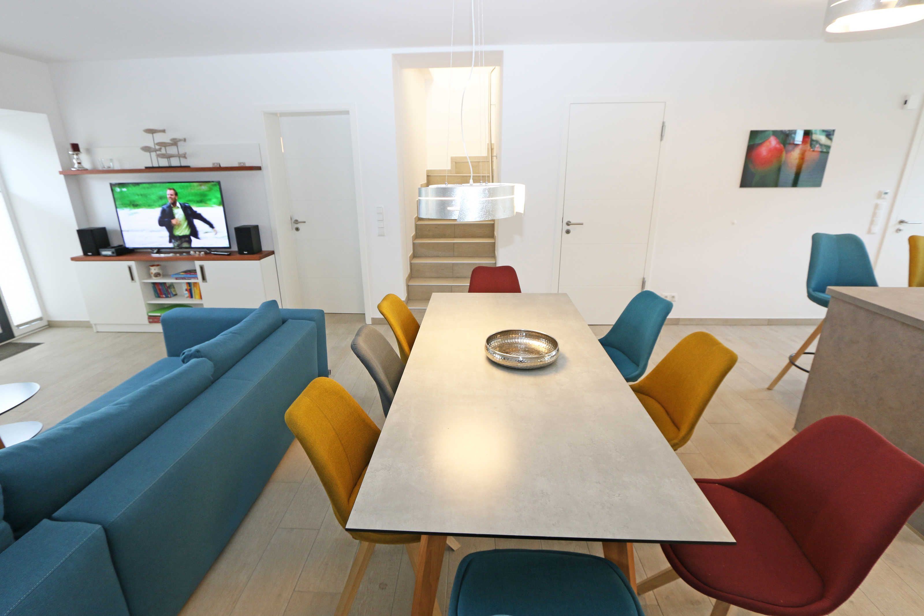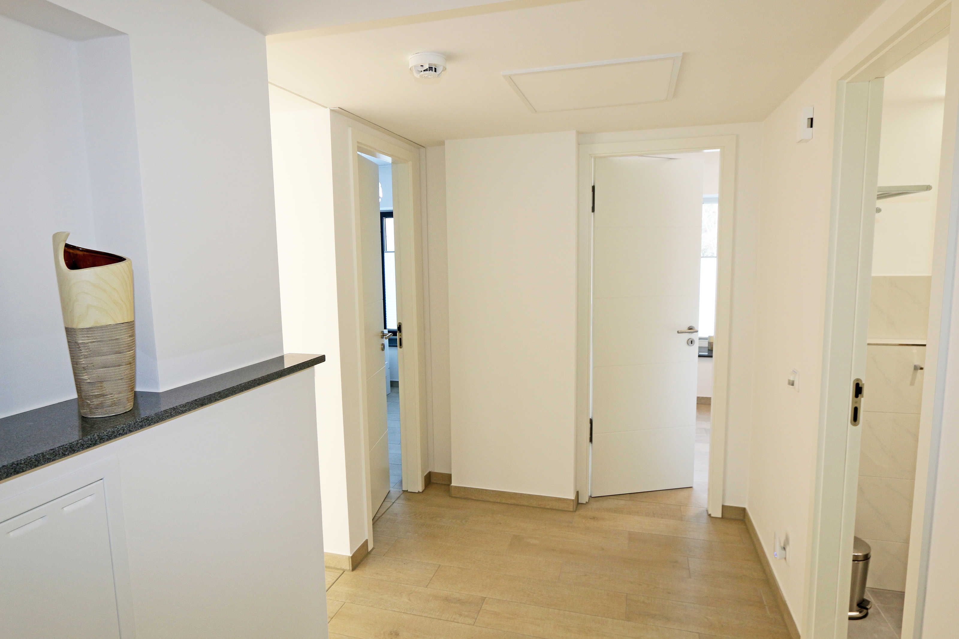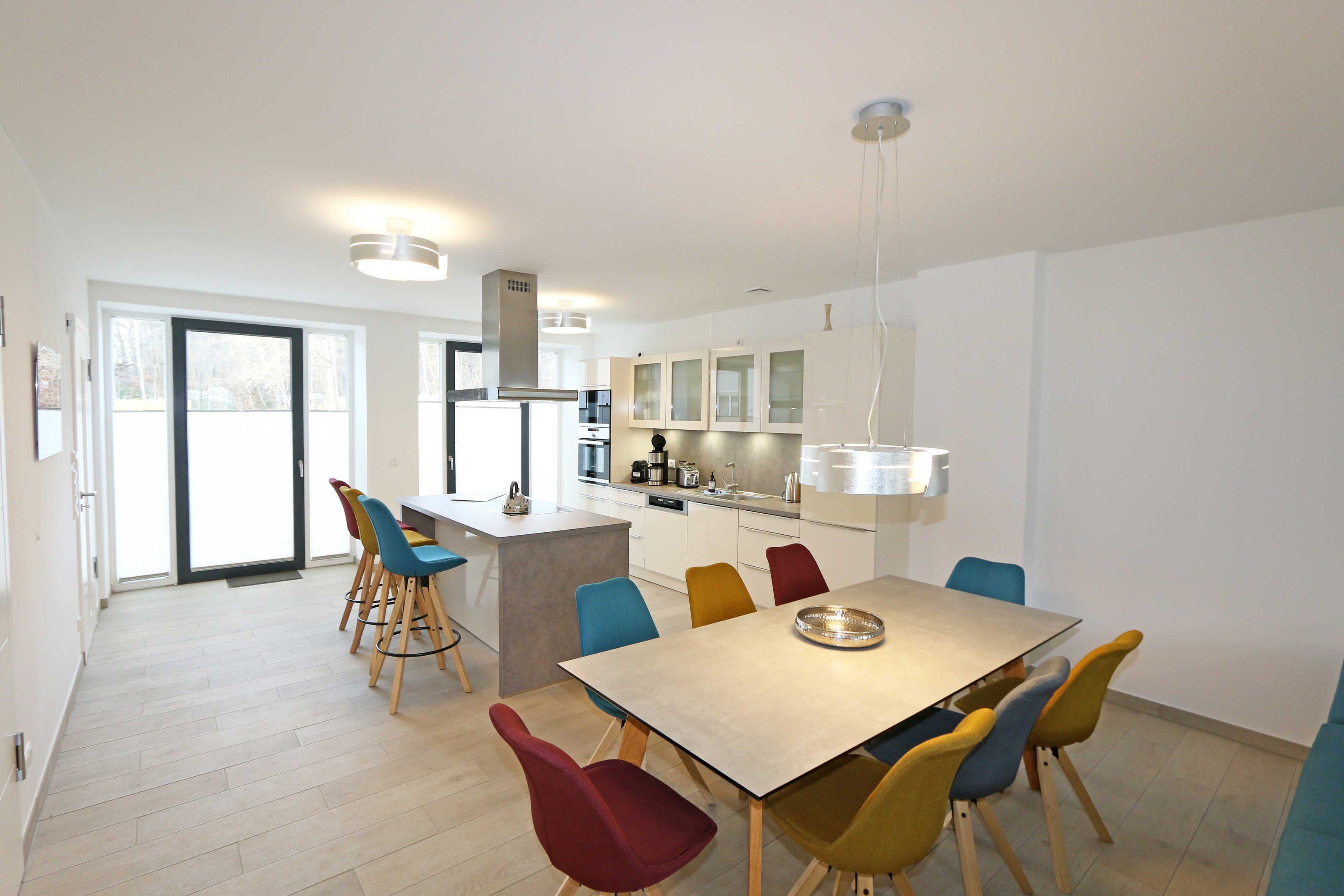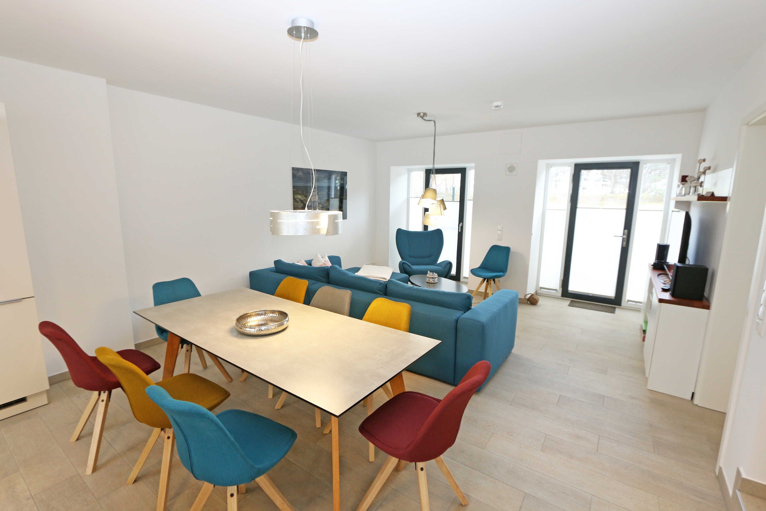 Die ca. 140 m² große 5-Raumferienwohnung (Nichtraucher), welche sich über 2 Etagen erstreckt, bietet Ihnen durch ihre erstklassige, stilsichere Ausstattung mit Balkon (Seeseite) und Terrassen im Erdgeschoss beste Voraussetzungen für einen unvergesslichen Urlaub. Dank einer gelungenen Raumaufteilung bietet die Wohnung Platz für max. 7 Erwachsene und 2 Kleinkinder bis 3 Jahre im Kinderreisebett. Im großzügigen Wohn-/Essbereich können Sie durch die komfortable Eck-Couch mit Couchtisch, Sideboard und großem Essplatz gemütliche Tage verbringen. Vier Smart-TVs und eine Mini-Stereo-Anlage mit Bluetooth und USB-Anschluss sowie das in der Wohnung kostenlos zur Verfügung gestellte W-LAN sorgen für Ihre Unterhaltung. Vom Wohnbereich gelangen Sie direkt auf Ihre 2 Terrassen, welche einmal zur Seeseite und zur Landseite ausgerichtet sind. Die moderne Küchenzeile, welche sich dem Wohnbereich anpasst, bietet Ihnen ein 4-Zonen-Cerankochfeld, Backofen, Spülmaschine, Kühlschrank mit separaten Gefrierfach, Kaffeemaschine, Nespresso Kaffeemaschine, Toaster, Wasserkocher, Mixer sowie diverse Küchenutensilien und lädt so zu gemütlichen Kochabenden ein. Drei Schlafzimmer sind mit einem Doppelbett (1x 1,60m x 2,00m, 1x 0,90m x 2,00m ausziehbar auf 1,80m und 1x 1,80m x 2,00m), Nachttischablagen mit Beleuchtung und USB-Anschlüssen sowie Kleiderschränken für Ihre Urlaubsgarderobe ausgestattet. Das vierte Schlafzimmer verfügt über ein Einzelbett (0,90m x 2,00m), Nachttischablage mit Beleuchtung und USB Anschlüssen sowie einen Kleiderschrank. Bei einem der 4 Schlafzimmer erwartet Sie zusätzlich ein Zugang zum Balkon, wo Sie einen einmaligen Blick auf die Ostsee erleben werden. Verdunklungsmöglichkeiten durch Vorhänge sowie Plissees und Insektenschutz erlauben einen geruhsamen Schlaf in allen 4 Schlafzimmern. Drei Schlafzimmer verfügen über je ein Smart-TV. Alle 3 Bäder sind jeweils mit einem WC, einer ebenerdigen Dusche, einen Kosmetikspiegel, einen Fön, einen Handtuchtrockner sowie einem Waschplatz mit großzügigen Spiegeln und Ablageflächen eingerichtet. Ein Badezimmer lockt zusätzlich mit einer Sauna zur Entspannung ein. Ein weiteres Bad wird durch ein Bidet und einer Badewanne abgerundet. Im wohnungsinternen Abstellraum finden Sie auch einen Staubsauger, einen Wäscheständer sowie ein Bügelbrett mit Bügeleisen. In einem separaten Abstellraum im Haus Granitz befindet sich zusätzlich eine Waschmaschine, welche sich für Whg 53 und 03 inklusive ist. Diese befindet sich in der 3 Etage des Hauses und kann bequem mit dem Fahrstuhl erreicht werden. Haustiere, ein kleinerer Hund ist gegen eine Gebühr, gestattet. Ein Stellplatz für Ihren PKW ist auf den gegenüberliegenden Parkplätzen für Sie reserviert. Ihre mitgebrachten Fahrräder können Sie in einem Gemeinschaftsabstellraum unterstellen. Die Erstausstattung eines Wäschepaketes (komplette Bettwäsche, 1 Duschhandtuch, 1 kleines Handtuch) können Sie bis 14 Tage vor Anreise gegen einen Aufpreis dazu buchen oder durch eigene ergänzen. Ab 2 gebuchten Paketen erhalten Sie einmalig 1 Geschirrhandtuch und 1 Duschvorleger hinzu.