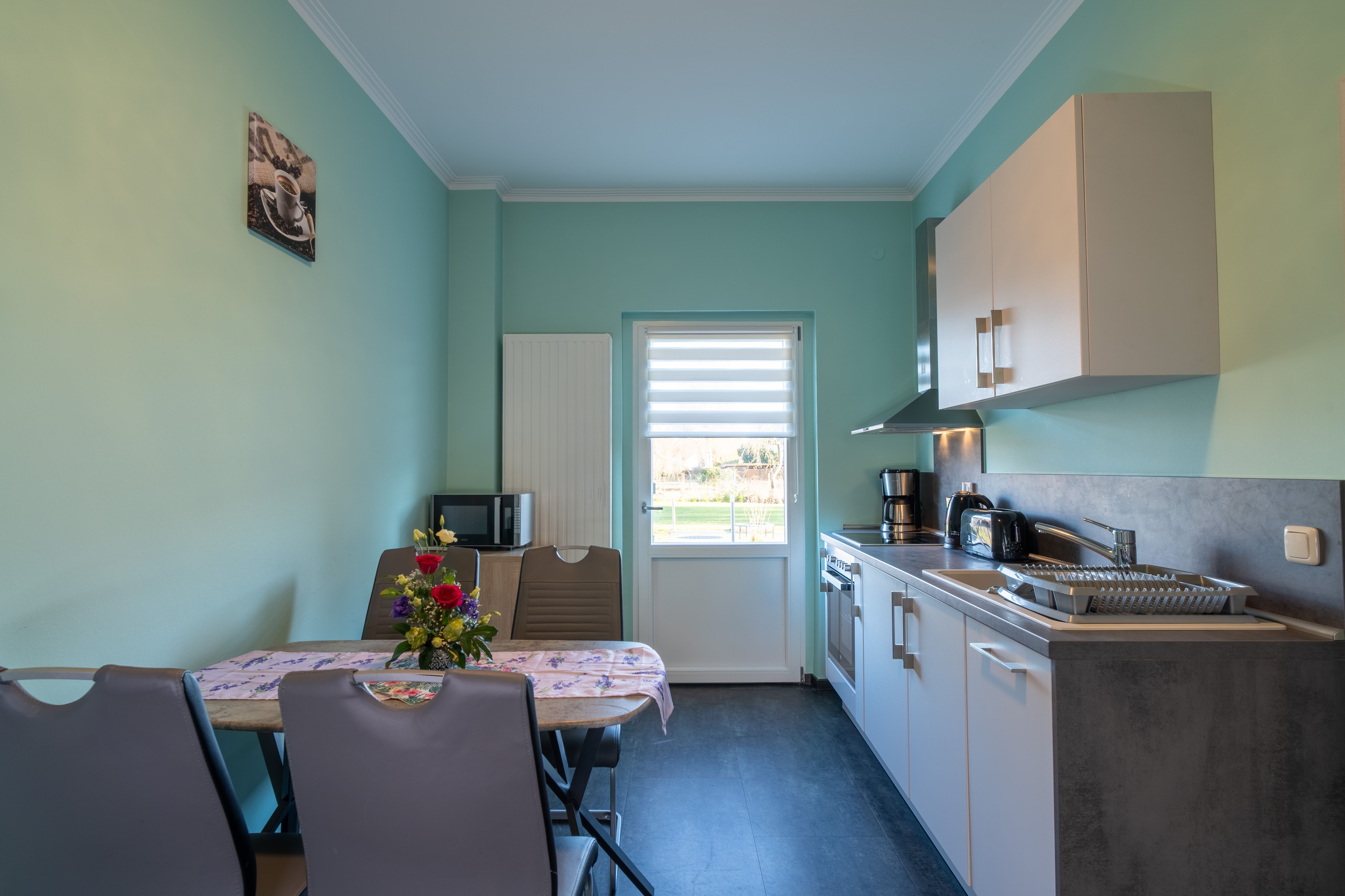 Die Küche hält alles für den Urlaub bereit, Cafémaschine, Wasserkocher, Toaster, Mikrowelle, Cerankochfelder lassen die Töpfe heiß werden, die Spülmaschine macht das Geschirr wieder sauber.