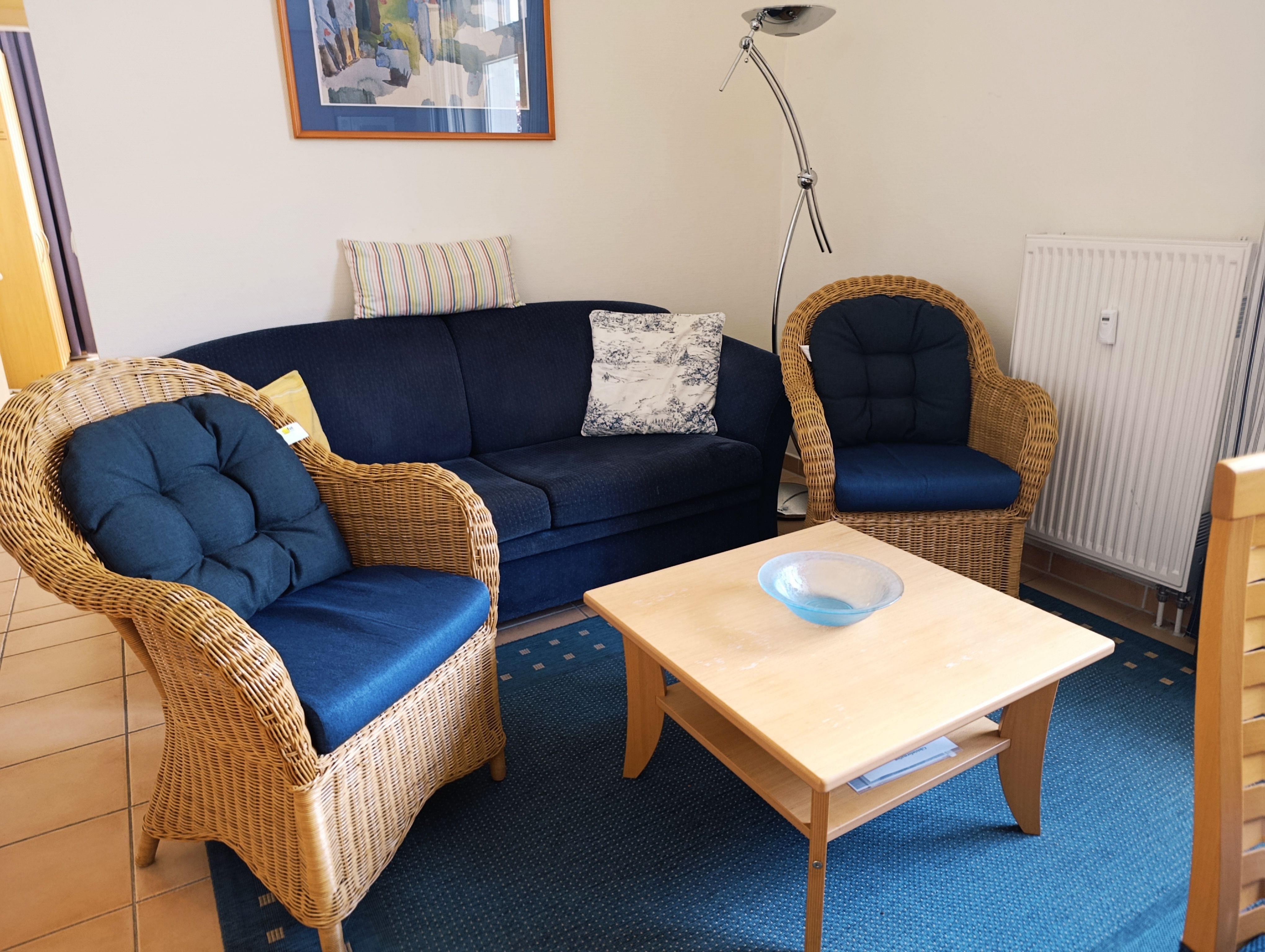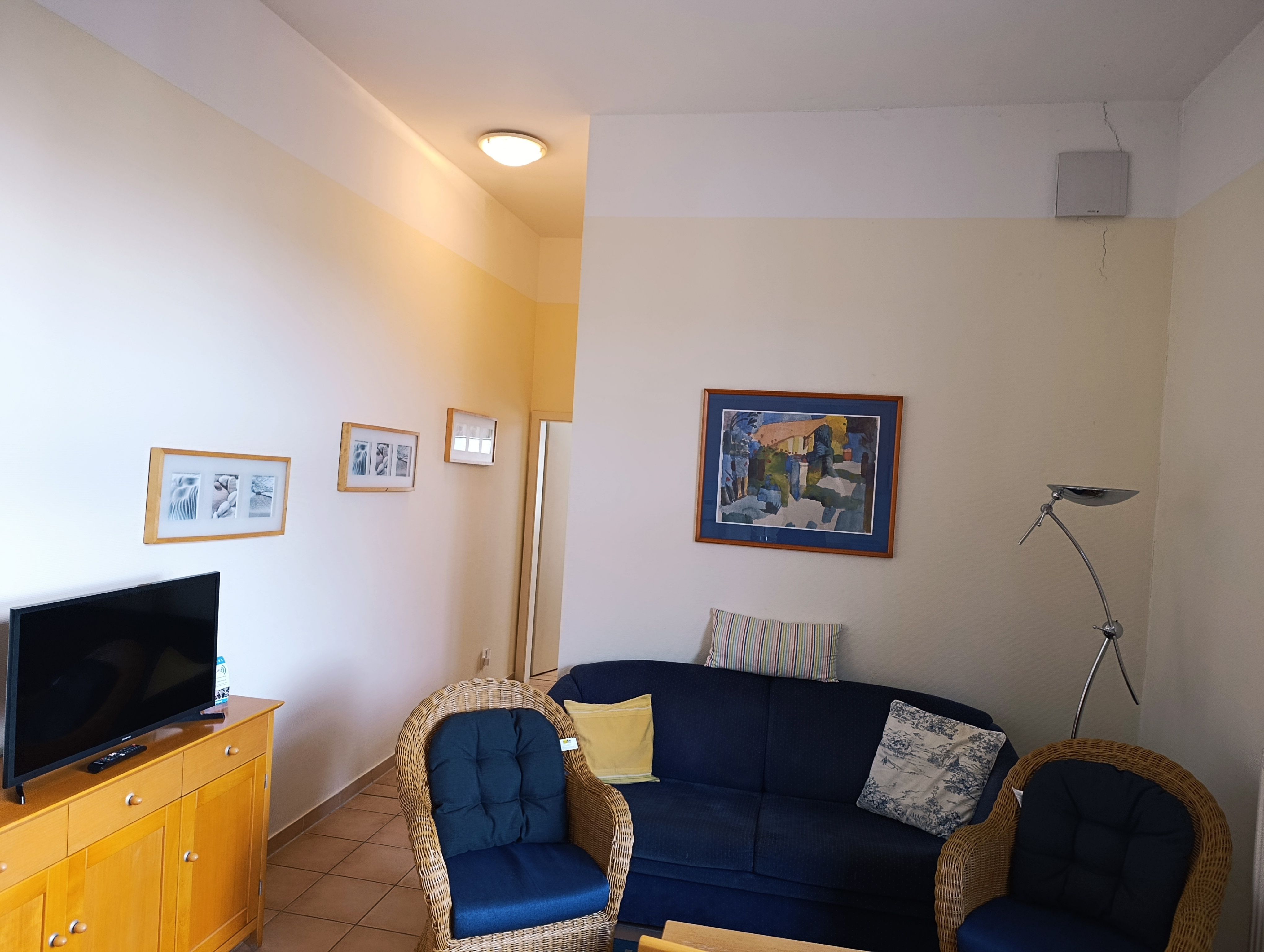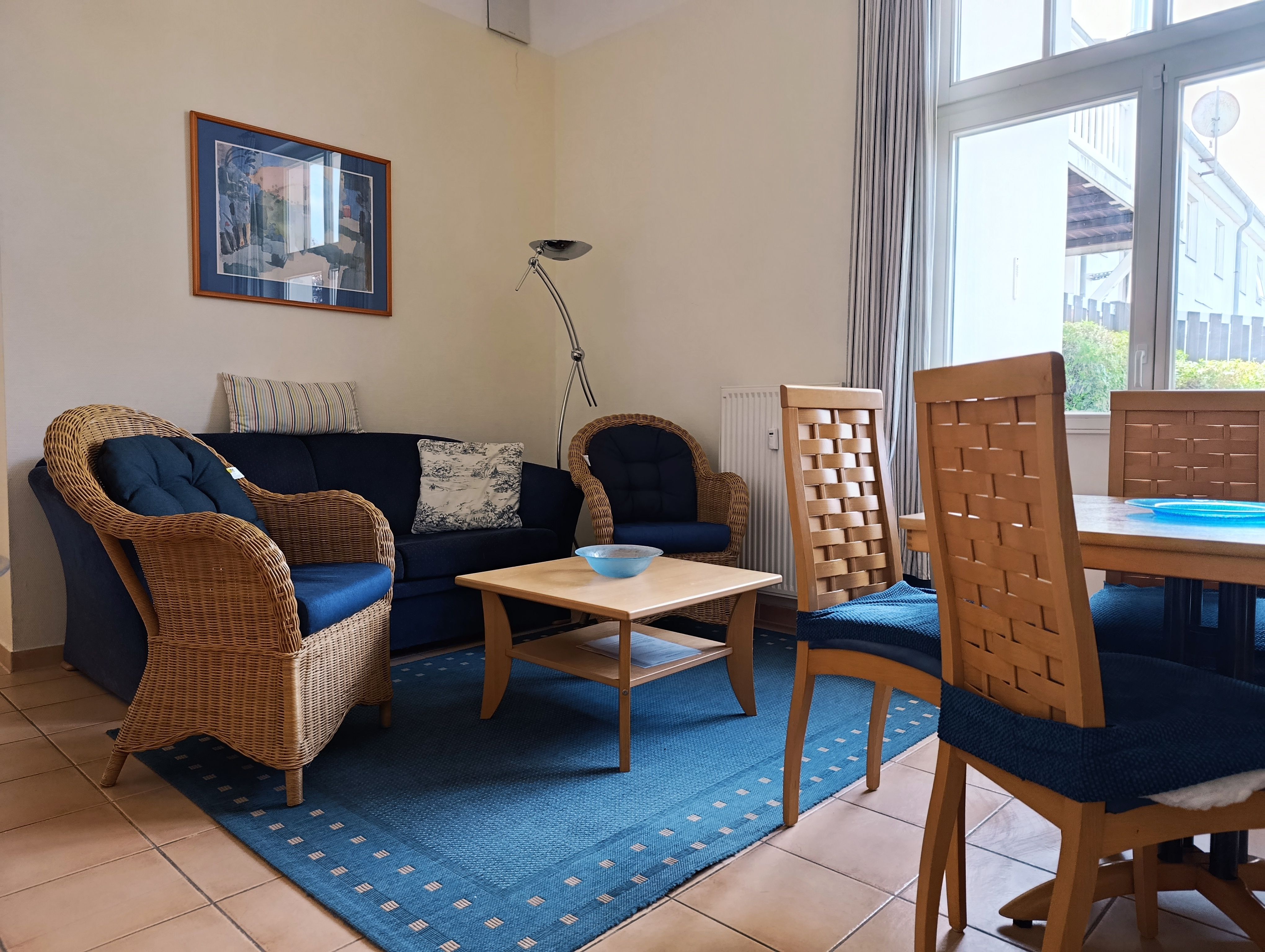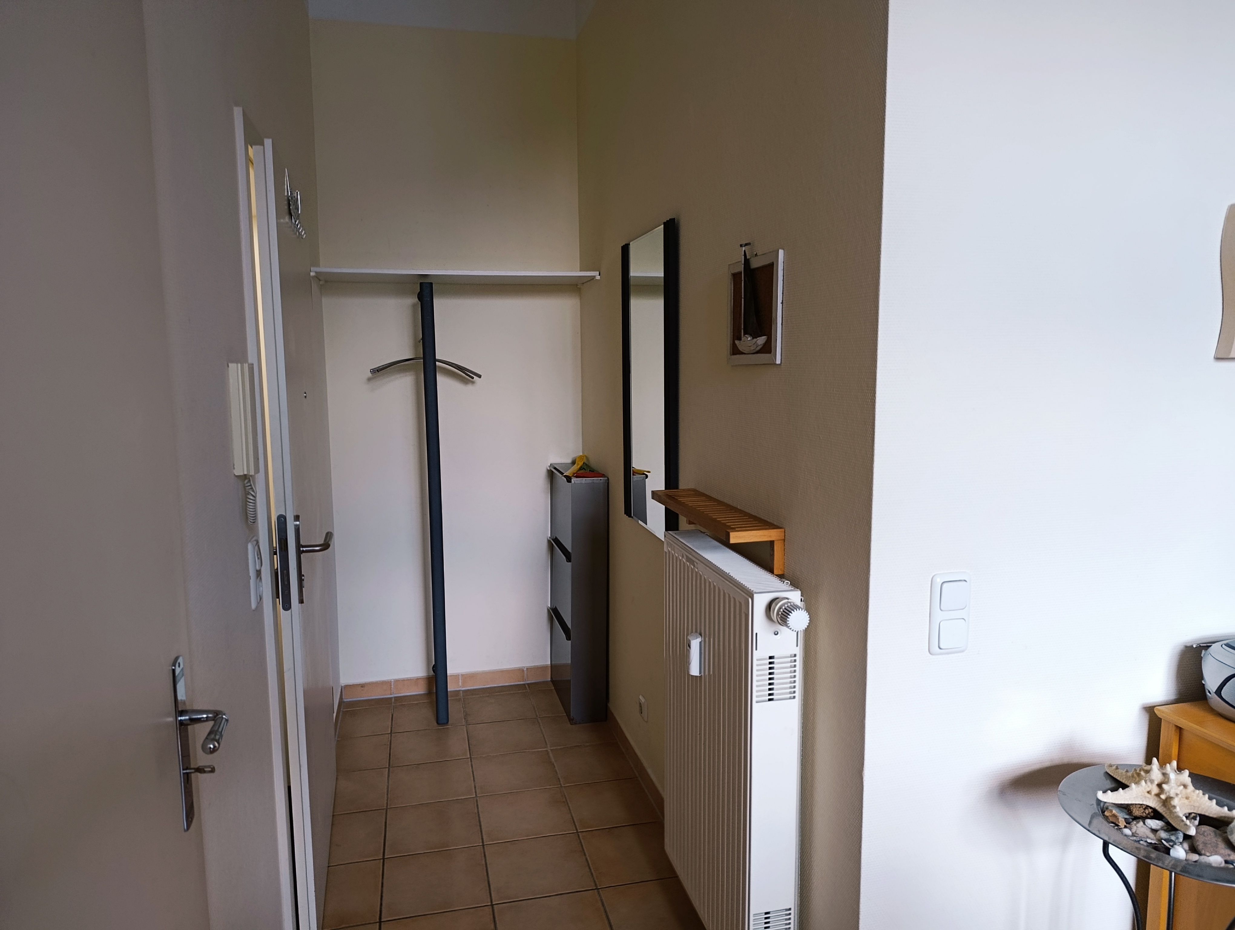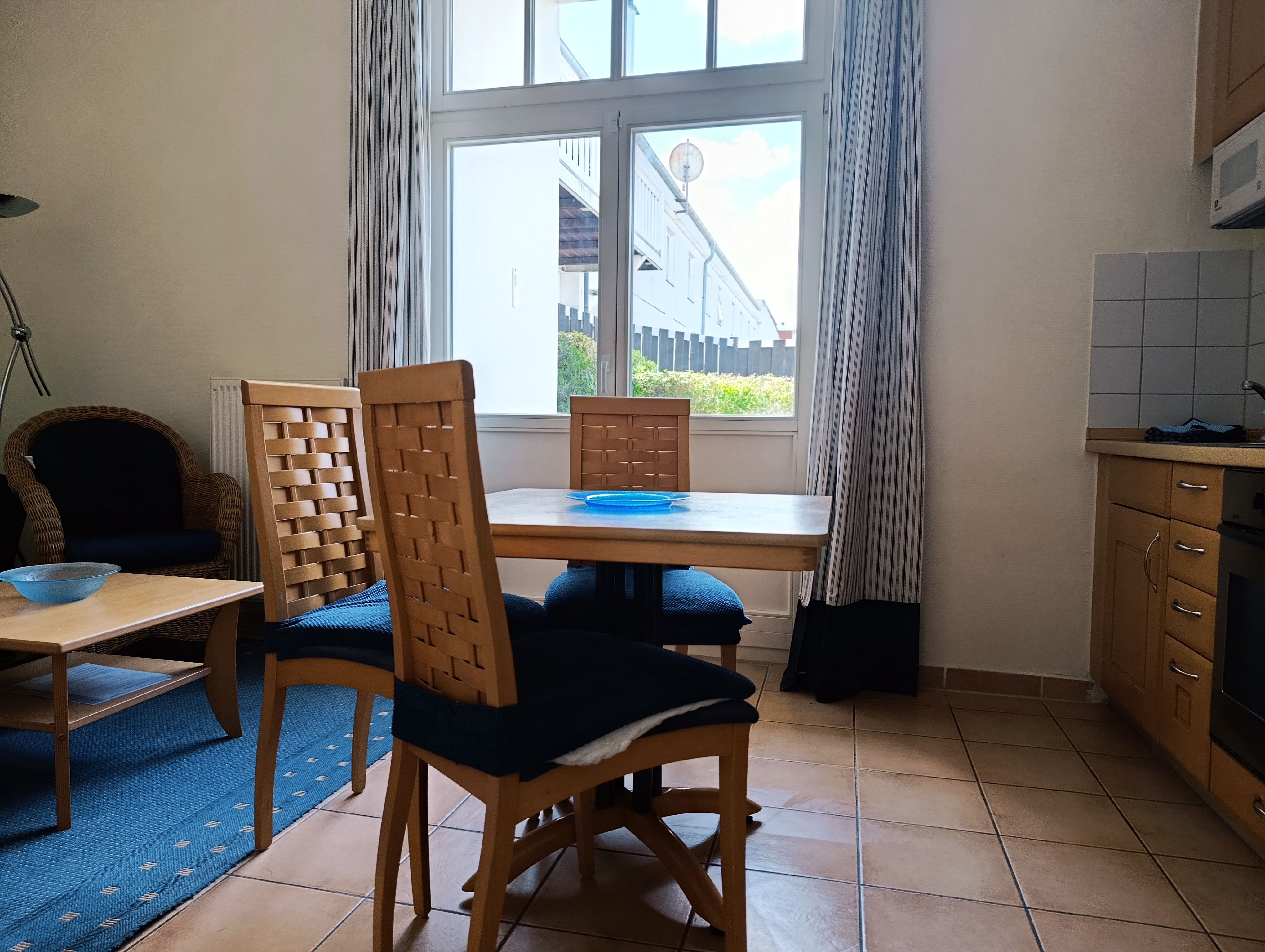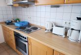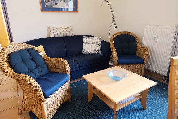 Nur 80 m vom Strand wohnen Sie in einer eingerichteten 2-Raum-Ferienwohnung. Die 40 qm große Wohnung liegt im Erdgeschoss. Das Wohnzimmer ist mit einer Schlafcouch, Couchtisch, Anrichte, Regal, Kabel-TV, Radio, Essbereich (Esstisch und 4 Stühle) und Küchenzeile ausgestattet. Die Küchenzeile wurde ausgestattet mit Mikrowelle, Kühlschrank, Kaffeemaschine, Zwei-Platten-Kochfeld, Toaster und Wasserkocher. Im nebengelegenden Schlafzimmer steht ein Doppelbett und ein Kleiderschrank. Das Bad mit Dusche und WC komplettiert die Wohnung. Die kleine Terrasse geht zur SüdWestseite.