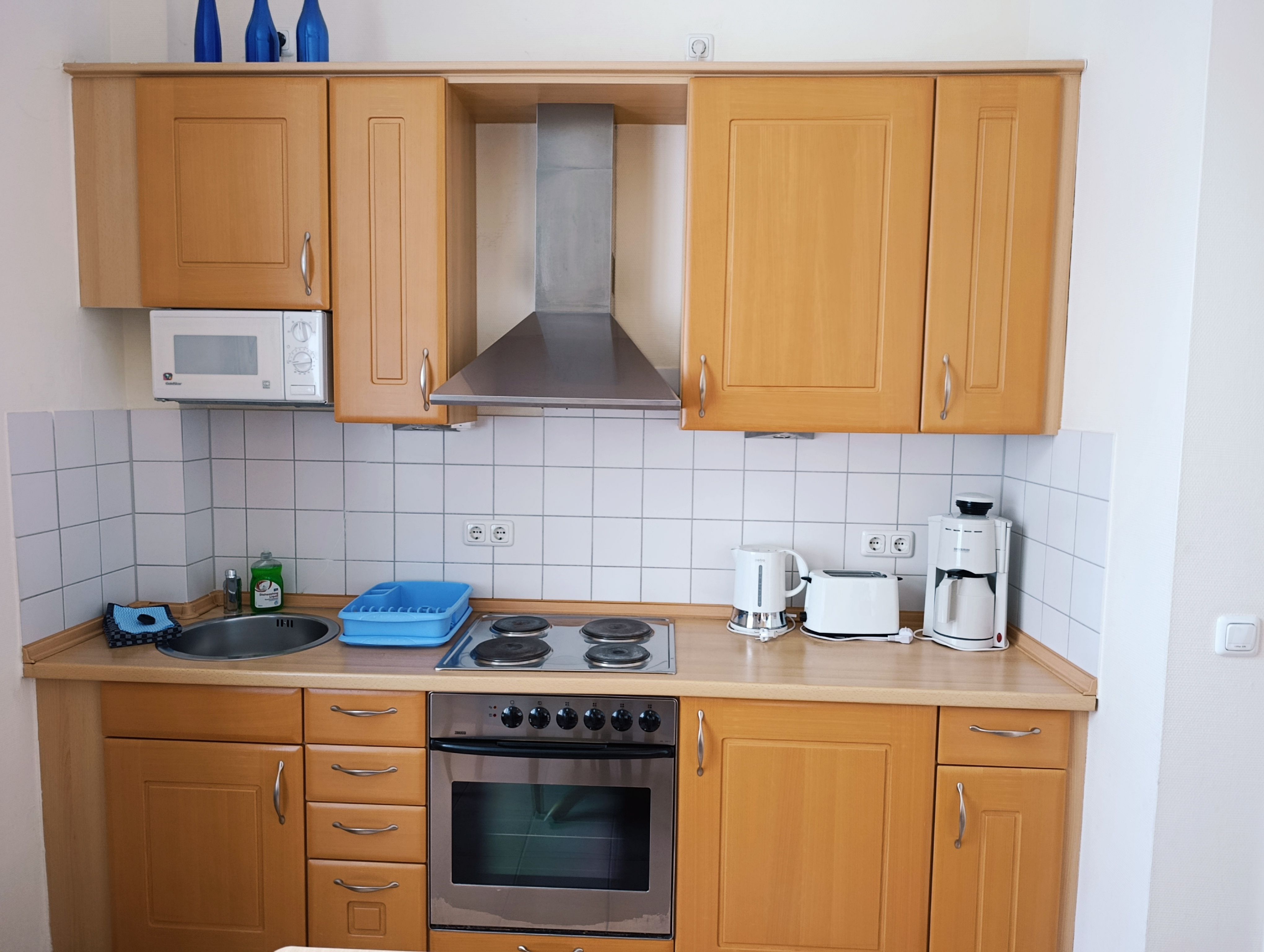 Küchenzeile mit Mikrowelle, Kühlschrank, Zweiplattenkochherd und Kaffeemaschine