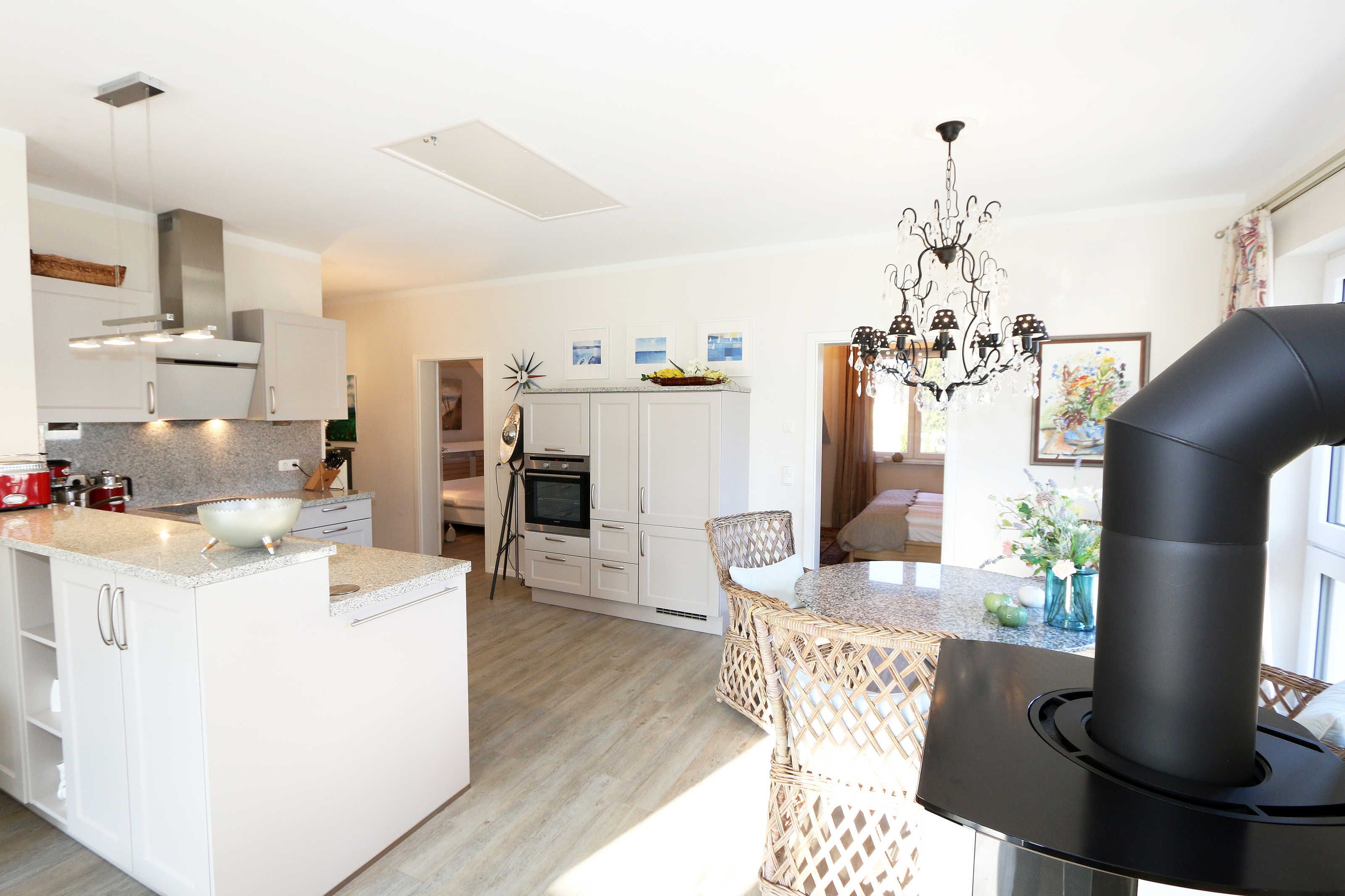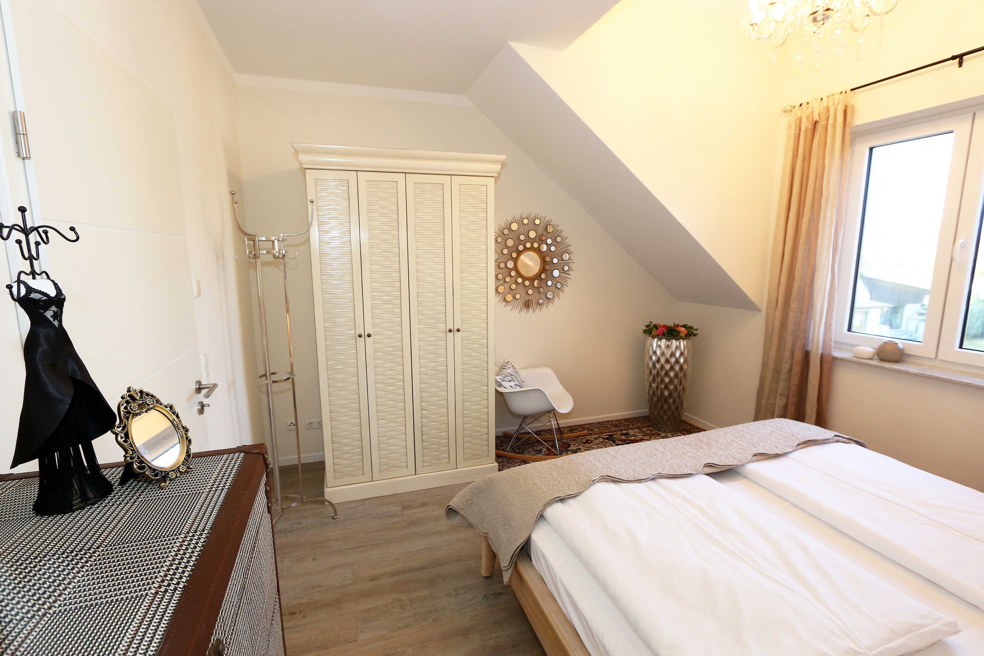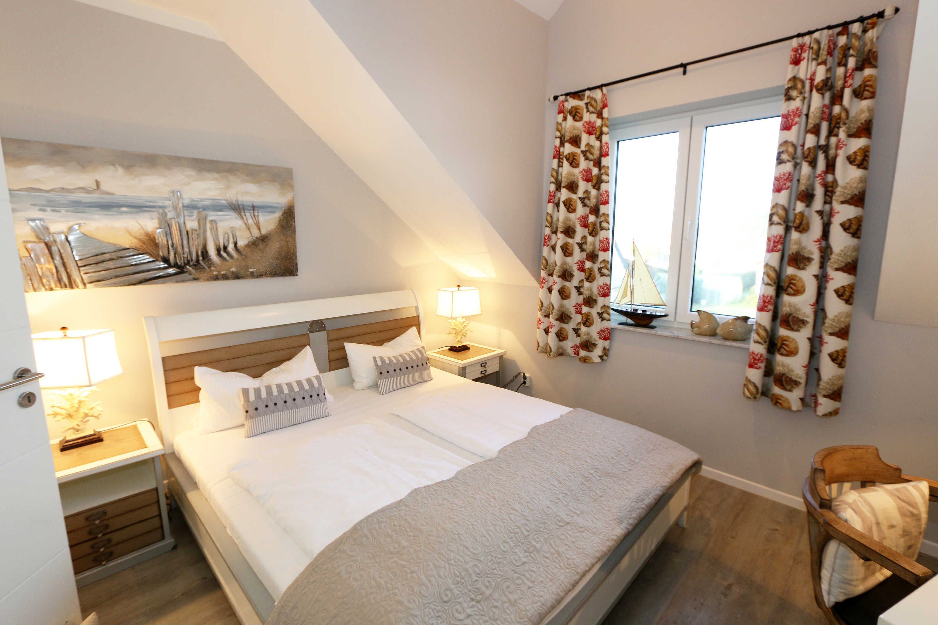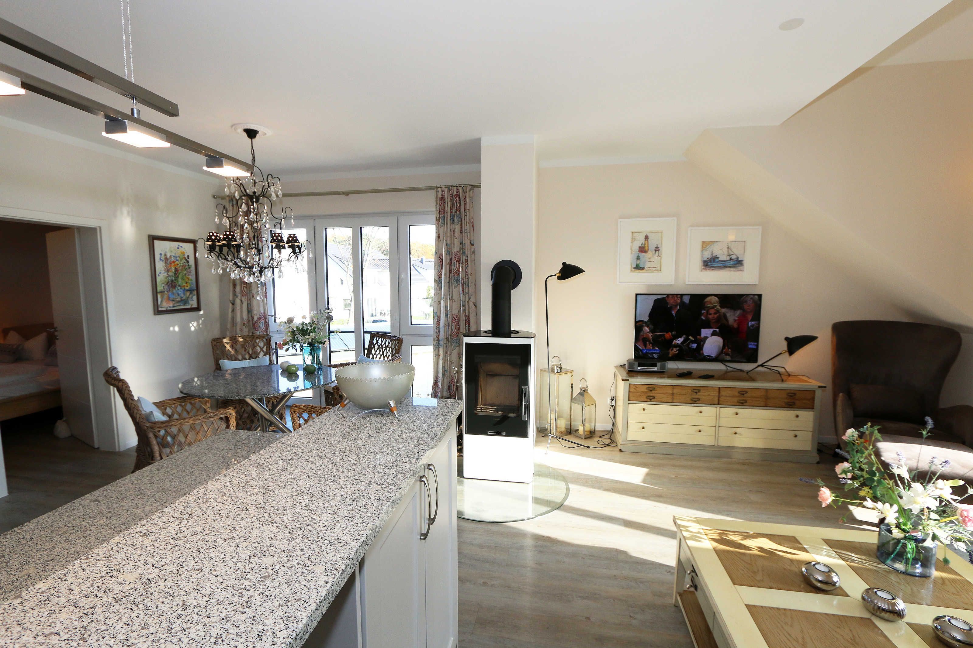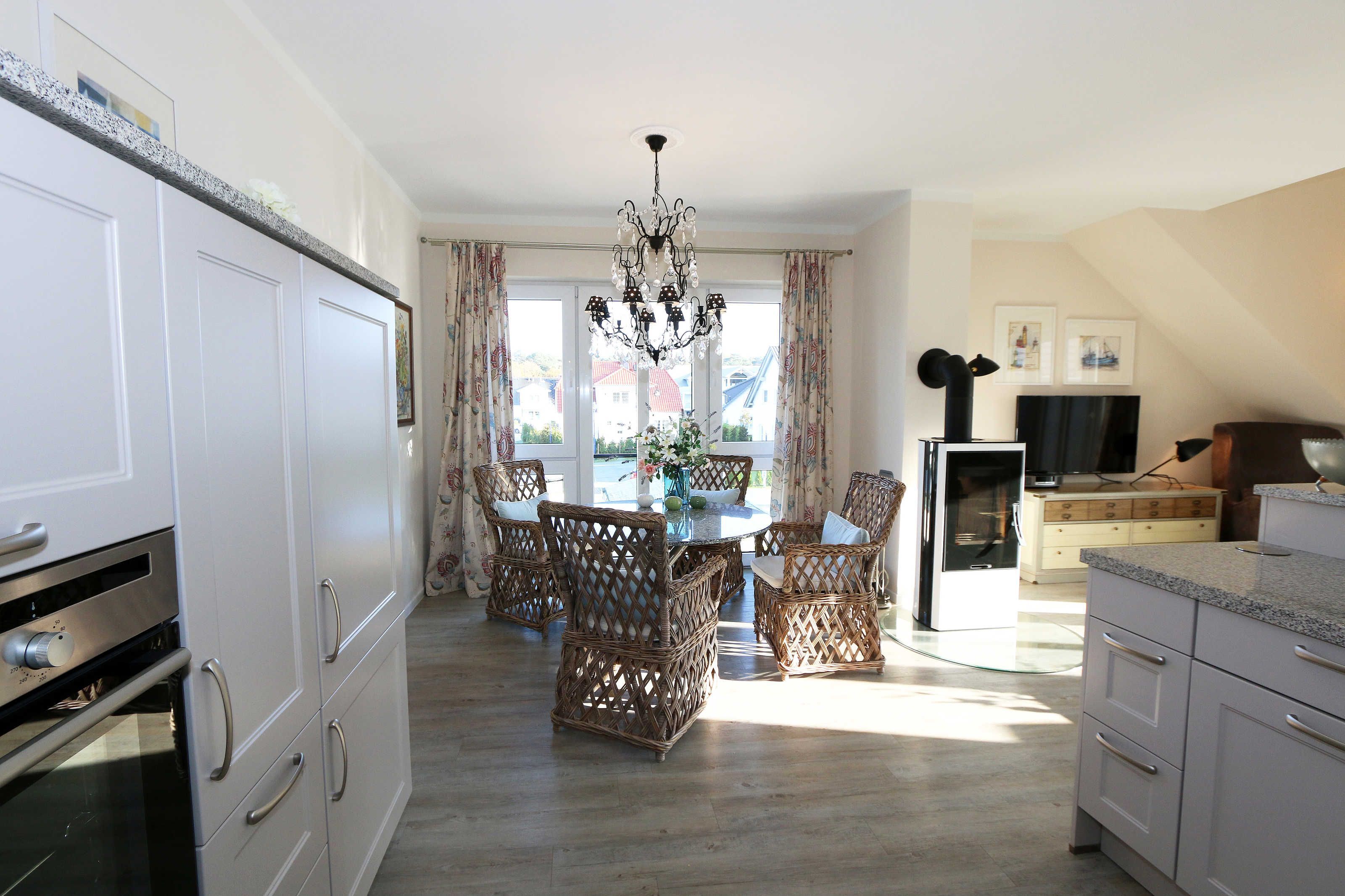 Die ca. 81m² große Ferienwohnung befindet sich im Dachgeschoss (1.OG) des Appartementhauses Sterntaucher. Die Nichtraucherwohnung wurde mit hochwertigen Massivholzmöbeln ausgestattet und bietet Ihnen ausreichend Platz für max. 2 bis 4 Erwachsene + 1 Kleinkind bis 3 Jahre im Kinderreisebett. Im Flur finden Sie eine maritime Garderobe mit einem Schuhschrank, einer Sitzbank, ein Highboard sowie einen Ganzkörperspiegel. Die gemütliche Sitzecke im Wohnbereich besteht aus einer bequemen Ledercouch, einem Ledersessel, einen Ohrensessel mit Hocker sowie einem Couchtisch. Ein Sideboard, ein Smart-TV mit Blu Ray-Player, ein Bose-Radio mit CD-Player, eine kleine CD-Auswahl, diverse Spiele, Bücher und Zeitschriften runden den Bereich ab. Auch auf einen Internetanschluss (WLAN) brauchen Sie im Urlaub nicht verzichten, dieser steht Ihnen inklusive zu Ihrer Verfügung. Eine angenehme und wohlige Wohnatmosphäre wird zusätzlich durch einen Kaminofen und verschiedene Lichtquellen geschaffen. Vom Wohnbereich gelangen Sie auf den überdachten und bestuhlten Süd-Balkon. Für die Gemütlichkeit sorgen ein zusätzlicher Strandkorb sowie ein Sonnenschirm. Innerhalb des offenen Wohn- und Essbereiches befindet sich die komfortable Einbau-Küche mit Granitarbeitsflächen, einem Induktionskochfeld mit Abzugshaube, einem Backofen, einer Mikrowelle, einem Geschirrspüler, einer Keramik-Spüle, einem Kühl- und Gefrierschrank, einem Toaster, einem Wasserkocher, einer Kaffeemaschine mit Thermoskanne, einer Lavazza - Espressomaschine sowie einem Milchaufschäumer, einem Mixer, einem Handrührgerät und weitere Küchenutensilien. Angrenzend befindet sich der Essplatz mit einem runden Granittisch und Korbstühlen. Das erste Schlafzimmer ist mit einem Doppelbett aus Korbgeflecht (1,80 m x 2,00 m), Nachttischablagen mit Tischleuchten, einem Kleiderschrank, einem Kleiderständer, einer Koffer-Kommode und einem kleinen Schaukelstuhl ausgestattet. Das zweite Schlafzimmer, welches im maritimen Stil ausgestattet ist, verfügt über ein Doppelbett (1,80 m x 2,00 m), Nachttischablagen mit Tischleuchten, einen Kleiderschrank und einen Schreibtisch. Abgerundet wird dieses Schlafzimmer mit einem zusätzlichen Flachbild-TV. Beide Schlafzimmer können mit Lammellenfensterläden verdunkelt werden. Im Tageslichtbad gibt es eine großzügige und ebenerdige Dusche mit Glastür, einen Waschtisch mit Einbau-Unterschrank, einen Spiegel, einen Fön, DAB-Radio, einen Vergrößerungsspiegel, einen Handtuchständer, ein WC, einen beheizbaren Handtuchtrockner sowie eine Waschmaschine und einen Trockner. Für unsere ganz kleinen Gäste dient eine Arbeitsplatte als Wickeltisch. Innerhalb des Bades befindet sich der Hauswirtschaftsraum. Hier finden Sie einen Wäscheständer, ein Bügeleisen mit Bügelbrett, einen Staubsauger, einen Hochstuhl, ein Kinderreisebett, Kinderbadewanne, Wickelunterlage, Kinder WC-Aufsatz sowie Reinigungsutensilien. Alle Böden, bis auf das Bad mit Fliesen, sind in der Wohnung mit Vinyldielen ausgestattet. Im Wohnbereich sowie in beiden Schlafzimmern befinden sich zusätzlich Insektenschutzgitter. Haustiere sind nicht erlaubt. Einen PKW-Stellplatz (Nr. 05) finden Sie direkt am Haus sowie einen Schuppen (Nr. 05), in dem Sie zwei Fahrräder unterstellen können. Zusätzlich können Sie hier auch Ihre E-Bikes aufladen. Die Erstausstattung eines Wäschepaketes (komplette Bettwäsche, 1 Duschhandtuch, 2 kleine Handtücher) können Sie bis 14 Tage vor Anreise gegen einen Aufpreis dazu buchen oder durch eigene ergänzen. Ab 2 gebuchten Paketen erhalten Sie einmalig 1 Geschirrhandtuch und 1 Duschvorleger hinzu.