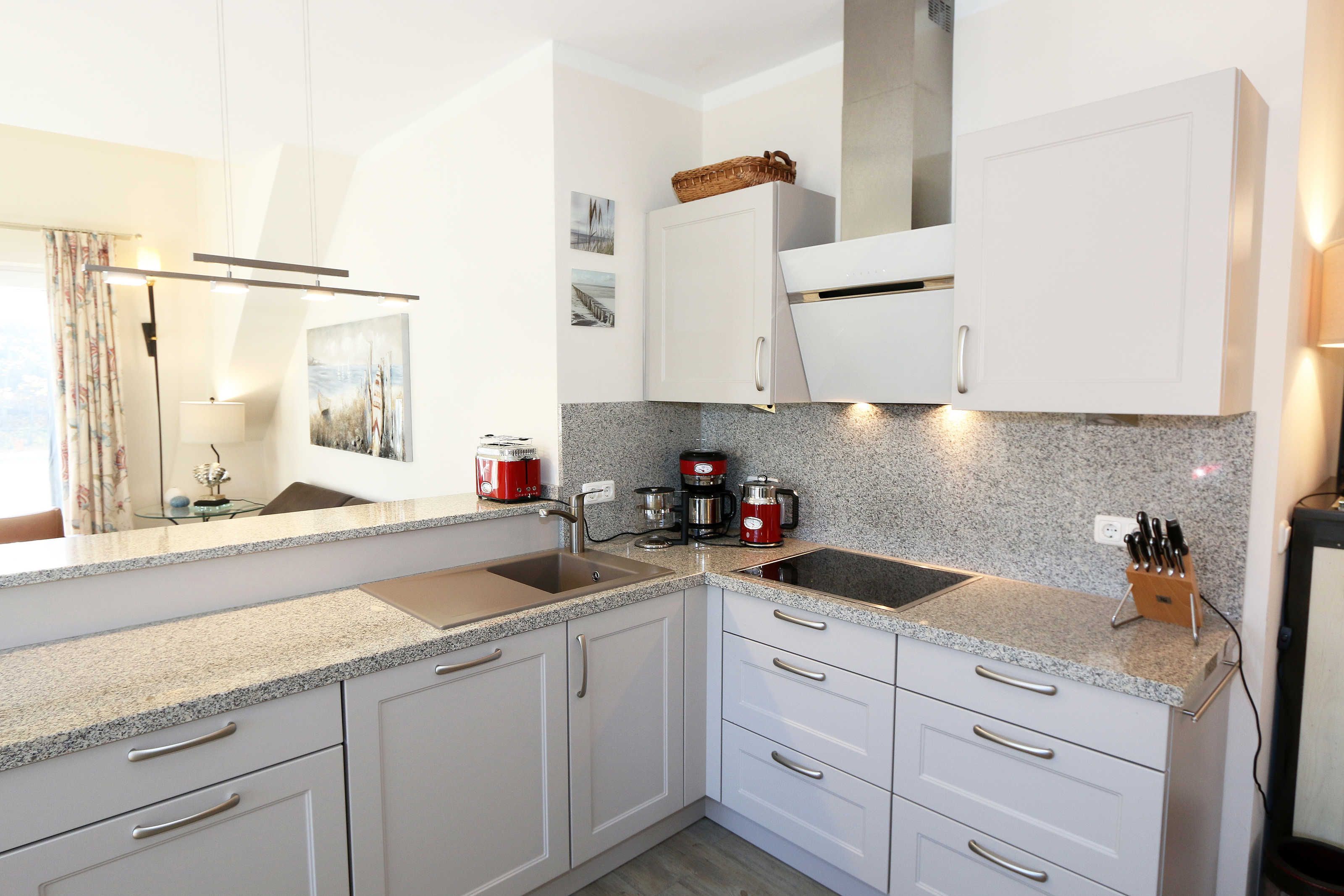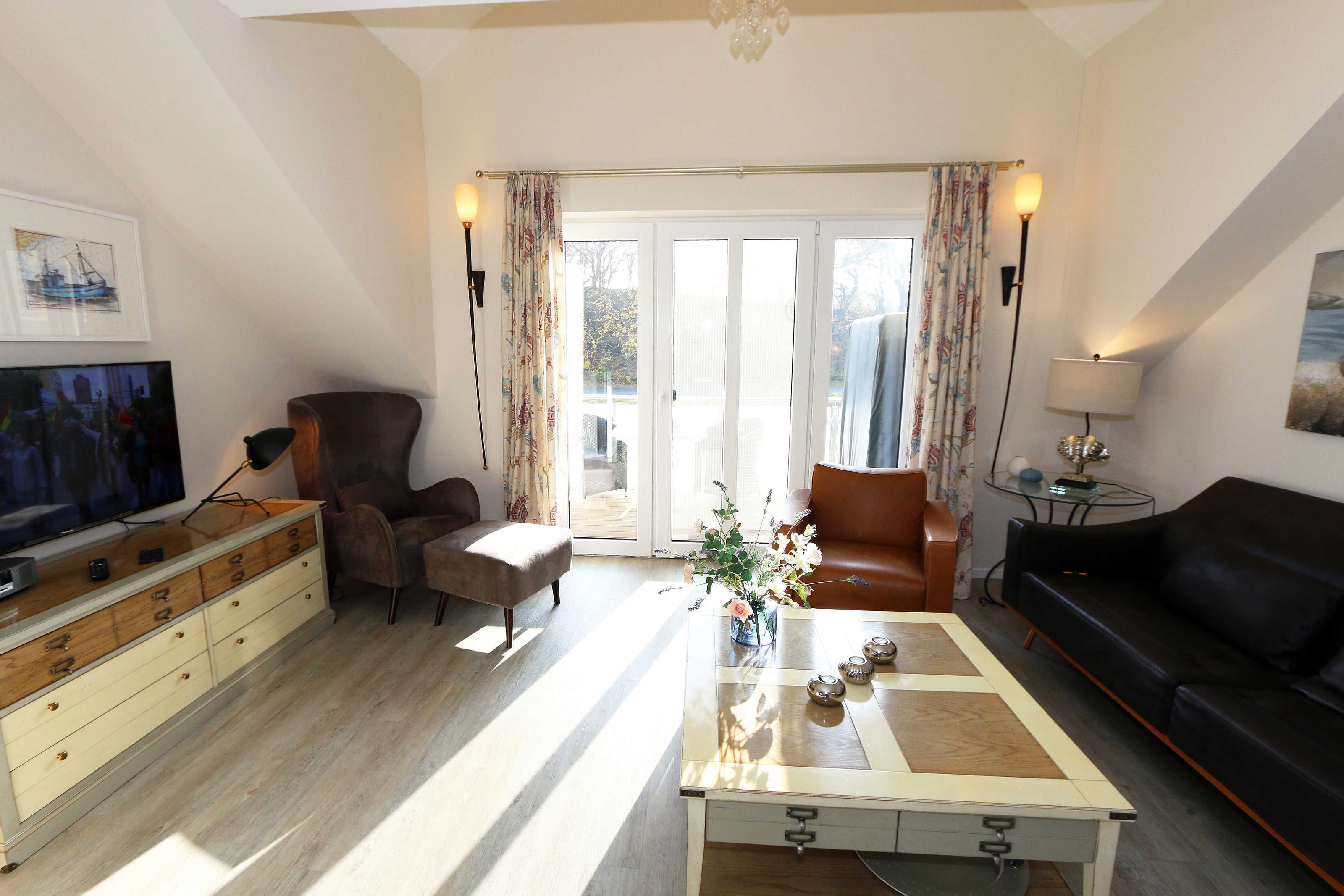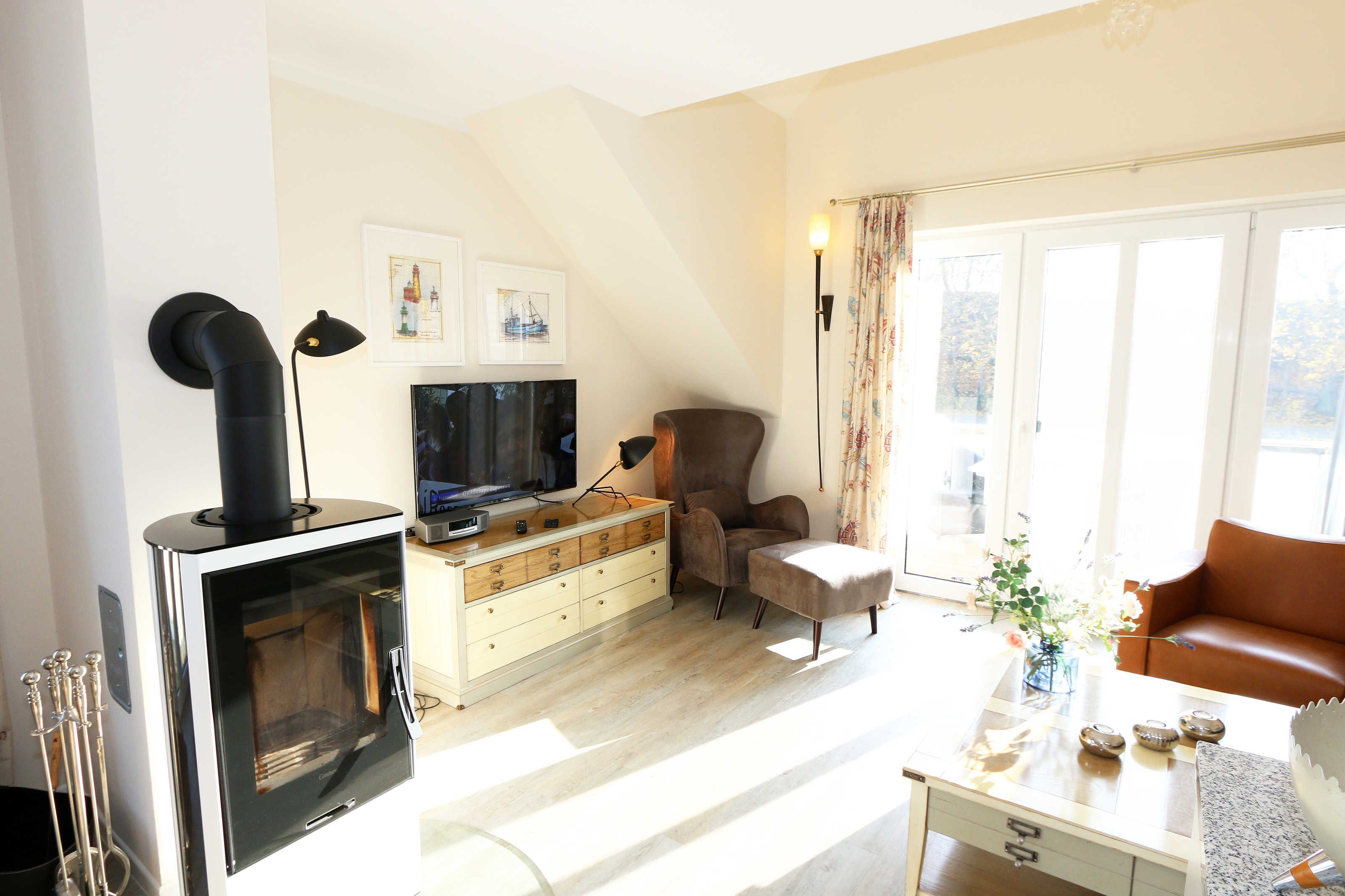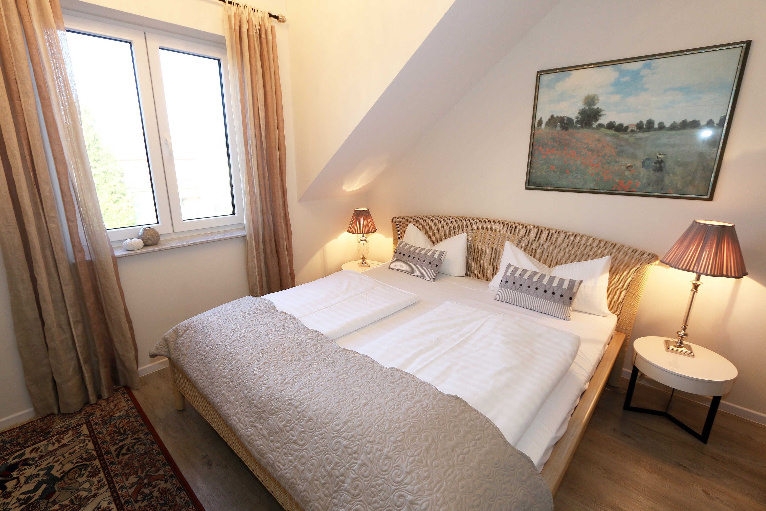 Die ca. 81m² große Ferienwohnung befindet sich im Dachgeschoss (1.OG) des Appartementhauses Sterntaucher. Die Nichtraucherwohnung wurde mit hochwertigen Massivholzmöbeln ausgestattet und bietet Ihnen ausreichend Platz für max. 2 bis 4 Erwachsene + 1 Kleinkind bis 3 Jahre im Kinderreisebett. Im Flur finden Sie eine maritime Garderobe mit einem Schuhschrank, einer Sitzbank, ein Highboard sowie einen Ganzkörperspiegel. Die gemütliche Sitzecke im Wohnbereich besteht aus einer bequemen Ledercouch, einem Ledersessel, einen Ohrensessel mit Hocker sowie einem Couchtisch. Ein Sideboard, ein Smart-TV mit Blu Ray-Player, ein Bose-Radio mit CD-Player, eine kleine CD-Auswahl, diverse Spiele, Bücher und Zeitschriften runden den Bereich ab. Auch auf einen Internetanschluss (WLAN) brauchen Sie im Urlaub nicht verzichten, dieser steht Ihnen inklusive zu Ihrer Verfügung. Eine angenehme und wohlige Wohnatmosphäre wird zusätzlich durch einen Kaminofen und verschiedene Lichtquellen geschaffen. Vom Wohnbereich gelangen Sie auf den überdachten und bestuhlten Süd-Balkon. Für die Gemütlichkeit sorgen ein zusätzlicher Strandkorb sowie ein Sonnenschirm. Innerhalb des offenen Wohn- und Essbereiches befindet sich die komfortable Einbau-Küche mit Granitarbeitsflächen, einem Induktionskochfeld mit Abzugshaube, einem Backofen, einer Mikrowelle, einem Geschirrspüler, einer Keramik-Spüle, einem Kühl- und Gefrierschrank, einem Toaster, einem Wasserkocher, einer Kaffeemaschine mit Thermoskanne, einer Lavazza - Espressomaschine sowie einem Milchaufschäumer, einem Mixer, einem Handrührgerät und weitere Küchenutensilien. Angrenzend befindet sich der Essplatz mit einem runden Granittisch und Korbstühlen. Das erste Schlafzimmer ist mit einem Doppelbett aus Korbgeflecht (1,80 m x 2,00 m), Nachttischablagen mit Tischleuchten, einem Kleiderschrank, einem Kleiderständer, einer Koffer-Kommode und einem kleinen Schaukelstuhl ausgestattet. Das zweite Schlafzimmer, welches im maritimen Stil ausgestattet ist, verfügt über ein Doppelbett (1,80 m x 2,00 m), Nachttischablagen mit Tischleuchten, einen Kleiderschrank und einen Schreibtisch. Abgerundet wird dieses Schlafzimmer mit einem zusätzlichen Flachbild-TV. Beide Schlafzimmer können mit Lammellenfensterläden verdunkelt werden. Im Tageslichtbad gibt es eine großzügige und ebenerdige Dusche mit Glastür, einen Waschtisch mit Einbau-Unterschrank, einen Spiegel, einen Fön, DAB-Radio, einen Vergrößerungsspiegel, einen Handtuchständer, ein WC, einen beheizbaren Handtuchtrockner sowie eine Waschmaschine und einen Trockner. Für unsere ganz kleinen Gäste dient eine Arbeitsplatte als Wickeltisch. Innerhalb des Bades befindet sich der Hauswirtschaftsraum. Hier finden Sie einen Wäscheständer, ein Bügeleisen mit Bügelbrett, einen Staubsauger, einen Hochstuhl, ein Kinderreisebett, Kinderbadewanne, Wickelunterlage, Kinder WC-Aufsatz sowie Reinigungsutensilien. Alle Böden, bis auf das Bad mit Fliesen, sind in der Wohnung mit Vinyldielen ausgestattet. Im Wohnbereich sowie in beiden Schlafzimmern befinden sich zusätzlich Insektenschutzgitter. Haustiere sind nicht erlaubt. Einen PKW-Stellplatz (Nr. 05) finden Sie direkt am Haus sowie einen Schuppen (Nr. 05), in dem Sie zwei Fahrräder unterstellen können. Zusätzlich können Sie hier auch Ihre E-Bikes aufladen. Die Erstausstattung eines Wäschepaketes (komplette Bettwäsche, 1 Duschhandtuch, 2 kleine Handtücher) können Sie bis 14 Tage vor Anreise gegen einen Aufpreis dazu buchen oder durch eigene ergänzen. Ab 2 gebuchten Paketen erhalten Sie einmalig 1 Geschirrhandtuch und 1 Duschvorleger hinzu.