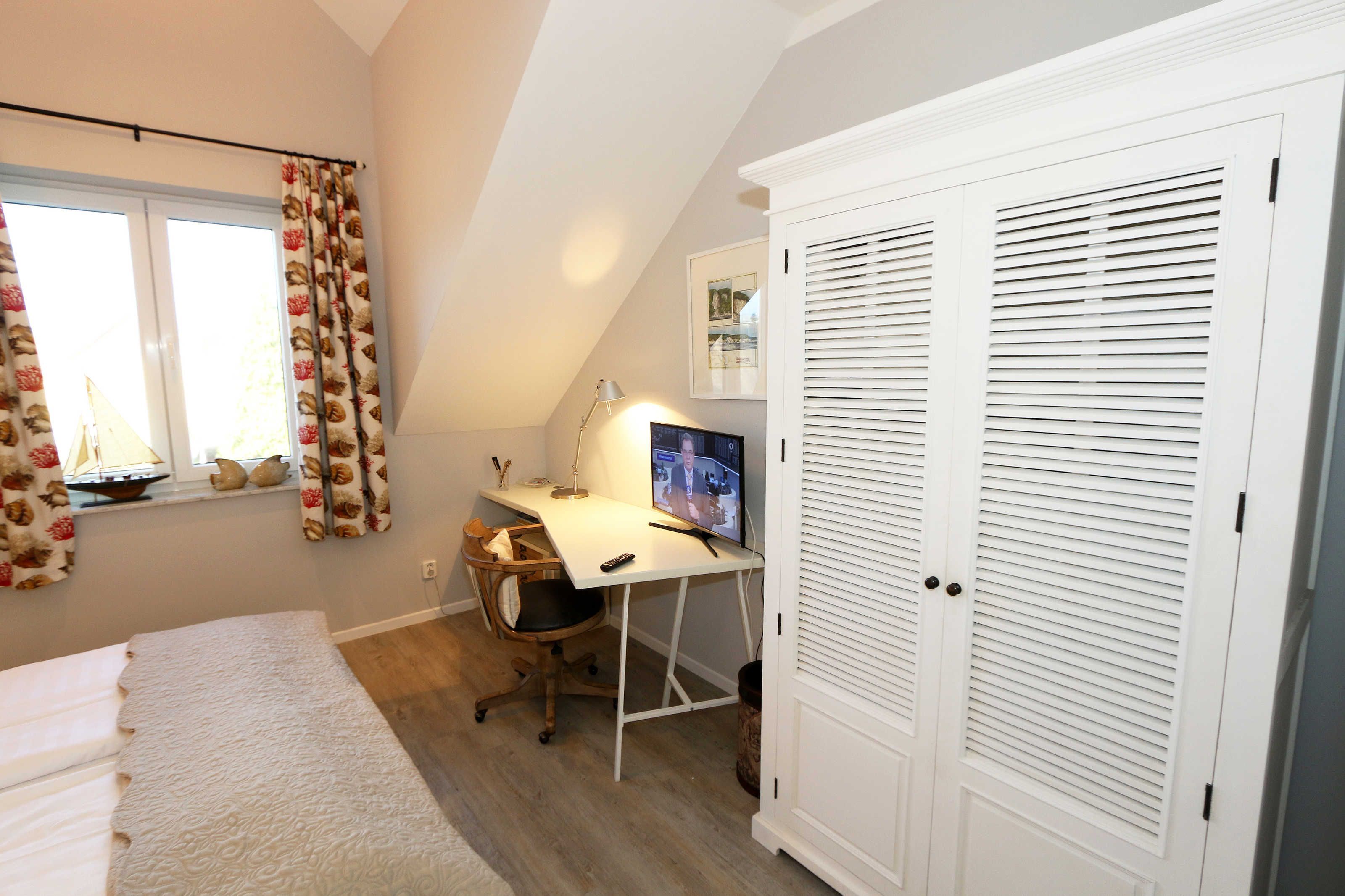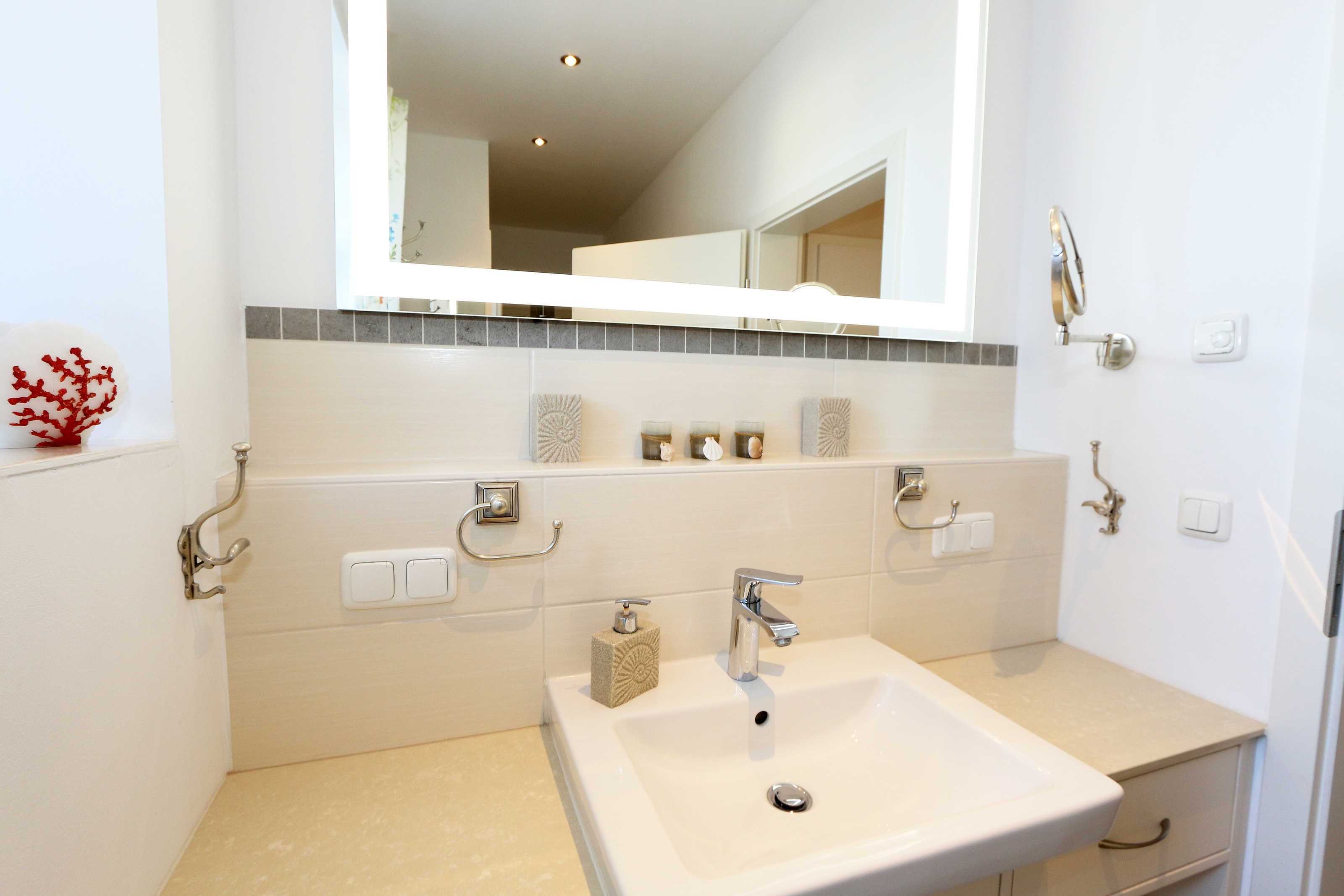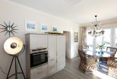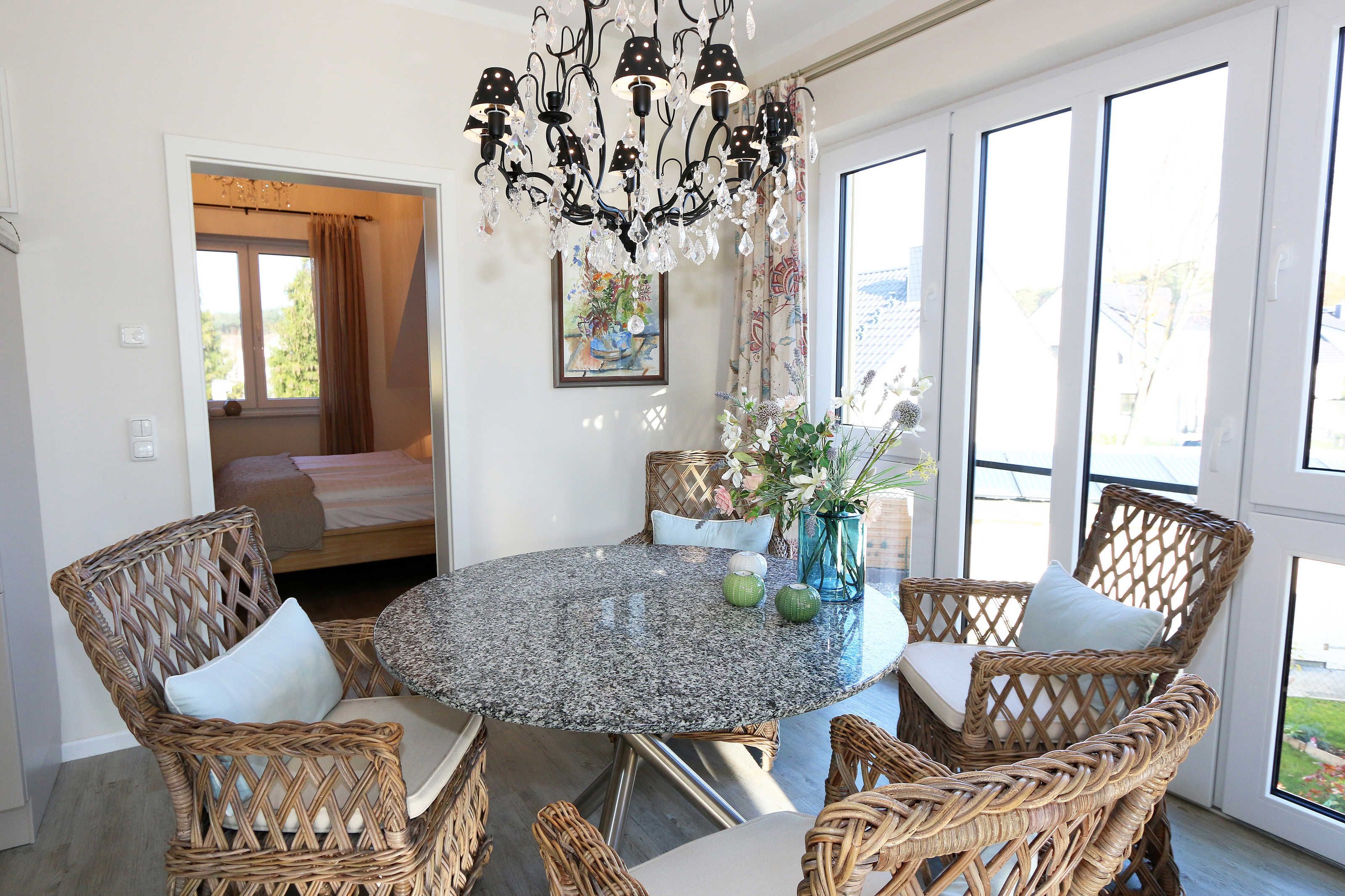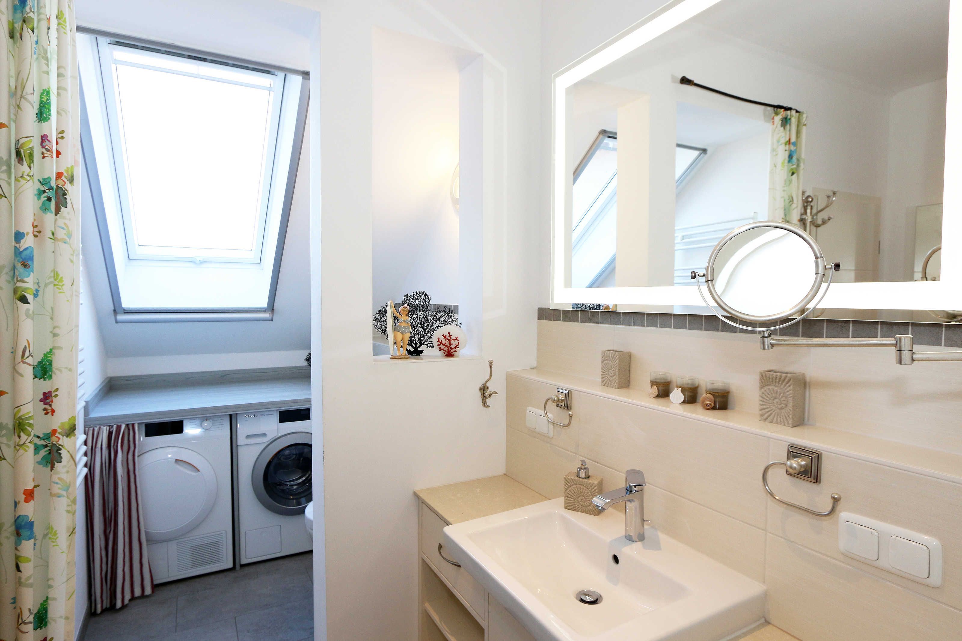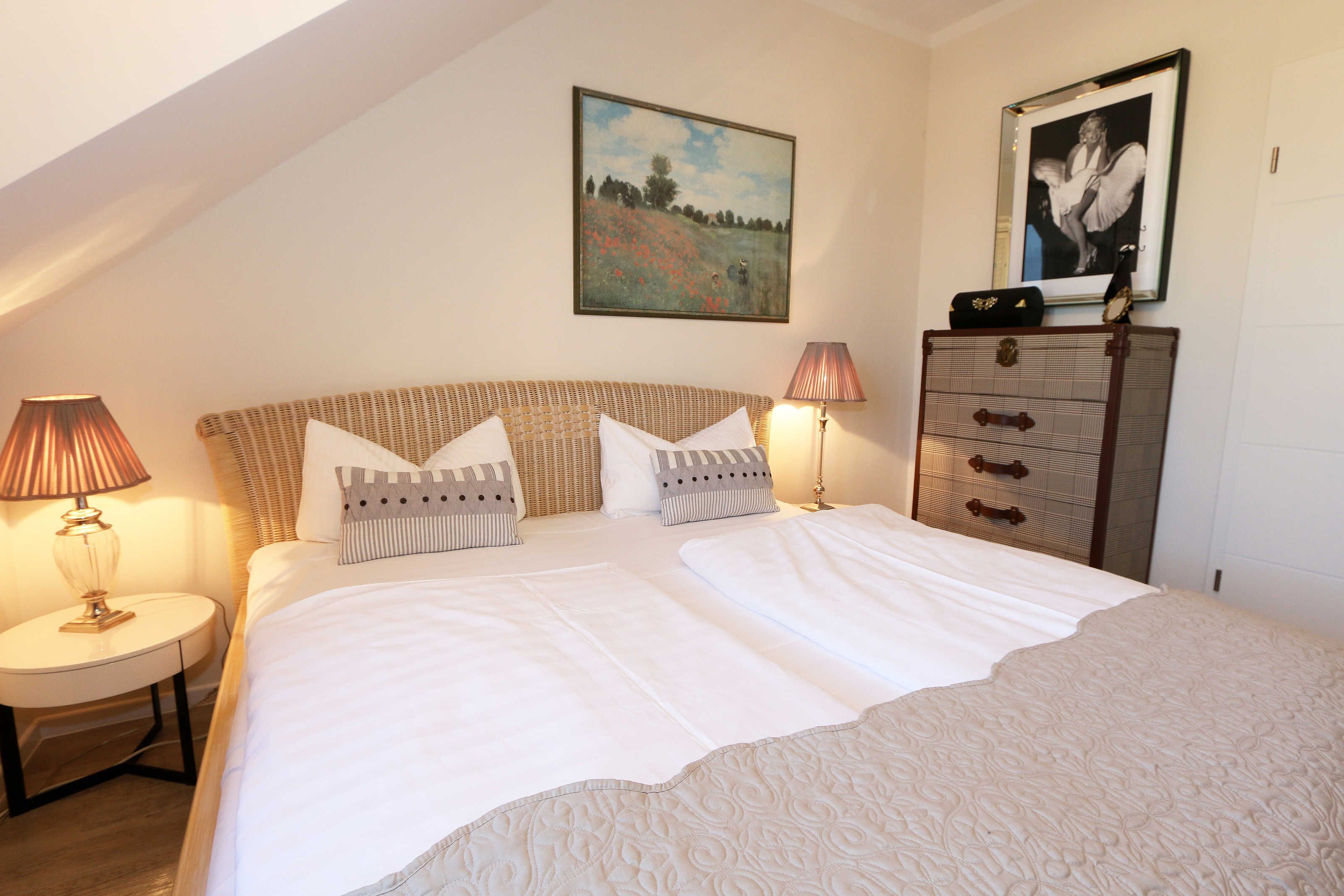 Die ca. 81m² große Ferienwohnung befindet sich im Dachgeschoss (1.OG) des Appartementhauses Sterntaucher. Die Nichtraucherwohnung wurde mit hochwertigen Massivholzmöbeln ausgestattet und bietet Ihnen ausreichend Platz für max. 2 bis 4 Erwachsene + 1 Kleinkind bis 3 Jahre im Kinderreisebett. Im Flur finden Sie eine maritime Garderobe mit einem Schuhschrank, einer Sitzbank, ein Highboard sowie einen Ganzkörperspiegel. Die gemütliche Sitzecke im Wohnbereich besteht aus einer bequemen Ledercouch, einem Ledersessel, einen Ohrensessel mit Hocker sowie einem Couchtisch. Ein Sideboard, ein Smart-TV mit Blu Ray-Player, ein Bose-Radio mit CD-Player, eine kleine CD-Auswahl, diverse Spiele, Bücher und Zeitschriften runden den Bereich ab. Auch auf einen Internetanschluss (WLAN) brauchen Sie im Urlaub nicht verzichten, dieser steht Ihnen inklusive zu Ihrer Verfügung. Eine angenehme und wohlige Wohnatmosphäre wird zusätzlich durch einen Kaminofen und verschiedene Lichtquellen geschaffen. Vom Wohnbereich gelangen Sie auf den überdachten und bestuhlten Süd-Balkon. Für die Gemütlichkeit sorgen ein zusätzlicher Strandkorb sowie ein Sonnenschirm. Innerhalb des offenen Wohn- und Essbereiches befindet sich die komfortable Einbau-Küche mit Granitarbeitsflächen, einem Induktionskochfeld mit Abzugshaube, einem Backofen, einer Mikrowelle, einem Geschirrspüler, einer Keramik-Spüle, einem Kühl- und Gefrierschrank, einem Toaster, einem Wasserkocher, einer Kaffeemaschine mit Thermoskanne, einer Lavazza - Espressomaschine sowie einem Milchaufschäumer, einem Mixer, einem Handrührgerät und weitere Küchenutensilien. Angrenzend befindet sich der Essplatz mit einem runden Granittisch und Korbstühlen. Das erste Schlafzimmer ist mit einem Doppelbett aus Korbgeflecht (1,80 m x 2,00 m), Nachttischablagen mit Tischleuchten, einem Kleiderschrank, einem Kleiderständer, einer Koffer-Kommode und einem kleinen Schaukelstuhl ausgestattet. Das zweite Schlafzimmer, welches im maritimen Stil ausgestattet ist, verfügt über ein Doppelbett (1,80 m x 2,00 m), Nachttischablagen mit Tischleuchten, einen Kleiderschrank und einen Schreibtisch. Abgerundet wird dieses Schlafzimmer mit einem zusätzlichen Flachbild-TV. Beide Schlafzimmer können mit Lammellenfensterläden verdunkelt werden. Im Tageslichtbad gibt es eine großzügige und ebenerdige Dusche mit Glastür, einen Waschtisch mit Einbau-Unterschrank, einen Spiegel, einen Fön, DAB-Radio, einen Vergrößerungsspiegel, einen Handtuchständer, ein WC, einen beheizbaren Handtuchtrockner sowie eine Waschmaschine und einen Trockner. Für unsere ganz kleinen Gäste dient eine Arbeitsplatte als Wickeltisch. Innerhalb des Bades befindet sich der Hauswirtschaftsraum. Hier finden Sie einen Wäscheständer, ein Bügeleisen mit Bügelbrett, einen Staubsauger, einen Hochstuhl, ein Kinderreisebett, Kinderbadewanne, Wickelunterlage, Kinder WC-Aufsatz sowie Reinigungsutensilien. Alle Böden, bis auf das Bad mit Fliesen, sind in der Wohnung mit Vinyldielen ausgestattet. Im Wohnbereich sowie in beiden Schlafzimmern befinden sich zusätzlich Insektenschutzgitter. Haustiere sind nicht erlaubt. Einen PKW-Stellplatz (Nr. 05) finden Sie direkt am Haus sowie einen Schuppen (Nr. 05), in dem Sie zwei Fahrräder unterstellen können. Zusätzlich können Sie hier auch Ihre E-Bikes aufladen. Die Erstausstattung eines Wäschepaketes (komplette Bettwäsche, 1 Duschhandtuch, 2 kleine Handtücher) können Sie bis 14 Tage vor Anreise gegen einen Aufpreis dazu buchen oder durch eigene ergänzen. Ab 2 gebuchten Paketen erhalten Sie einmalig 1 Geschirrhandtuch und 1 Duschvorleger hinzu.