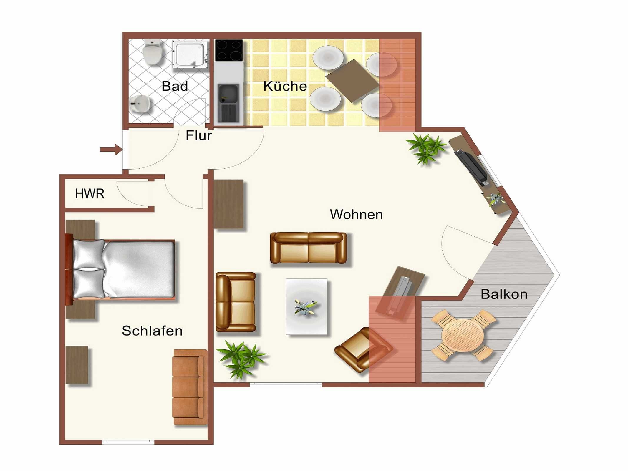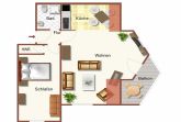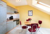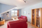 Die 2 Zimmer Dachgeschoss-Wohnung  verfügt über 1 Schlafzimmer mit Doppelbett und Schlafsofa, 1 Wohnzimmer mit Balkon und offener Küche, sowie Bad mit Dusche.