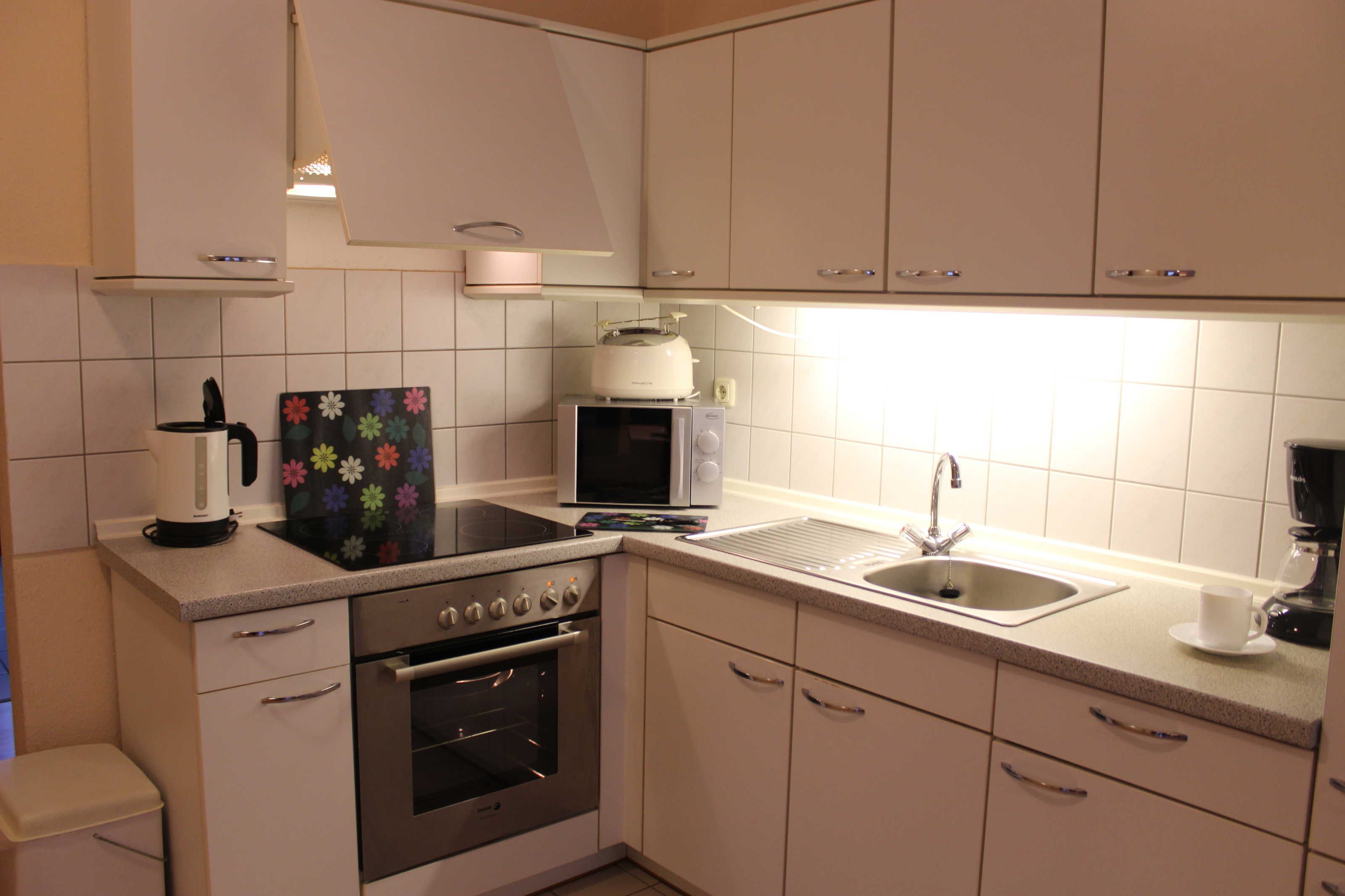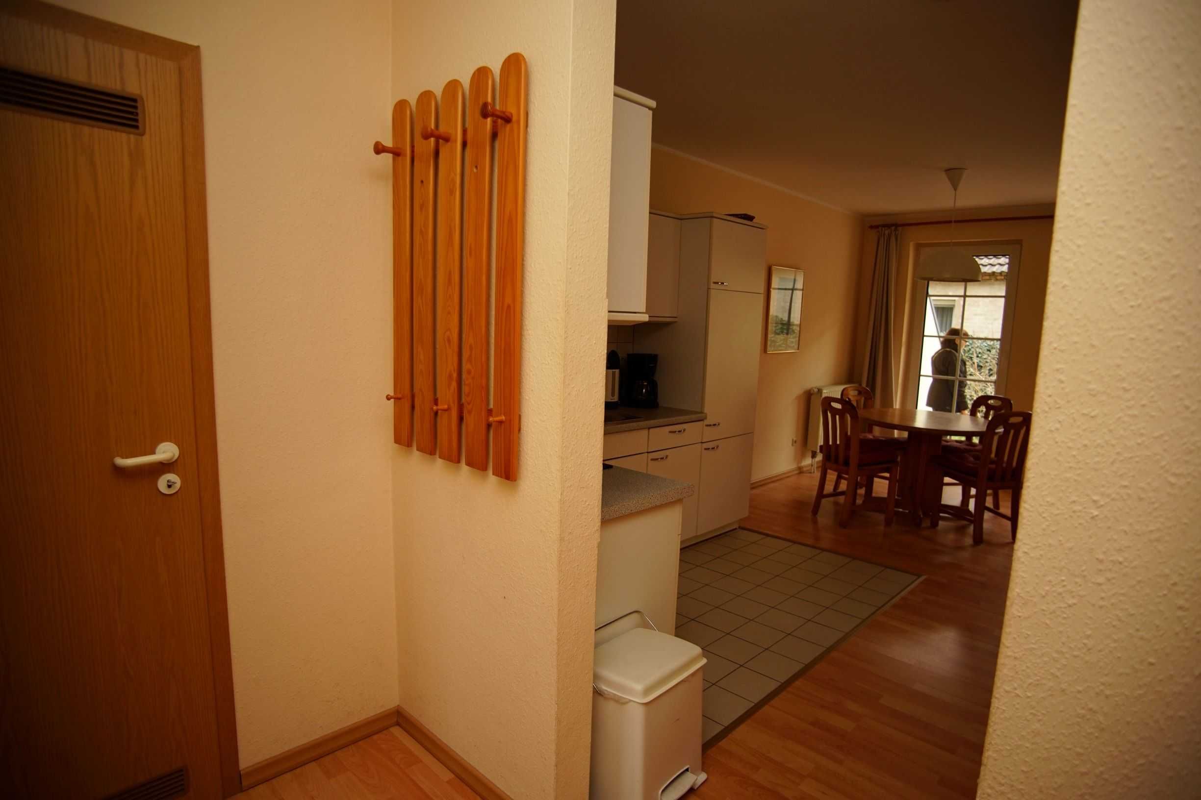 In dieser Ferienwohnung befindet sich ein Wohnbereich mit offener Küche. Vom Flur aus gelangen Sie in das Schlafzimmer mit Doppelbett und in das Badezimmer mit Dusche und WC.
