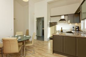 Die zwei Schlafzimmer bieten einen gemütlichen Rückzugsort. Sie besitzen jeweils ein bequemes Doppelbett (180 x 200 cm) und einen geräumigen Schrank. In dem großzügigen Wohnzimmer befindet sich zudem eine Schlafcouch für eine zusätzliche Aufbettung. Durch Fernseher und Stereoanlage können Sie sich abends gemütlich zusammensetzen und sich entspannen. Zur Ausstattung der hochwertigen Einbauküche gehören ein Herd mit Backofen, ein Geschirrspüler sowie ein großer Kühlschrank mit Gefrierfach. Das moderne Bad mit Dusche ist mit Fußbodenheizung und einem elektrischen Handtuchtrockner ausgestattet. Auf dem Balkon können Sie ihren Abend gemütlich ein- und ausklingen lassen. Alle Fenster wurden mit Jalousien versehen. Selbstverständlich gehört zu Ihrer Wohnung auch ein gekennzeichneten PKW-Stellplatz.