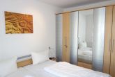 Im Schlafzimmer steht ein Doppelbett und ein Kleiderschrank mit einem großem Spiegel.