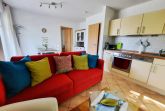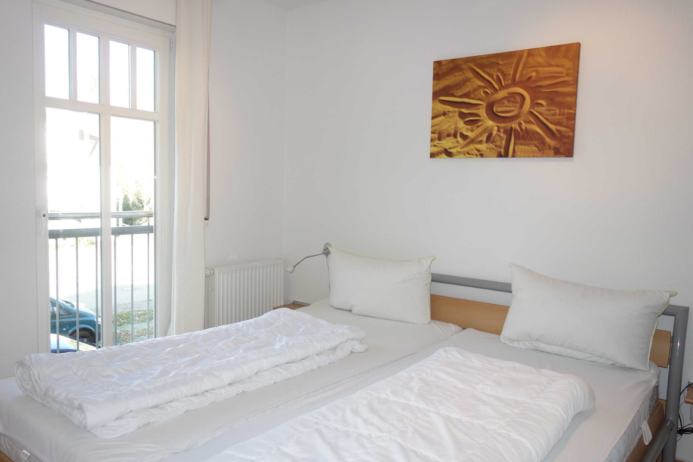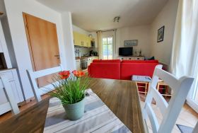 Die Ferienwohnung verfügt über ein Wohnzimmer mit integrierter Küchenzeile, ein Schlafzimmer, ein Bad, 2 Balkone, einen kleinen Flur, einen PKW-Stellplatz und einen Fahhradschuppen.
