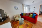 Das Wohnzimmer ist mit einem Flachbildfernseher, einer Musikanlage und einer Couch ausgestattet. Ein Esstisch mit 3 Stühlen befindet sich ebenfalls im Wohnzimmer.