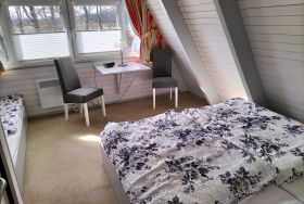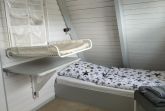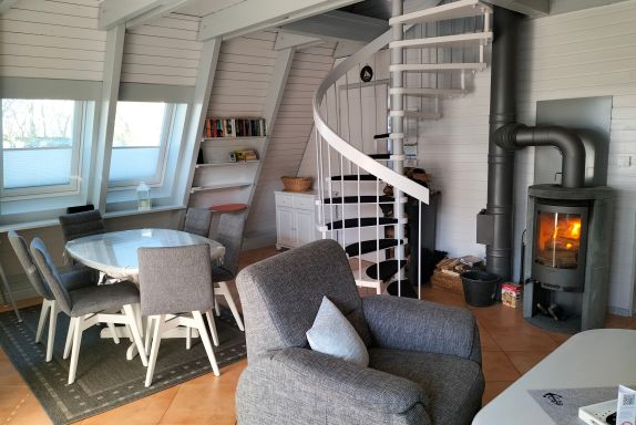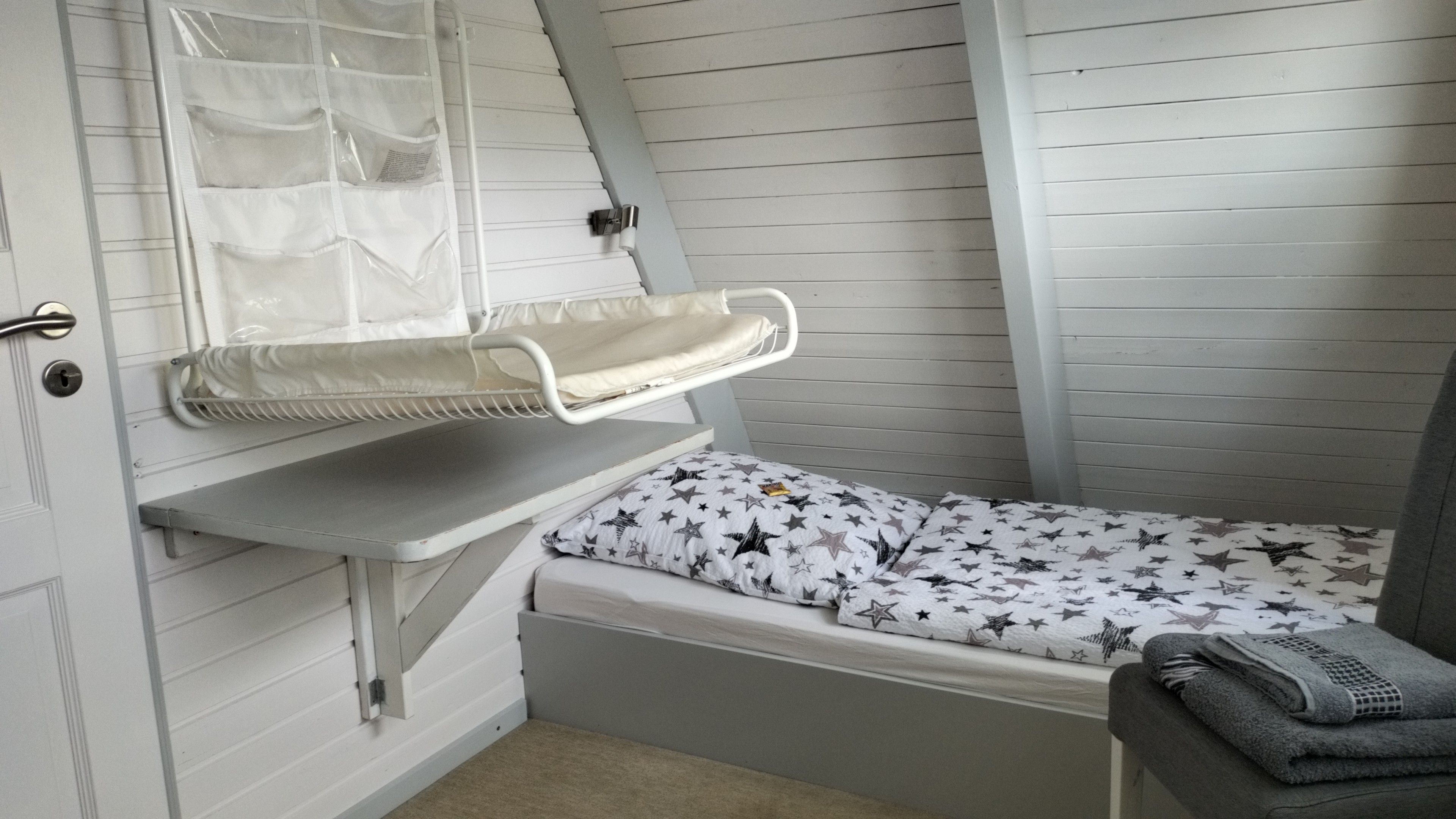 Das Haus mit seinen ca. 68qm Wohnfläche bietet Platz für max. 5 Erwachsene und 1 Kleinkind. Im Parterre des Hauses befindet sich der große Wohn-/Essraum mit einem Kaminofen, eine separate Küche u.a. mit E-Herd/Glaskeramikkochfeld und Backofen, Geschirrspüler, Mikrowelle und einer Waschmaschine sowie das Duschbad. Im Obergeschoss liegen die 2 Schlafzimmer - ein Zimmer verfügt über ein Doppelbett (180x200cm) und ein Einzelbett (90x200cm), im 2. Schlafzimmer befinden sich 2 Einzelbetten (je 90x200cm). Für ein Kleinkind steht ein Kinderreisebett (70x140cm) zur Verfügung.