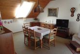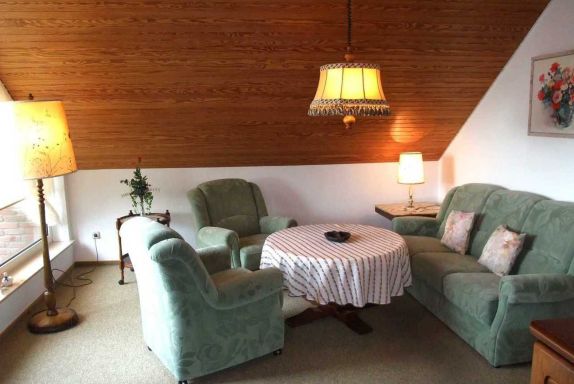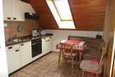 Dieses Urlaubsquartier liegt in der 1. Etage (mit Dachschräge) eines 3 Familienhauses. Im großen Schlafraum mit Doppelbett und Abstellraum steht auch ein Kleinkinderreisebett kostenfrei zur Verfügung. Der zweite Schlafraum ist mit 2 Einzelbetten ausgestattet. Das Duschbad ist hell und neu. Die Küche mit Sitzecke ist komplett ausgestattet. Im geräumigen Wohnraum befinden sich eine Essecke und der Sitzbereich. Vom Wohnraum aus geht es auf die