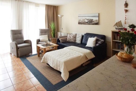 Das komfortabel ausgestattete 2-Zimmer-Appartement mit Nord/Ost Balkon befindet sich im 1. OG des Mehrfamilienhauses und ist für 2 Personen wohnlich eingerichtet. Mit dem Fahrstuhl erreichen sie bequem die Ebene Ihrer Ferienwohnung. Auch Gäste mit Hund (gegen Gebühr) sind in der ? Dwarslöper 14- herzlich willkommen und werden sich in dem schicken Wohn-/Essbereich, Esstisch, Fernseher, Musikanlagen und kostenfreier WLAN Nutzung wohlfühlen. Die in den Wohnbereich integrierte Küchenzeile ist ausgestattet mit einem 4- Plattenherd, Backofen, Mikrowelle, Geschirrspüler, Kaffeemaschine, Toaster u.v.m. Das separate Schlafzimmer bietet ein Doppelbett und einen Kleiderschrank. In dem modernen Duschbad können Sie auch eine Waschmaschine nutzen. Kostenfrei stehen drei Fahrräder ? eines davon für Kinder- während Ihres Aufenthaltes bereit. Für kleine Kinder ist in der Wohnung ein Hochstuhl sowie ein Kinderreisebett vorhanden. Ihren PKW parken Sie kostenfrei in der hauseigenen Tiefgarage. Gäste, die sich nach Ruhe und Erholung sehnen wohnen im Ortsteil Boltenhagen-Redewisch ? nahe der Steilküste ideal. In ca. 15 Gehminuten entlang des Meeres erreichen Sie das turbulente Ortszentrum.