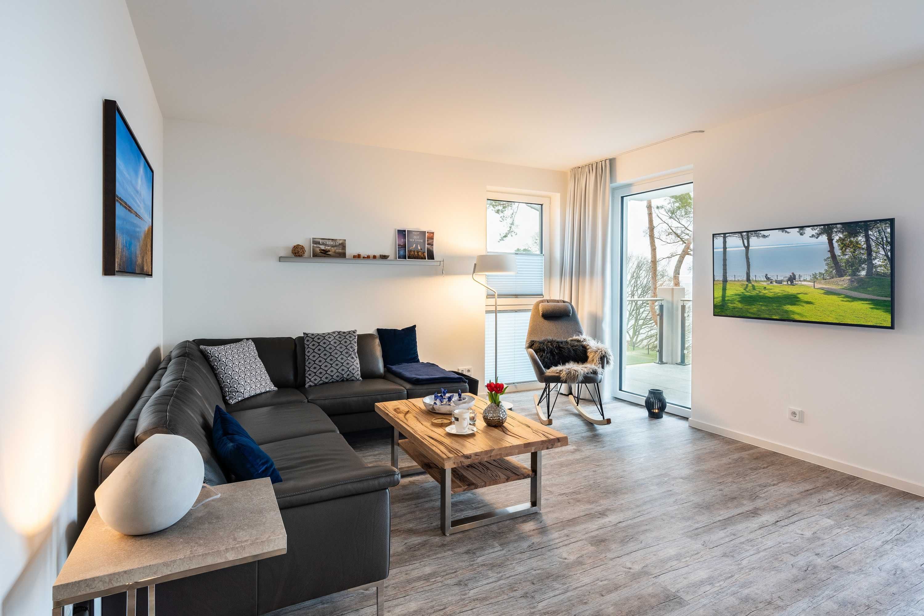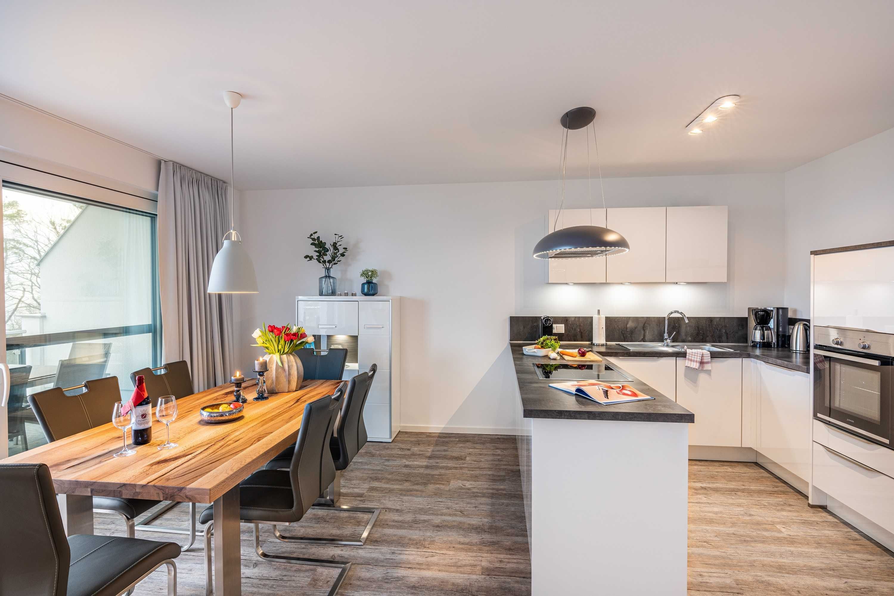 Diese lichtdurchflutete, helle 4-Zimmer-Wohnung im obersten Geschoss von Haus 7 (Aufzug vorhanden) mit Platz für maximal 6 Personen verfügt über eine Wohnfläche von 100 m² und hat 3 Schlafzimmer sowie 2 voll ausgestattete Duschbäder. Die große Sonnenterrasse mit 17 m² liegt in idealer Süd-Ausrichtung. Die Wohnung ist modern eingerichtet mit offenem Wohn-Essbereich, großem Esstisch, Ledersofa sowie Smart-TV (inkl. Sky-Abo). Die hochwertig ausgestattete Küche, offen zum Wohnbereich, lässt keine Wünsche offen. Erholsamer Schlaf in den beiden Schlafzimmern mit Boxspringbetten und Smart-TV ist garantiert. Im dritten Schlafzimmer befindet sich ein bequemes Schlafsofa (Liegefläche: 1,60 x 2,00 m) und ein Smart-TV. Das Badezimmer en Suite ist mit einer begehbaren Dusche ausgestattet. Auf der großen, überdachten Sonnenterrasse mit Essgruppe und jeweils zwei Relax-Sesseln, Fußhockern sowie einem Sonnenschirm können Sie die Seele baumeln lassen.