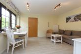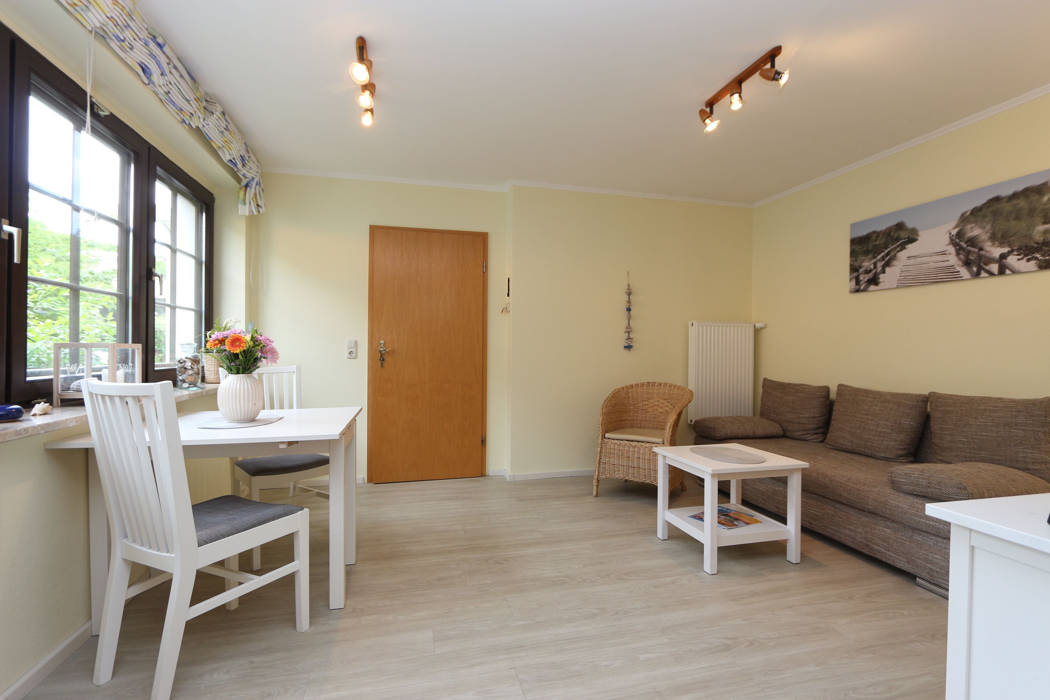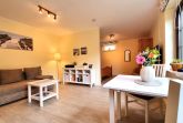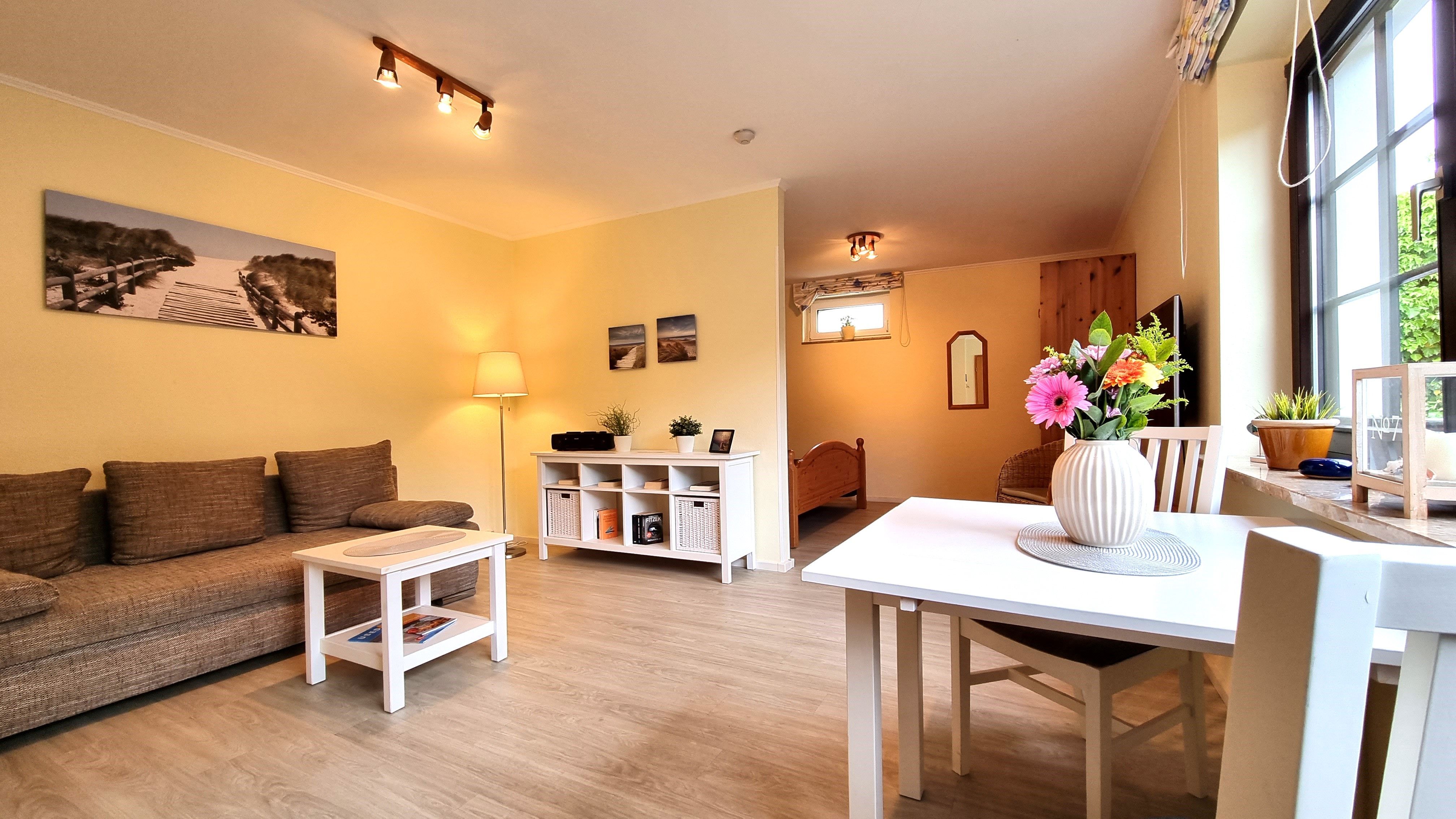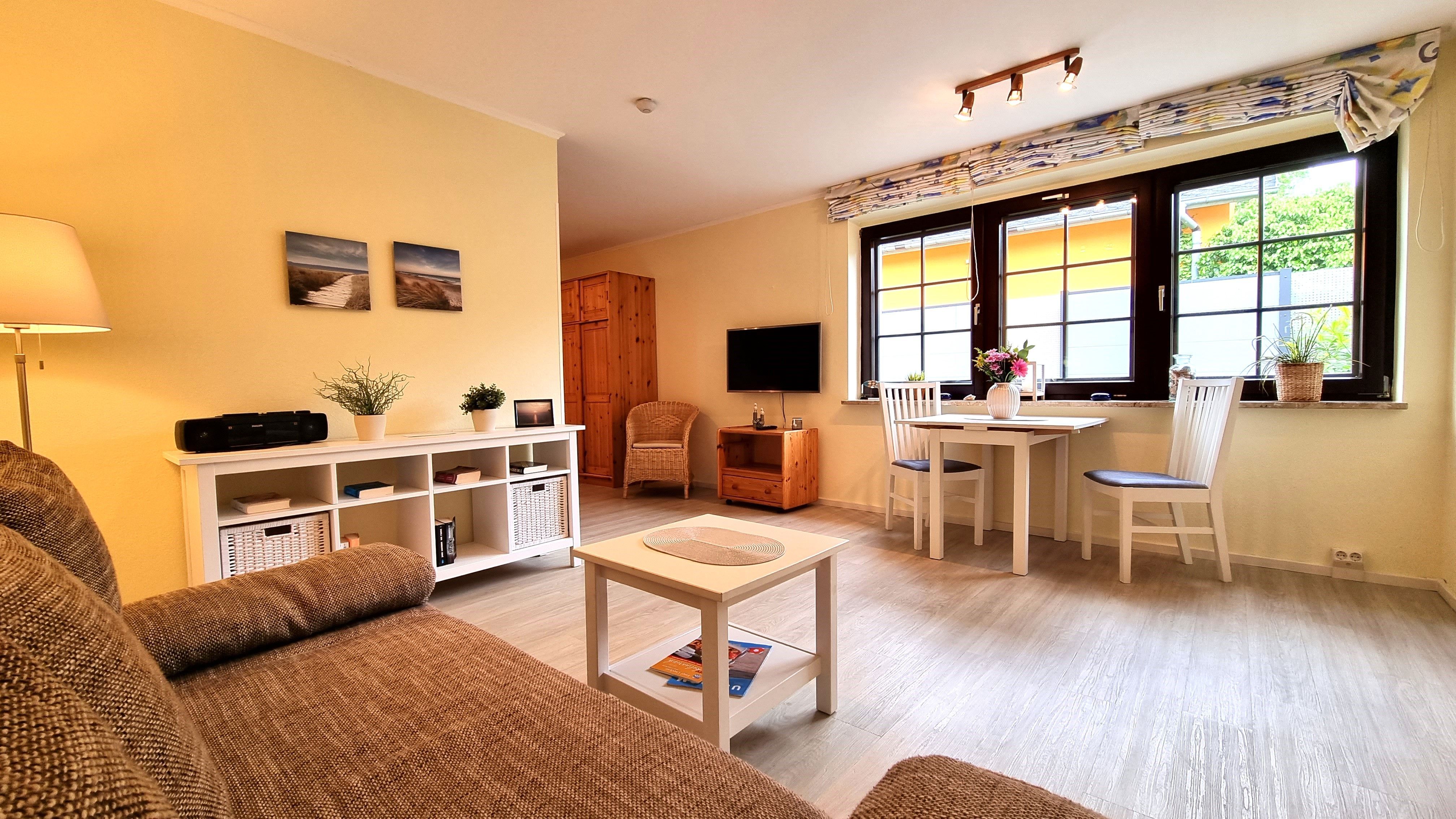 • Wohnbereich mit Sofa, Couchtisch, Anrichte, Flachbildfernseher, Esstisch mit 2 Stühlen,