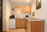 • offene kleine Küche mit Kühlschrank, 2-Platten-Kochplatten, Mikrowelle, Kaffemaschine, Wasserkocher, Spüle,