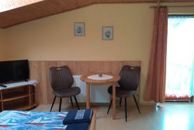 Das Doppelzimmer ist ca. 12 m² groß und befindet sich in der ersten Etage. Es ist ausgestattet mit Doppelbett, Schrank, kleiner Sitzecke und TV. Alle Zimmer verfügen über DU und WC.