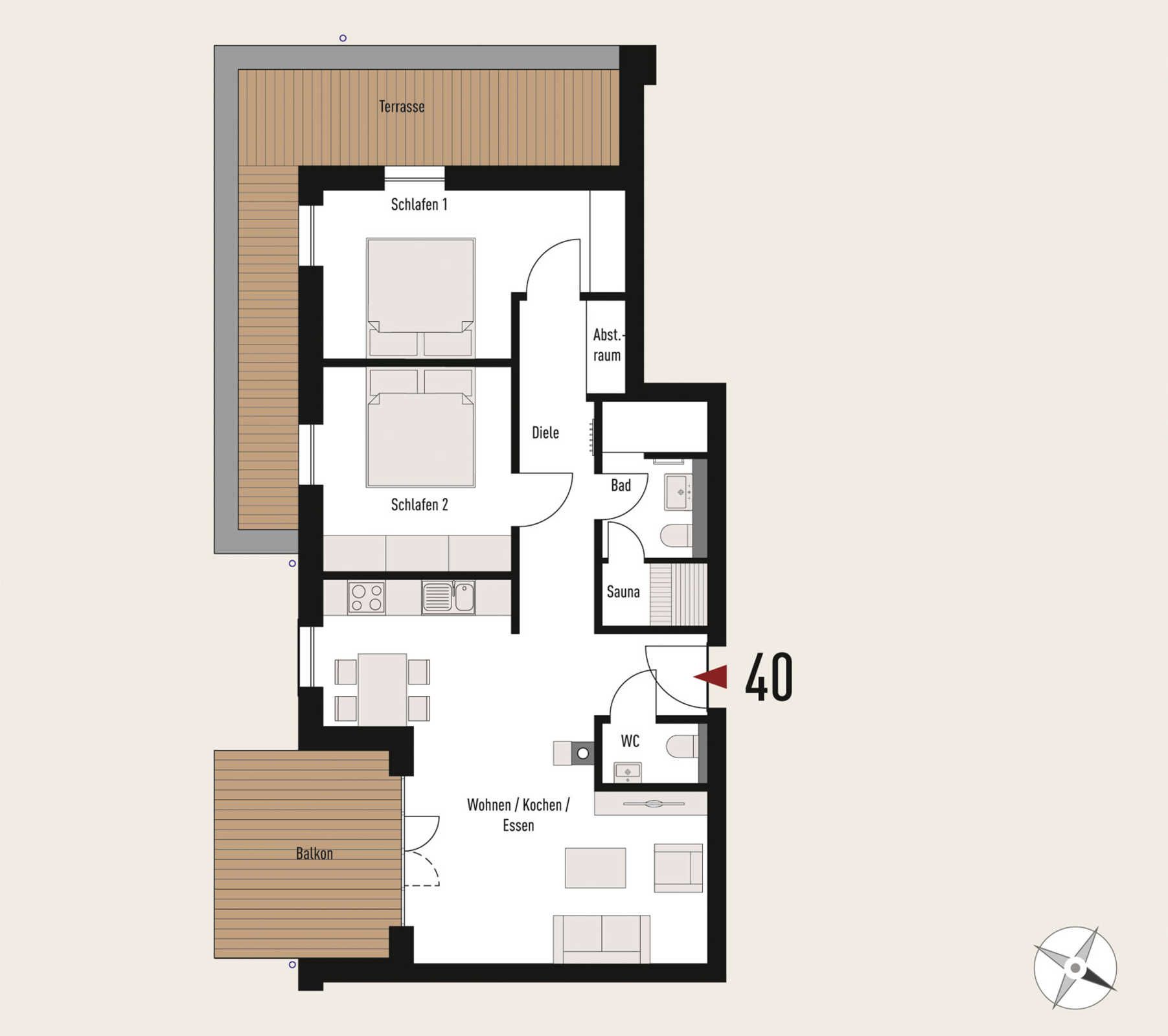 Insgesamt gibt es ca. 40 hochwertige moderne Wohneinheiten, alle mit Balkon oder Terrasse, bodentiefen Fenstern und Fußbodenheizung. Eine kostenpflichtige gemeinschaftliche Sauna mit Ruheraum befindet sich im Keller. Ebenfalls befinden sich dort Waschmaschine und Trockner gegen Gebühr.