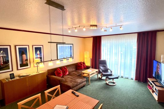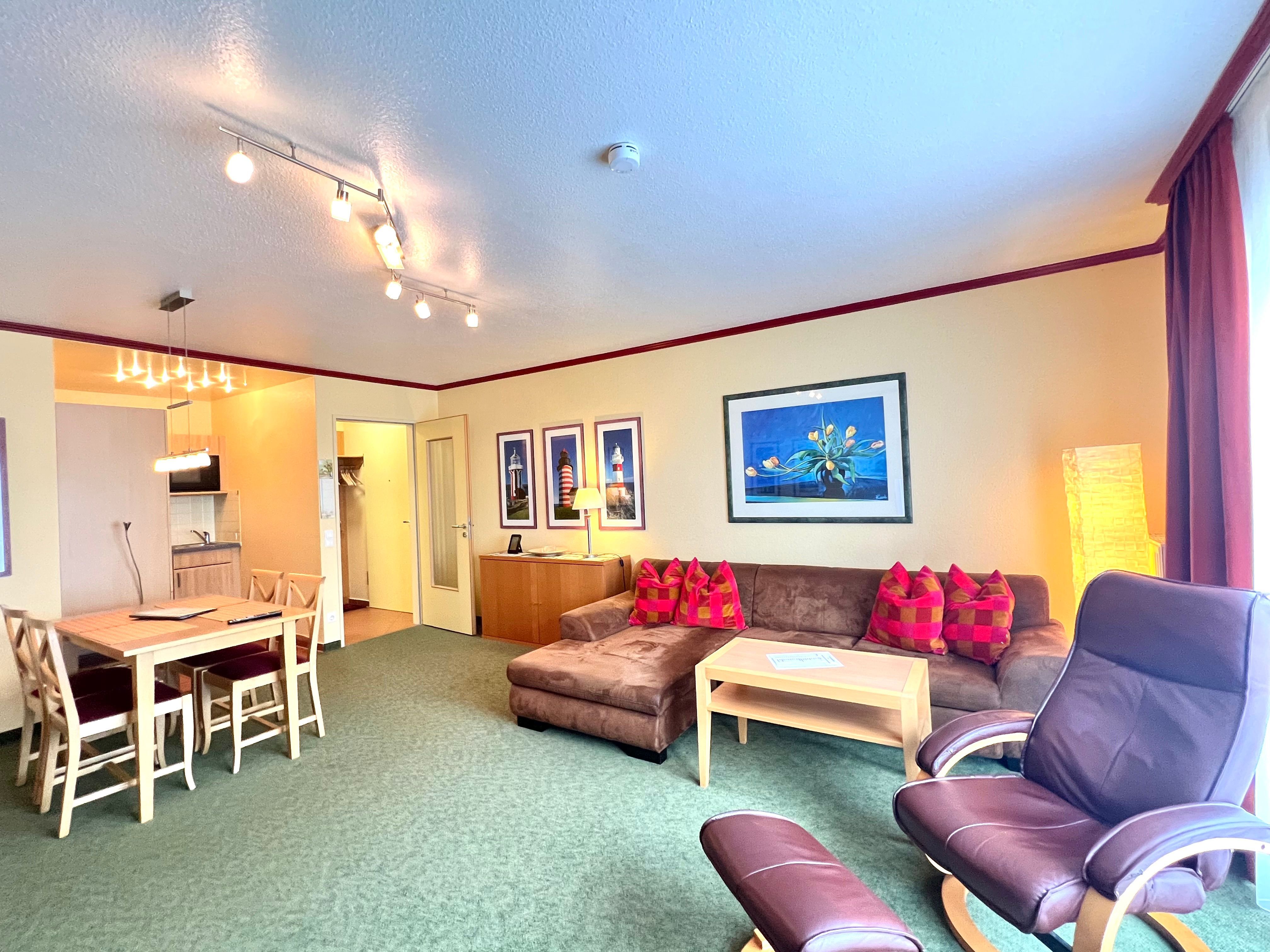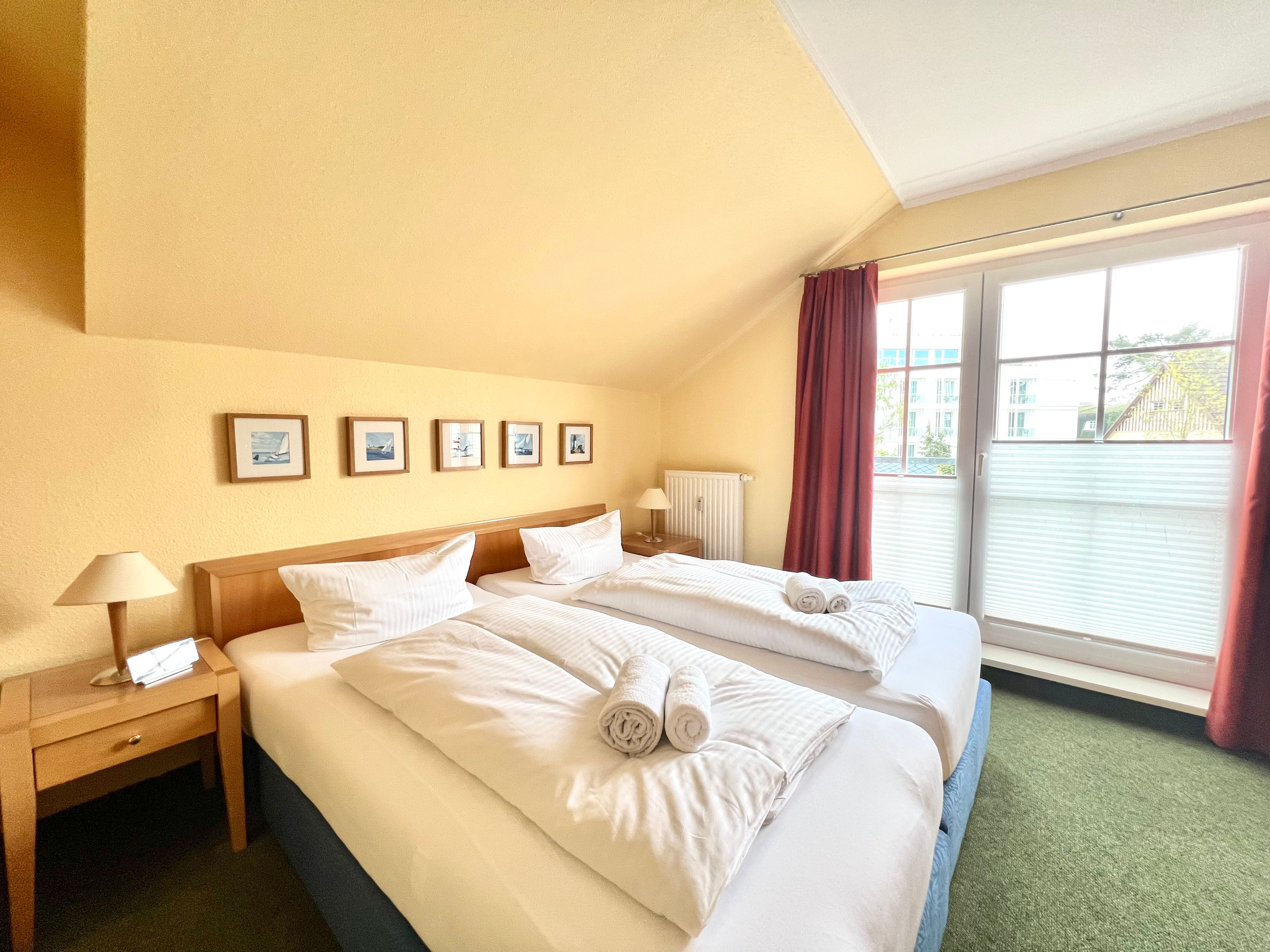 Die komfortabel ausgestattete Wohnung für bis zu 4 Personen (65 qm) erstreckt sich über zwei Etagen und befindet sich im 2. OG. Dies trennt in angenehmer Weise Wohn- und Schlafbereich. Die Wohnung mit Südausrichtung verfügt im unteren Geschoss über ein Wohnzimmer mit Couch und Sesseln, eine vollständige Küchenzeile (4-Platten-Ceranherd mit Umluftbackofen, Geschirrspülmaschine, Mikrowelle, Kühlschrank mit Gefrierfach) und eine Essecke. Der Schlafraum, sowie ein Bad mit Dusche und WC und eigener Waschmaschine im OG sind über eine Treppe erreichbar. Vom OG aus erreichen Sie die großzügige Dachterasse (Richtung Ostsee). Im Schlafzimmer befindet sich ein Doppelbett (2,10 m lang und ohne Fußende).