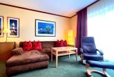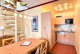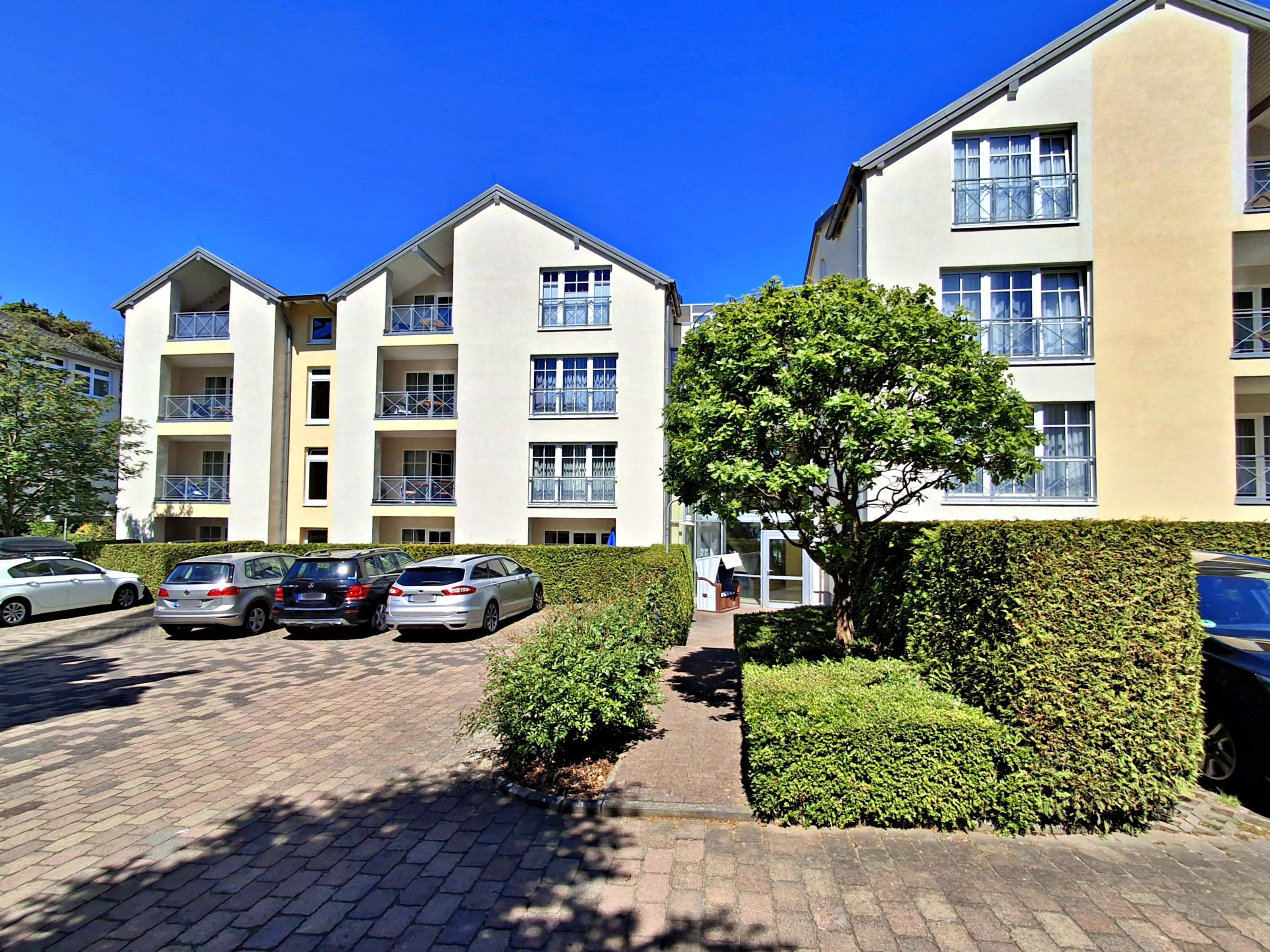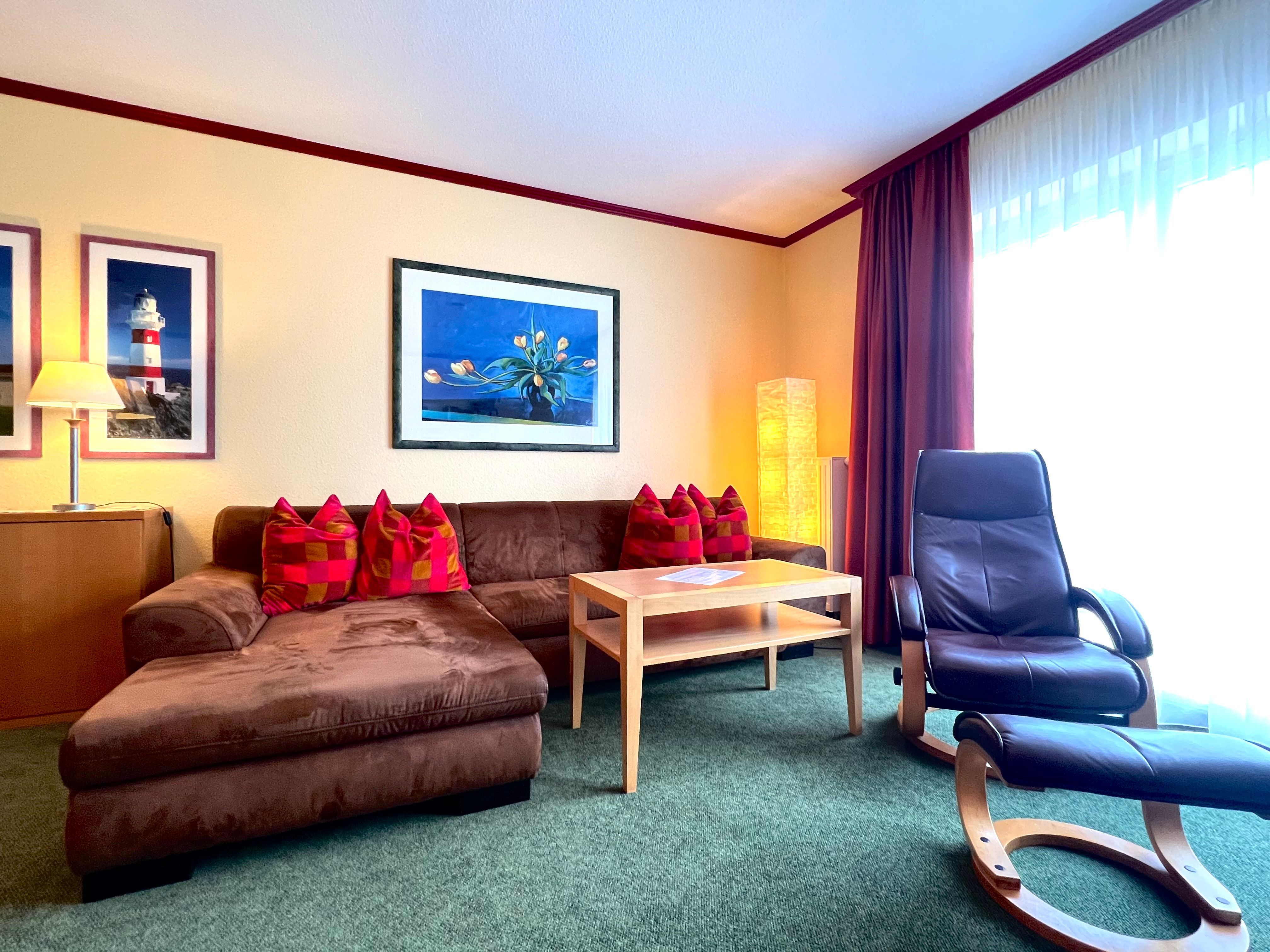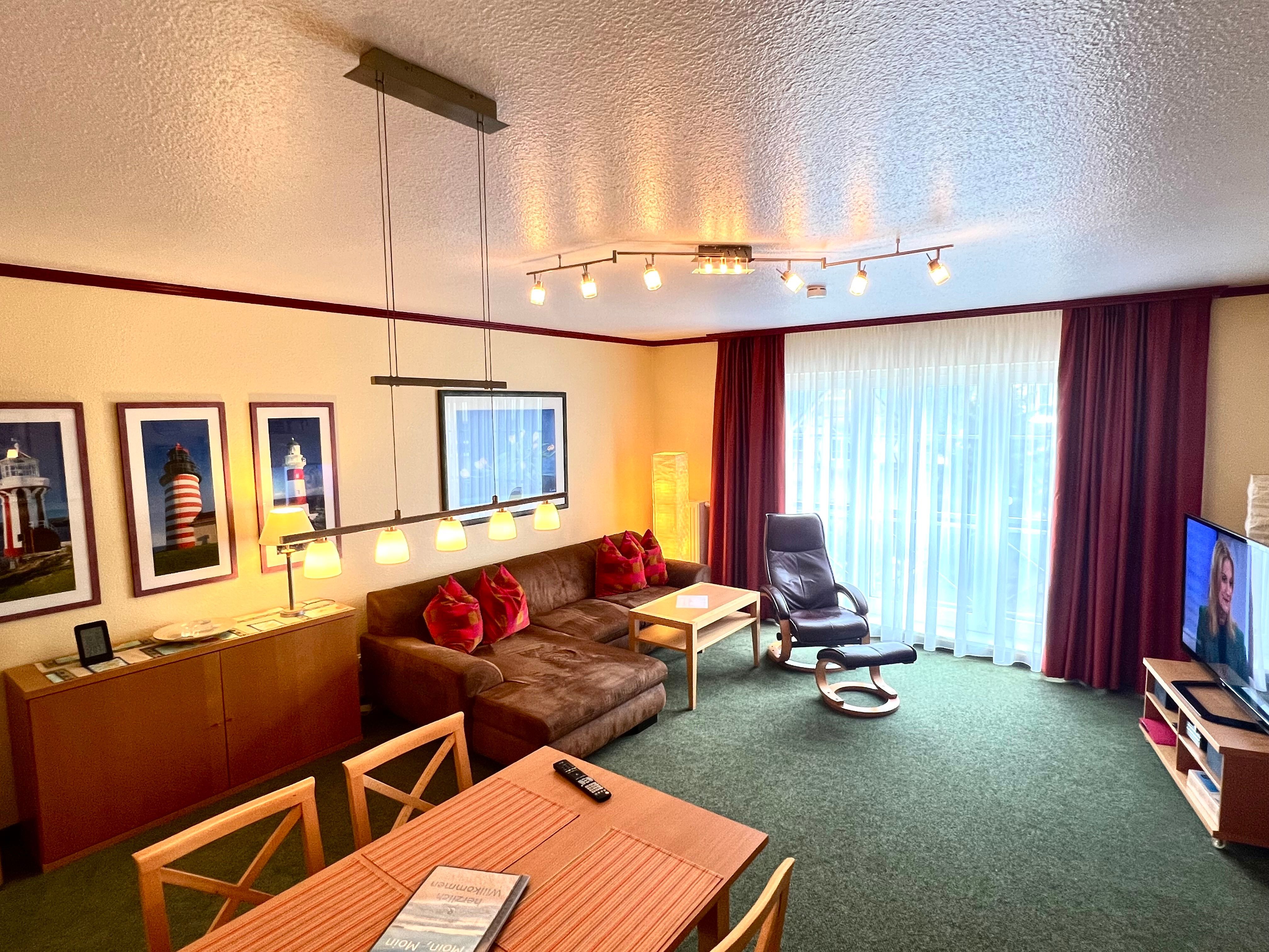 Die komfortabel ausgestattete Wohnung für bis zu 4 Personen (65 qm) erstreckt sich über zwei Etagen und befindet sich im 2. OG. Dies trennt in angenehmer Weise Wohn- und Schlafbereich. Die Wohnung mit Südausrichtung verfügt im unteren Geschoss über ein Wohnzimmer mit Couch und Sesseln, eine vollständige Küchenzeile (4-Platten-Ceranherd mit Umluftbackofen, Geschirrspülmaschine, Mikrowelle, Kühlschrank mit Gefrierfach) und eine Essecke. Der Schlafraum, sowie ein Bad mit Dusche und WC und eigener Waschmaschine im OG sind über eine Treppe erreichbar. Vom OG aus erreichen Sie die großzügige Dachterasse (Richtung Ostsee). Im Schlafzimmer befindet sich ein Doppelbett (2,10 m lang und ohne Fußende).