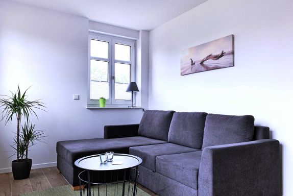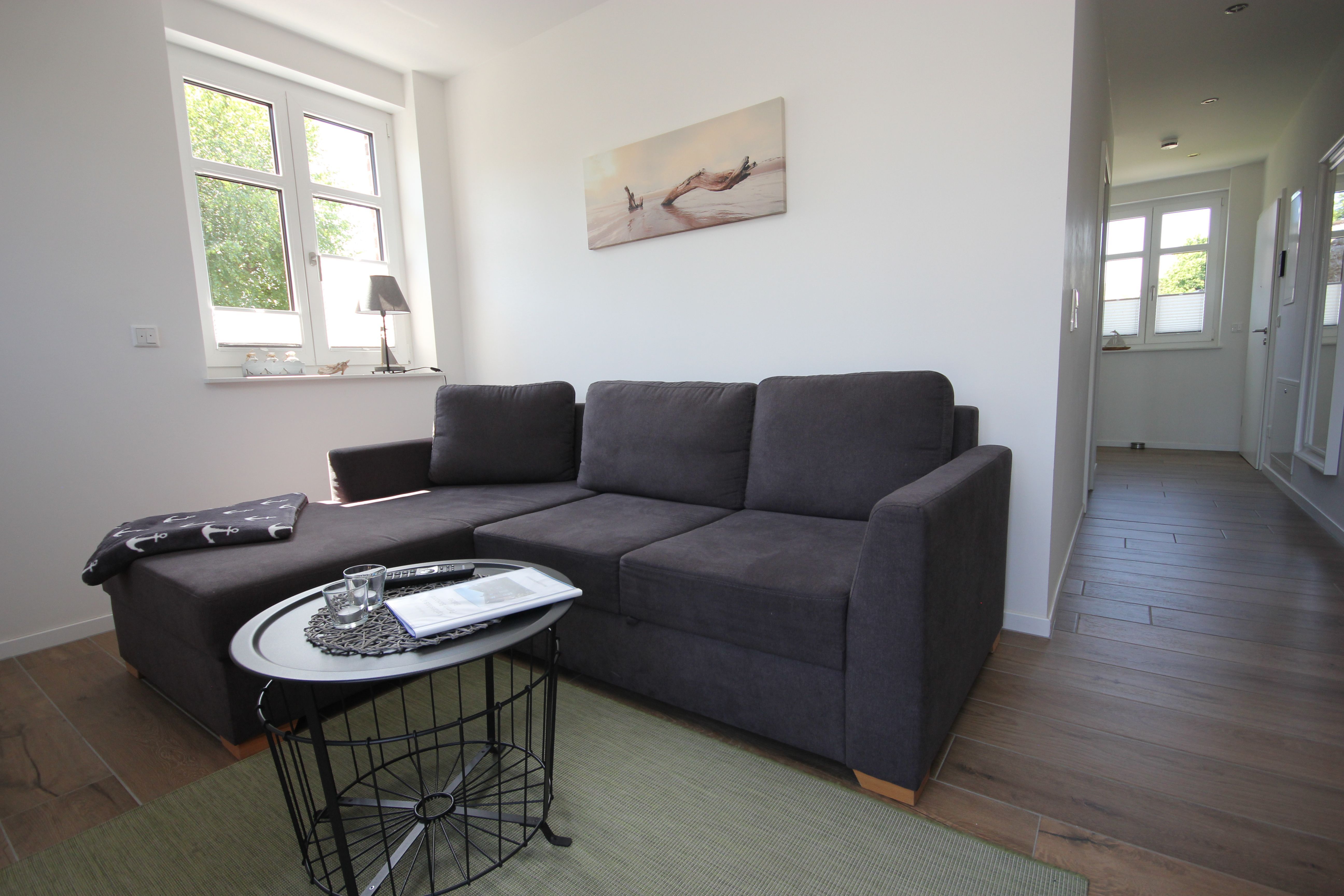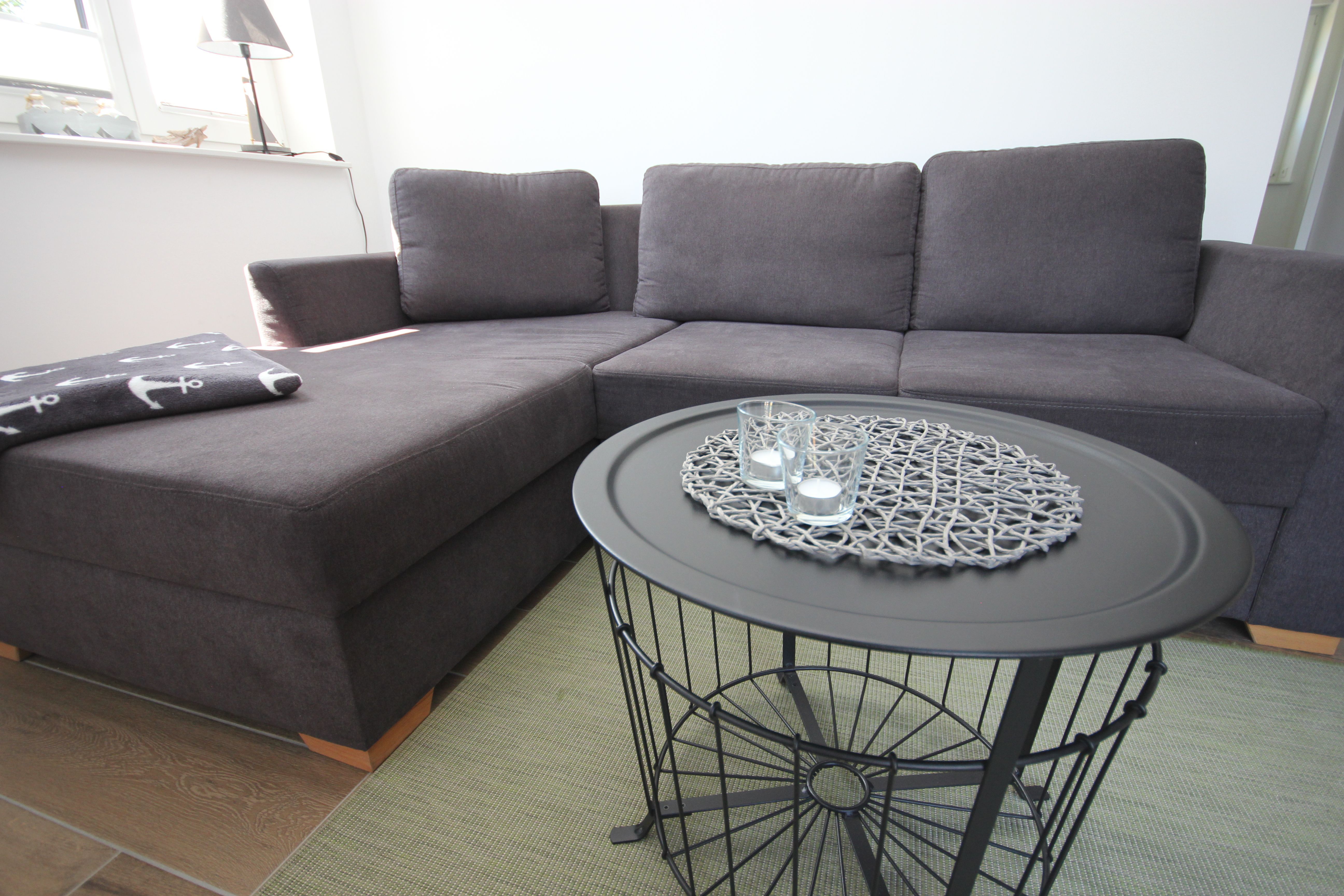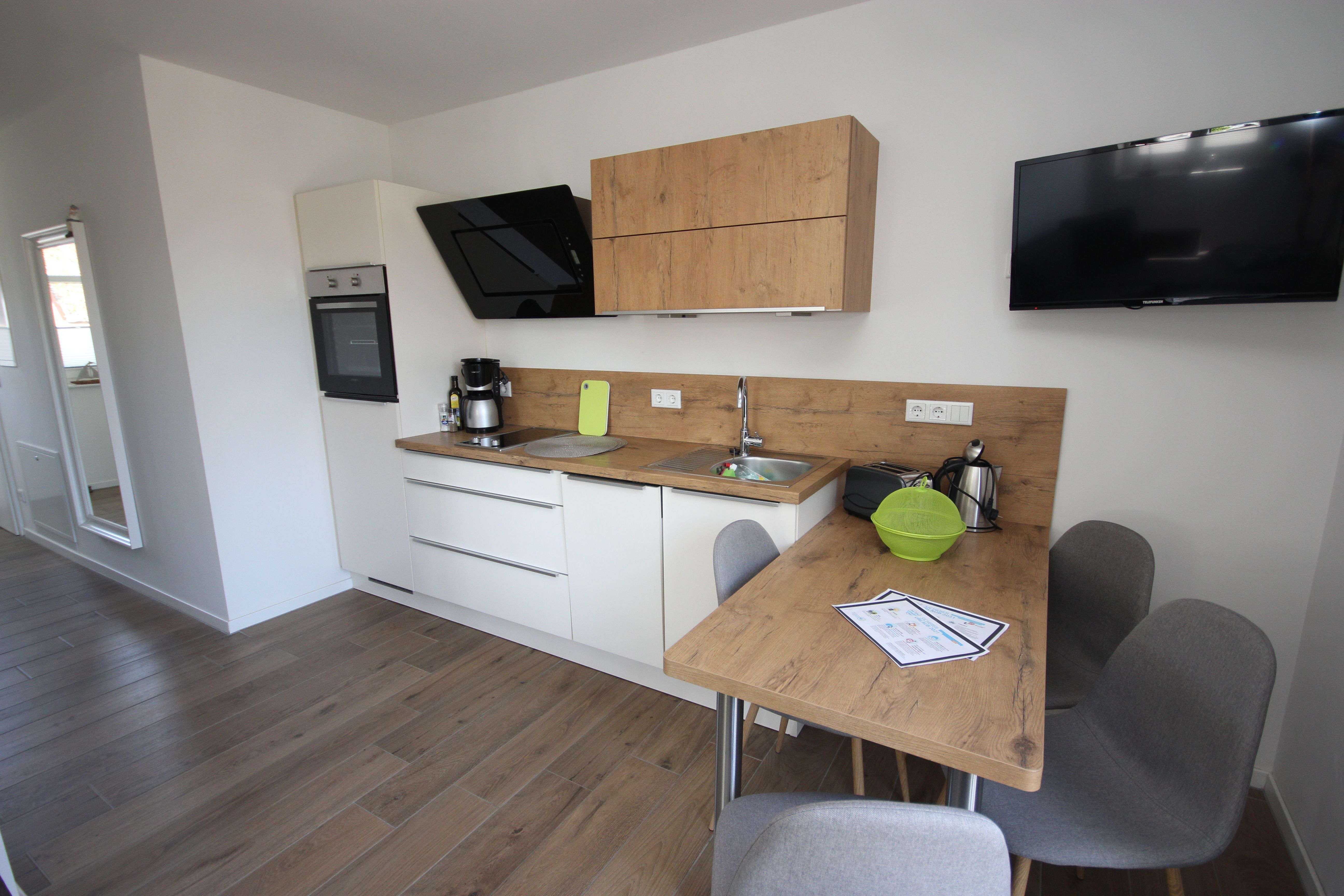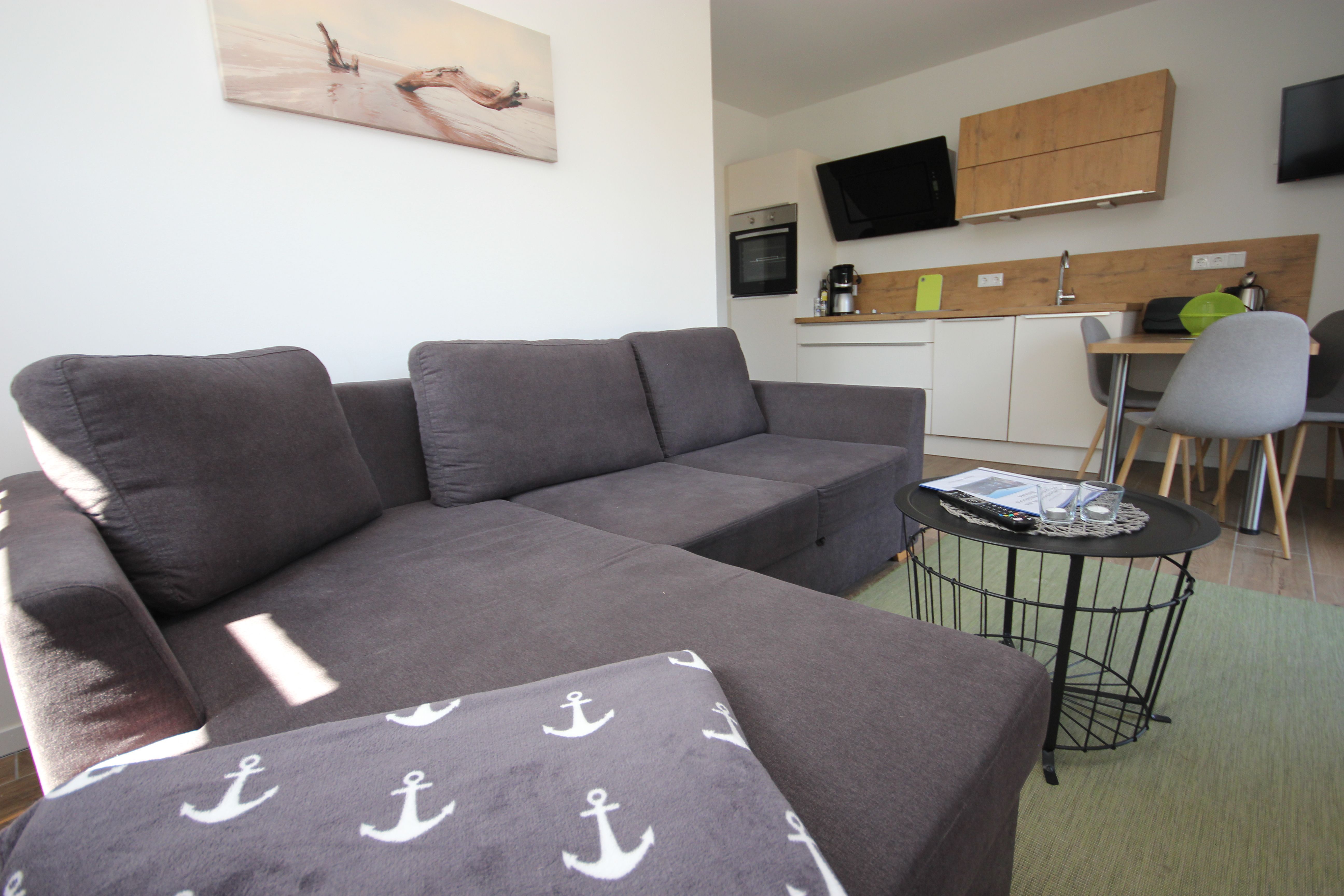 Die offene Wohnküche wurde mit SAT-TV, kostenlosem WLAN-Gastzugang, einer Küchenzeile und einer Schlafcouch ausgestattet.