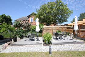 Die Ferienwohnung befindet sich im Obergeschoss und ist mit einer Terrasse und Gartenmöbeln im großzügigen Gartenbereich ausgestattet.