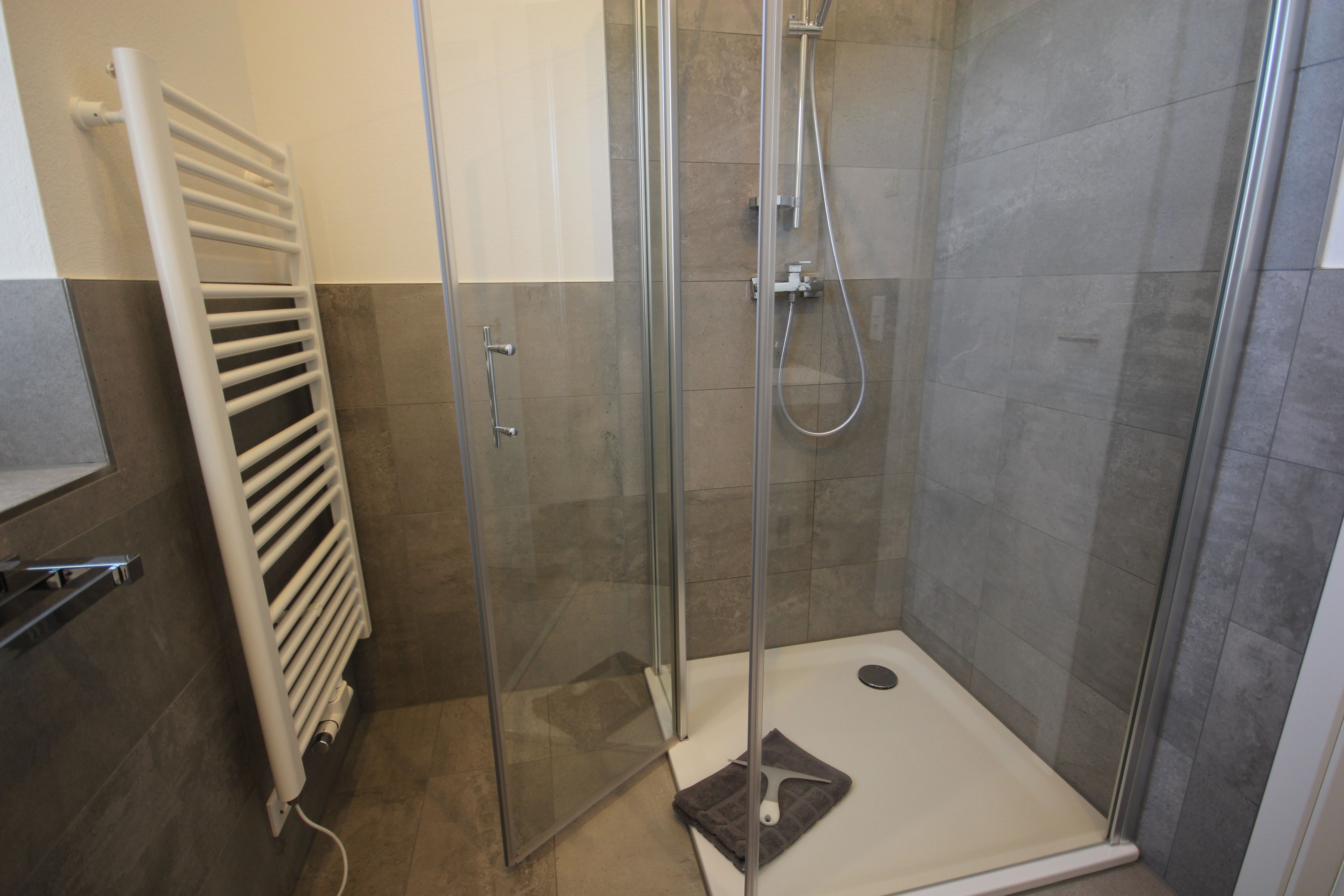 Das Bad, mit der ebenerdiger Dusche sowie Haarföhn, runden die Einrichtung ab.