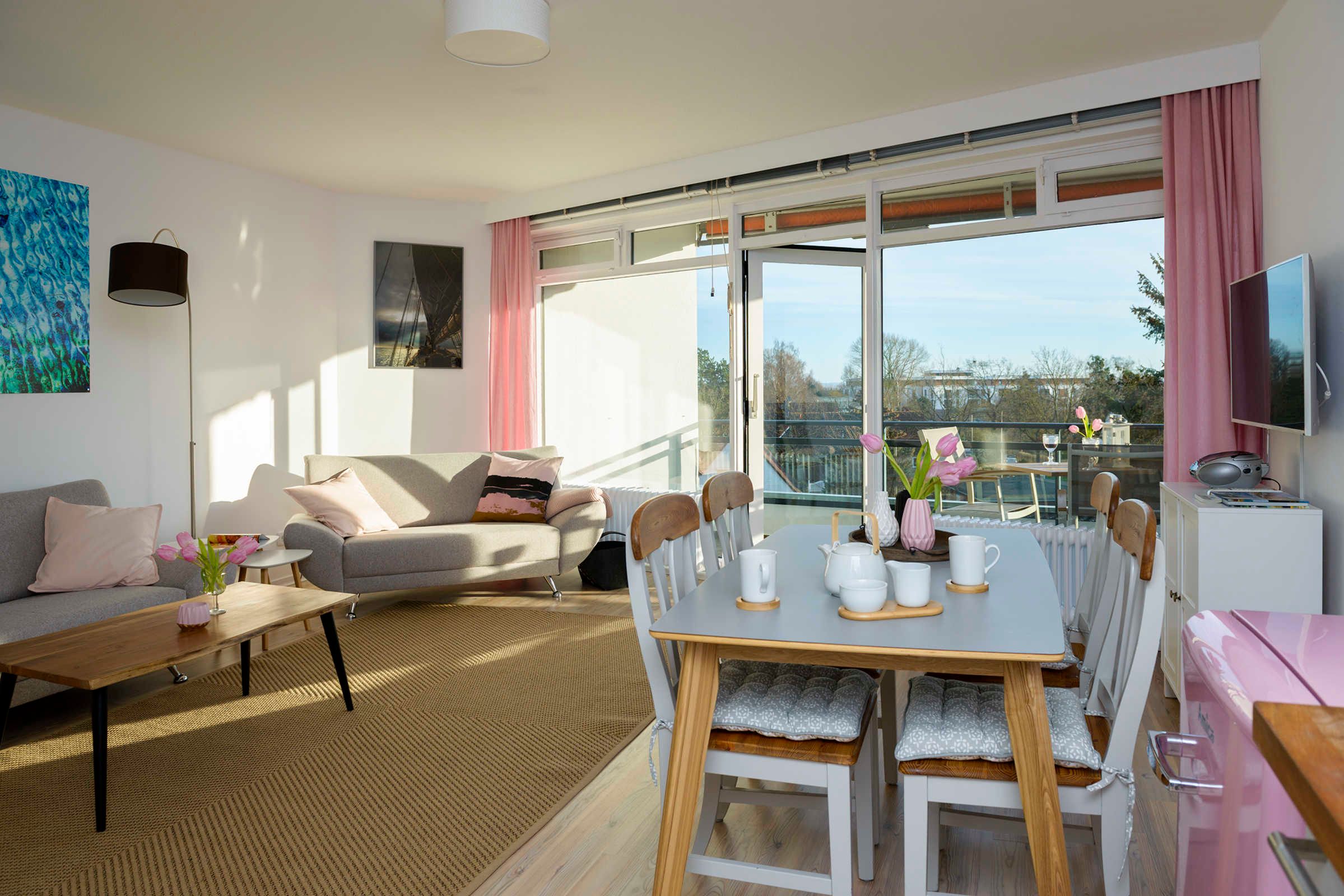 Vom Wohnzimmer treten unsere Gäste auf die mit Balkonmöbeln ausgestattete Loggia in Südlage. Von hier kann man sogar die Ostsee sehen!