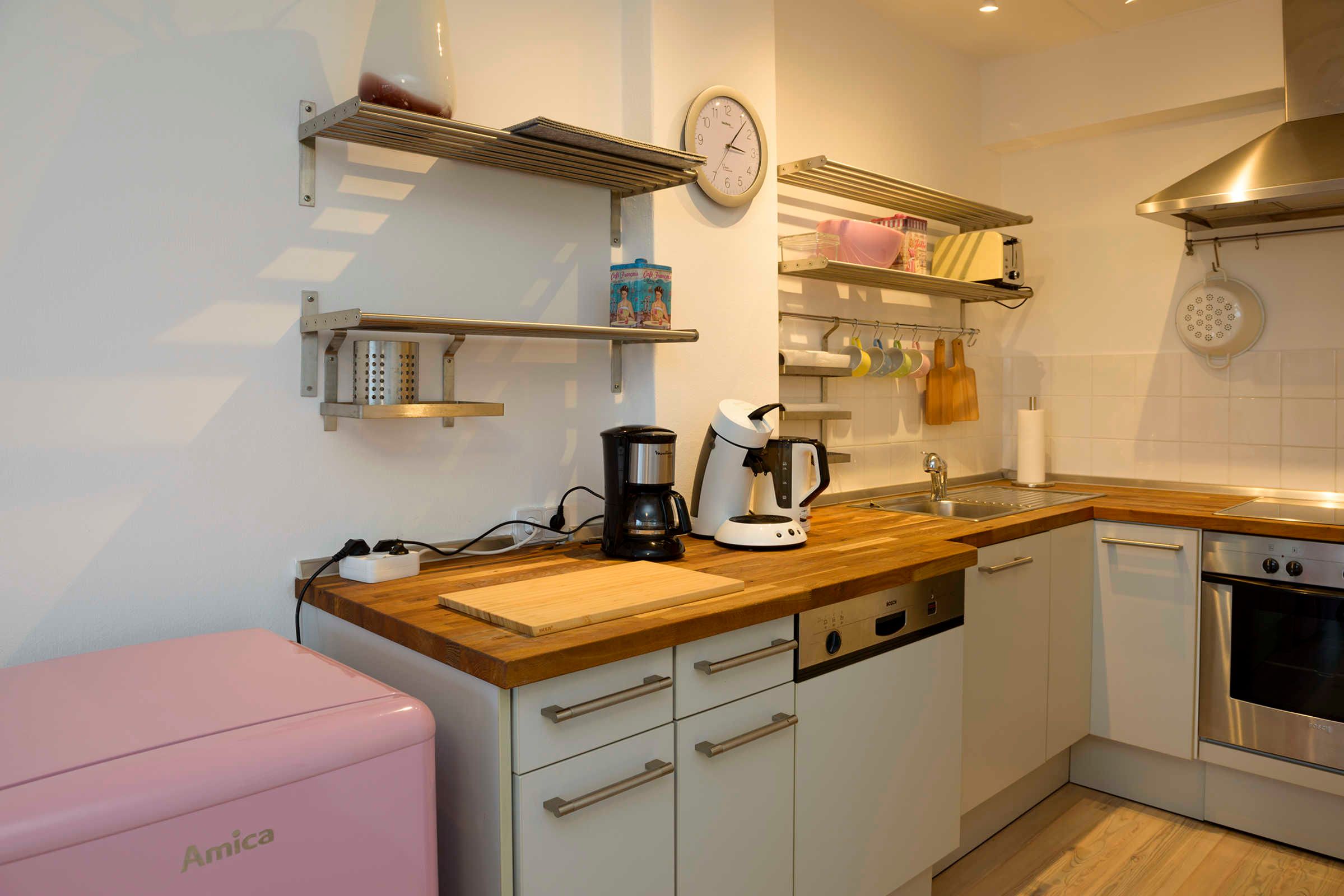 Die zum Wohnraum offene Küche ist komplett ausgestattet: Herd mit Backofen, Geschirrspülmaschine, Kühl-/Gefrierkombi, Kaffeefilter- sowie Padmaschine, Sodastream etc. Reinigungsmittel und Geschirrhandtücher liegen bereit.
