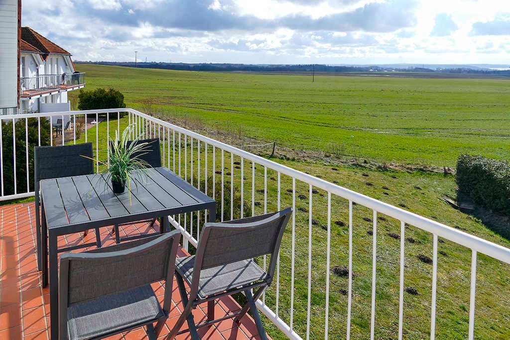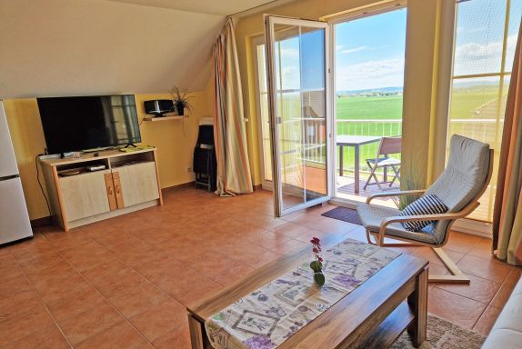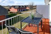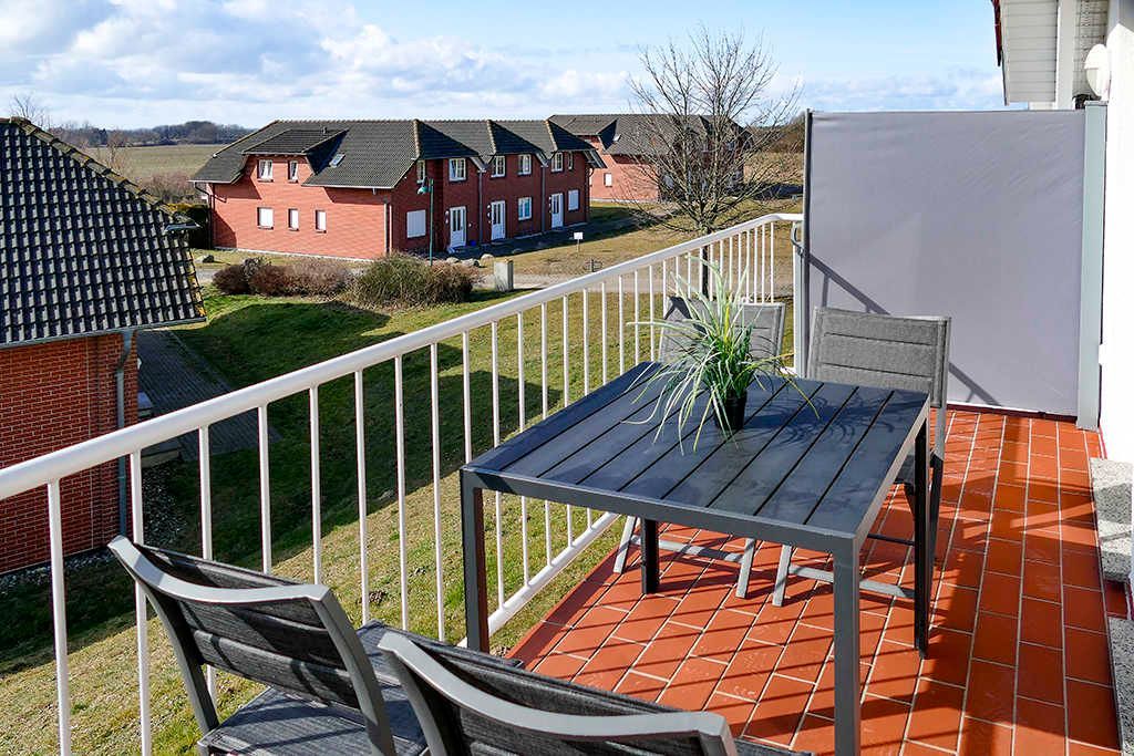 Vom Wohnbereich gelangen sie auf den möbelierten Balkon.