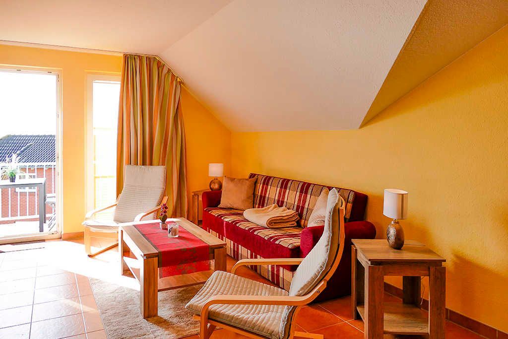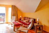 Der Wohnbereich ist mit einer Couch, die auch als Schlaffunktion dient, 2 Sessel, Flachbild- TV und Schreibtisch ausgestattet.
