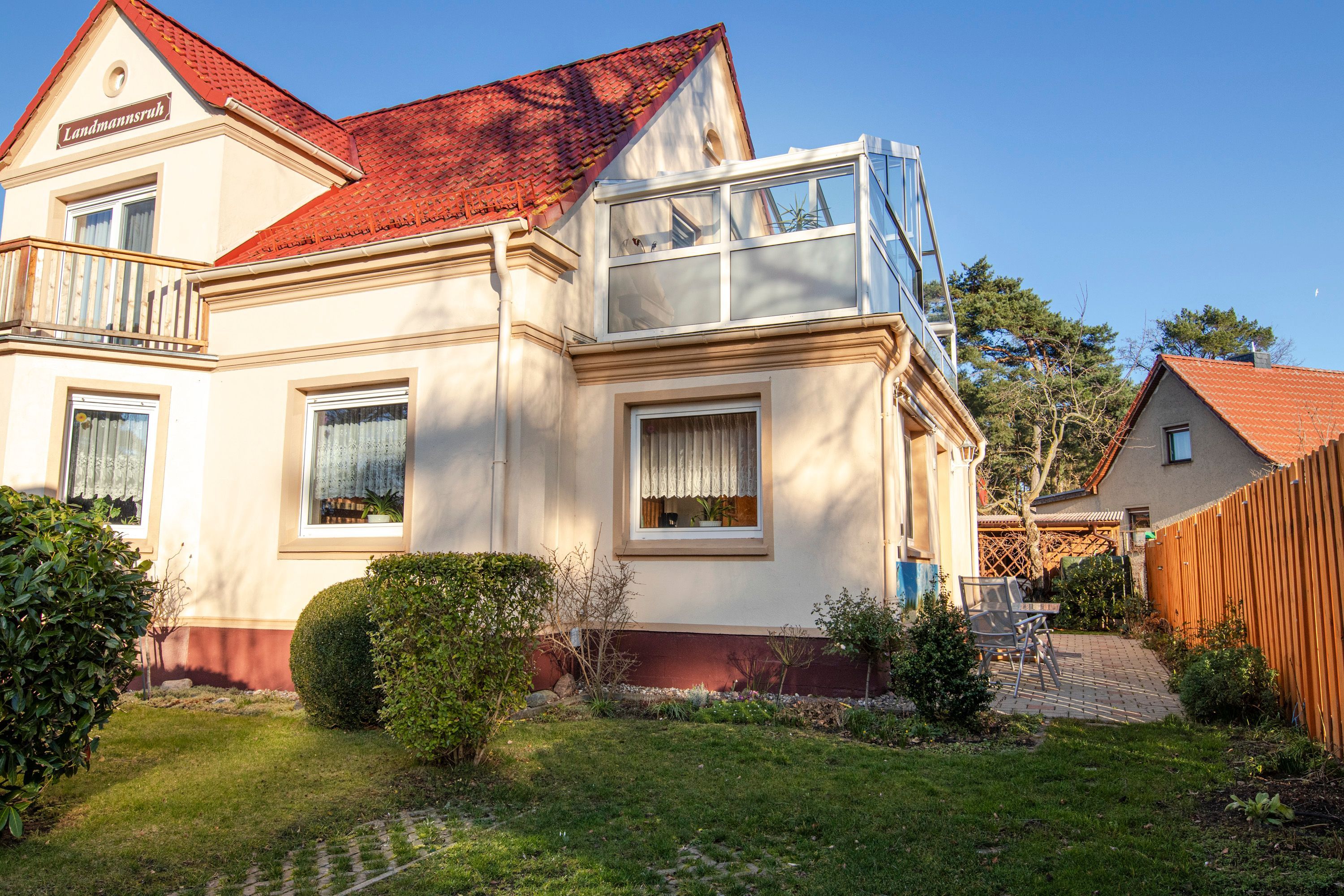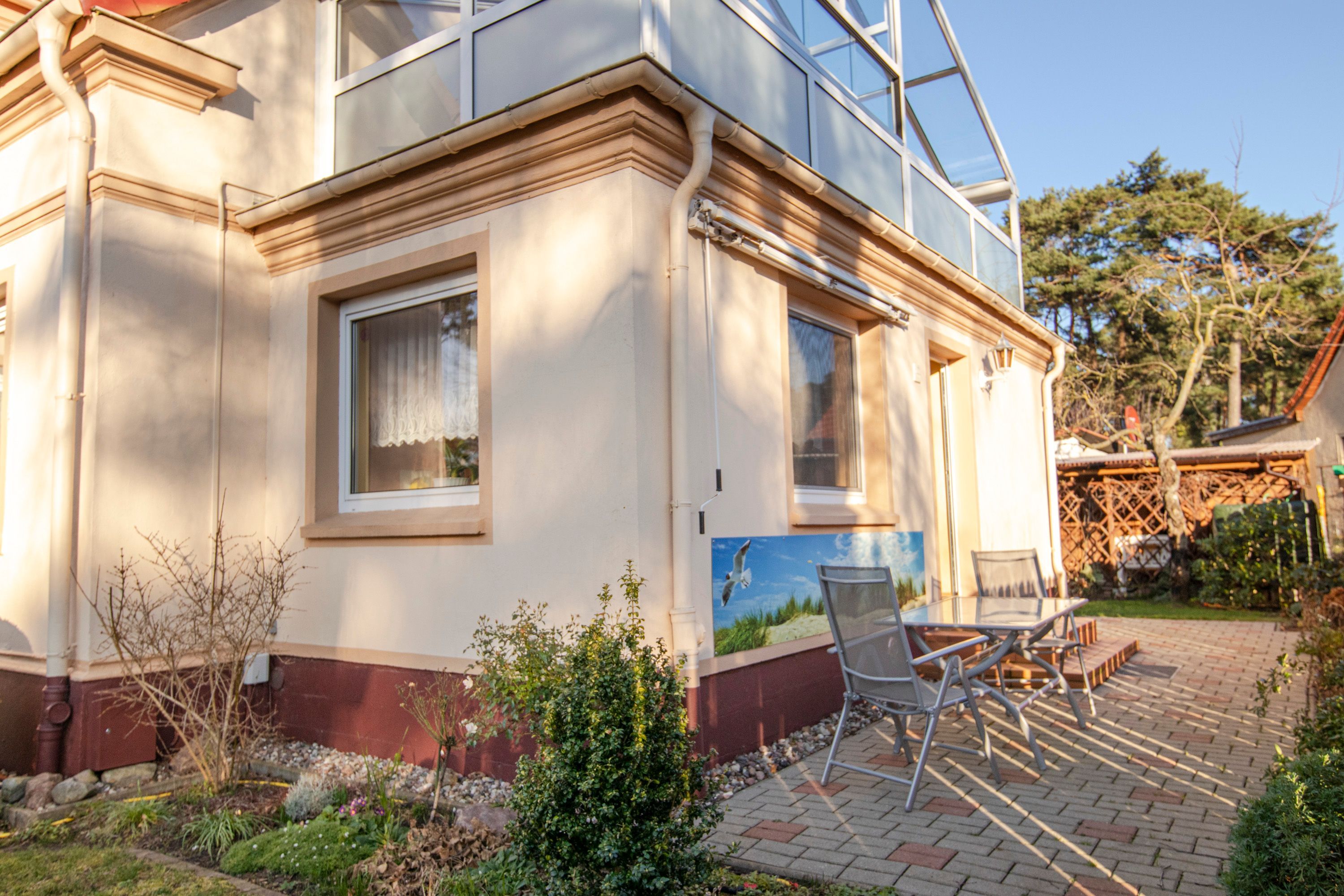 Im idyllischen Seebad Lubmin mit feinem Sandstrand wartet diese schöne Ferienwohnung für 5 Personen im Paterre auf Sie. Hier finden Sie Platz für einen erholsamen, entspannten Ostseeurlaub. Die ebenerdige und gemütliche Nichtraucher-Ferienwohnung mit separatem Eingang ist liebevoll eingerichtet und praktisch-funktional ausgestattet. Im Wohnzimmer finden Sie eine gemütliche Couch zum Fernsehen und Platz für Gesellschaftsspiele. Die zwei Schlafzimmer sind entweder mit einem Doppelbett oder drei Einzelbetten ausgestattet. Beide Schlafzimmer verfügen jeweils über einen Schrank, indem Sie Ihre Sachen unterbringen können. Die lichtdurchflutete Küche mit einem Esstisch für 5 Personen bietet eine funktionale Ausstattung mit Kühlschrank, Herd, Backofen und Mikrowelle. Der freundliche helle Raum ist bei unseren Gästen besonders beliebt. Im Tageslichtbad befinden sich Dusche und WC. Auf der Terrasse mit Markise stehen Gartenmöbel und Grill bereit. Hier können Sie den Sonnenuntergang genießen und die Abende ausklingen lassen. Am Haus steht 1 Parkplatz zur Verfügung.