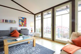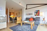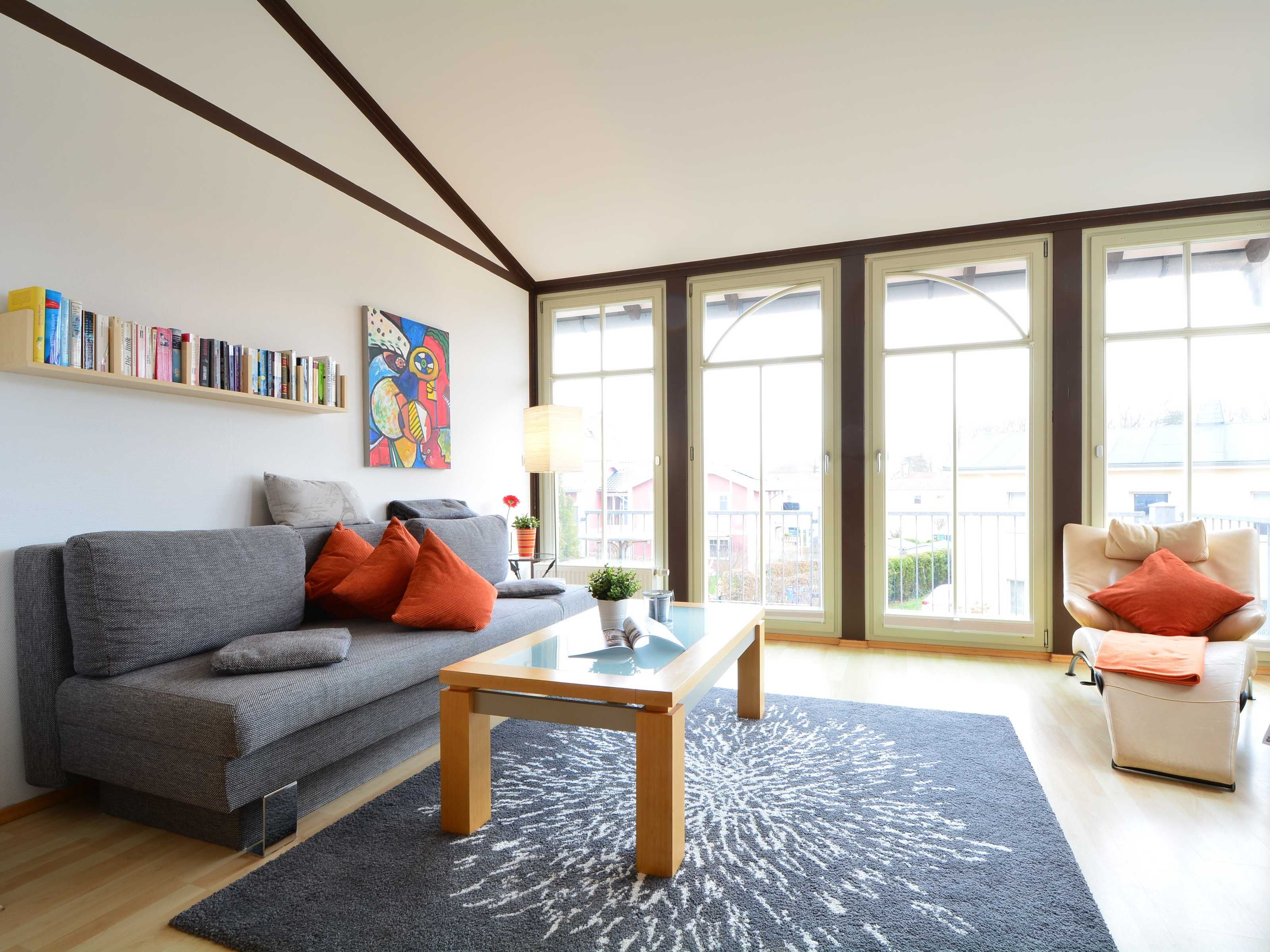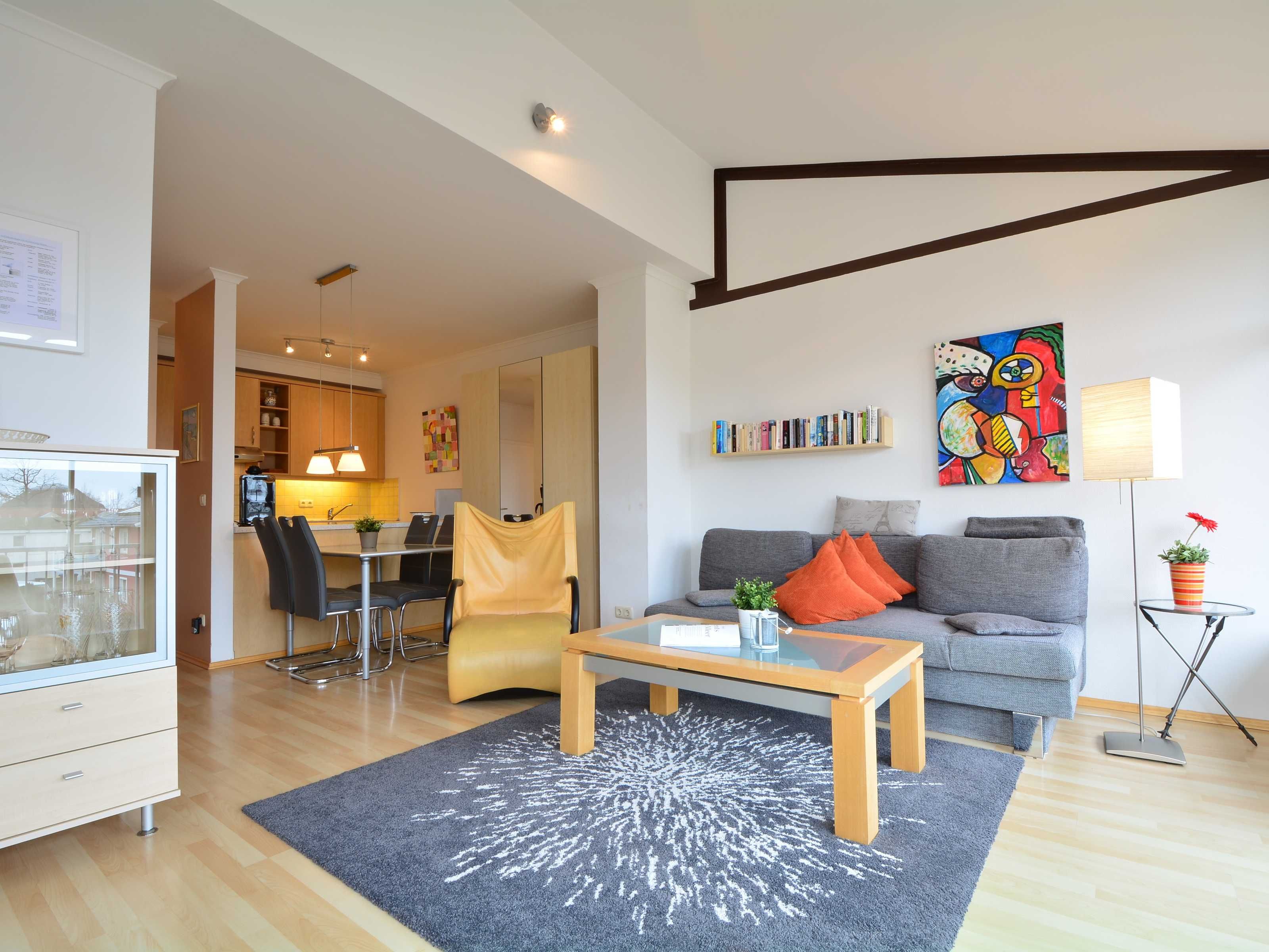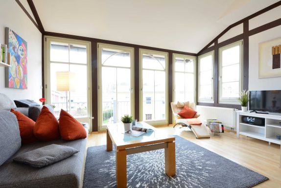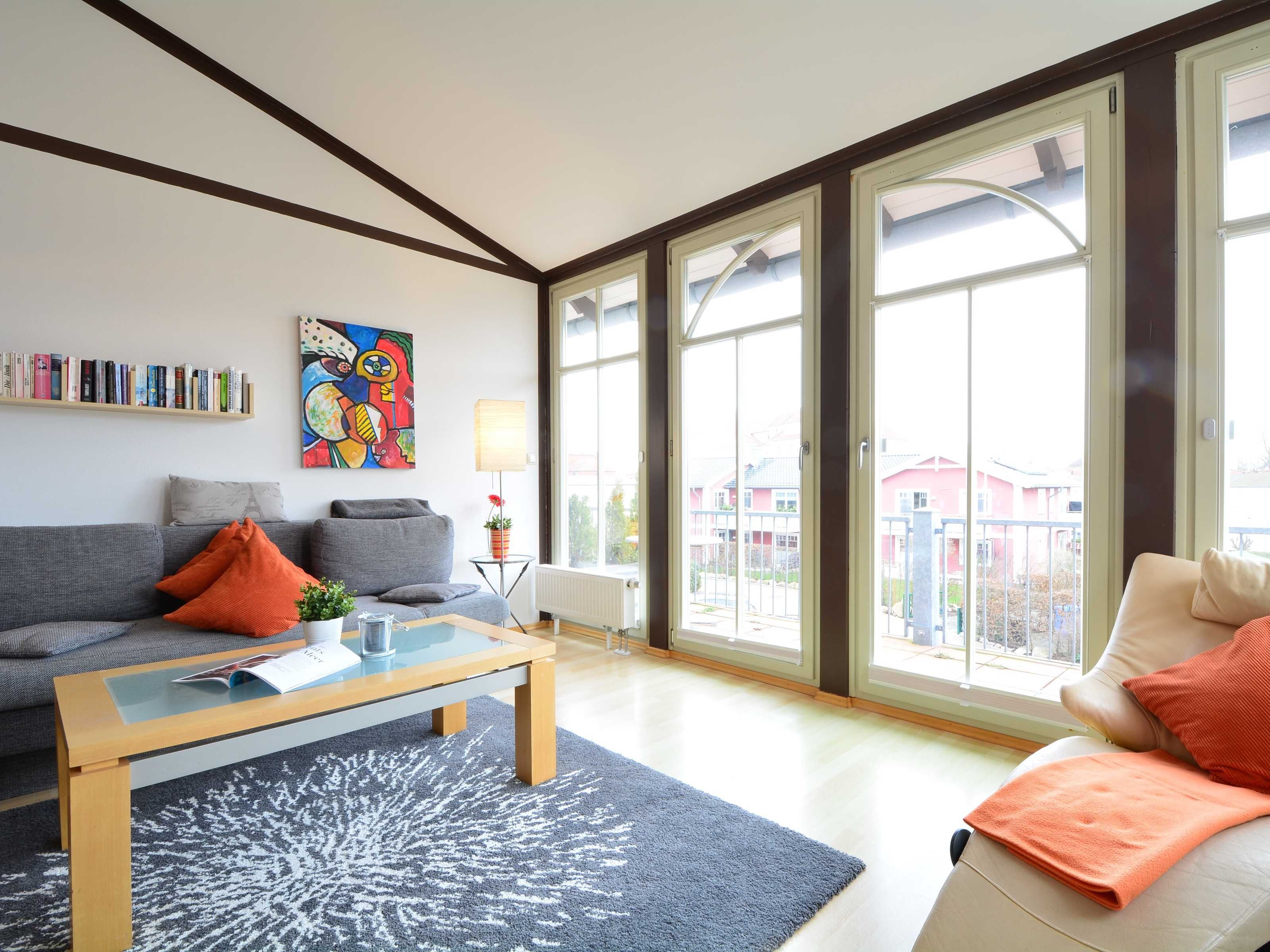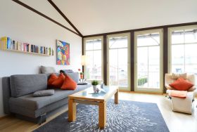 Der offene Wohnraum ist hell und freundlich gestaltet und lädt mit vielen bunten Bildern und einer kleinen Auswahl an Büchern sofort zum Wohlfühlen ein. Die gemütliche Schlafcouch lässt sich mit wenigen Handgriffen in einen bequemen Schlafplatz für eine dritte Person verwandeln. Der neue 42-Zoll-Flachbildfernseher sorgt gemeinsam mit dem integrierten Radio für entspannte Abende. Der angrenzende Essbereich bietet ausreichend Platz für gemeinsame Mahlzeiten. Vom Wohnzimmer gelangen Sie direkt auf den sonnigen Ostbalkon, auf dem Sie den Tagesbeginn oder erholsame Stunden im Freien genießen können.